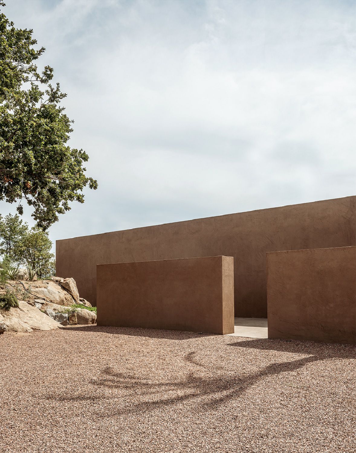 La casa si articola in modo graduale verso il mare, aprendo sempre più spazi e moltiplicando gli affacci. Avvicinandosi alla casa dal lato nord-ovest, il suo aspetto è piuttosto chiuso, sigillato da una spessa muratura che mitiga il passaggio delle giornate calde e delle notti fresche. All’interno un patio d'ingresso conduce alla zona giorno principale, alla cucina, al soggiorno ed infine alla zona notte. Tornando all’esterno, i dintorni di Villa RA si sviluppano attorno a massi granitici e agli alberi di quercia, a cui si aggiungono una macchia di piante autoctone, rosmarino, erba selvatica e fico d’India.