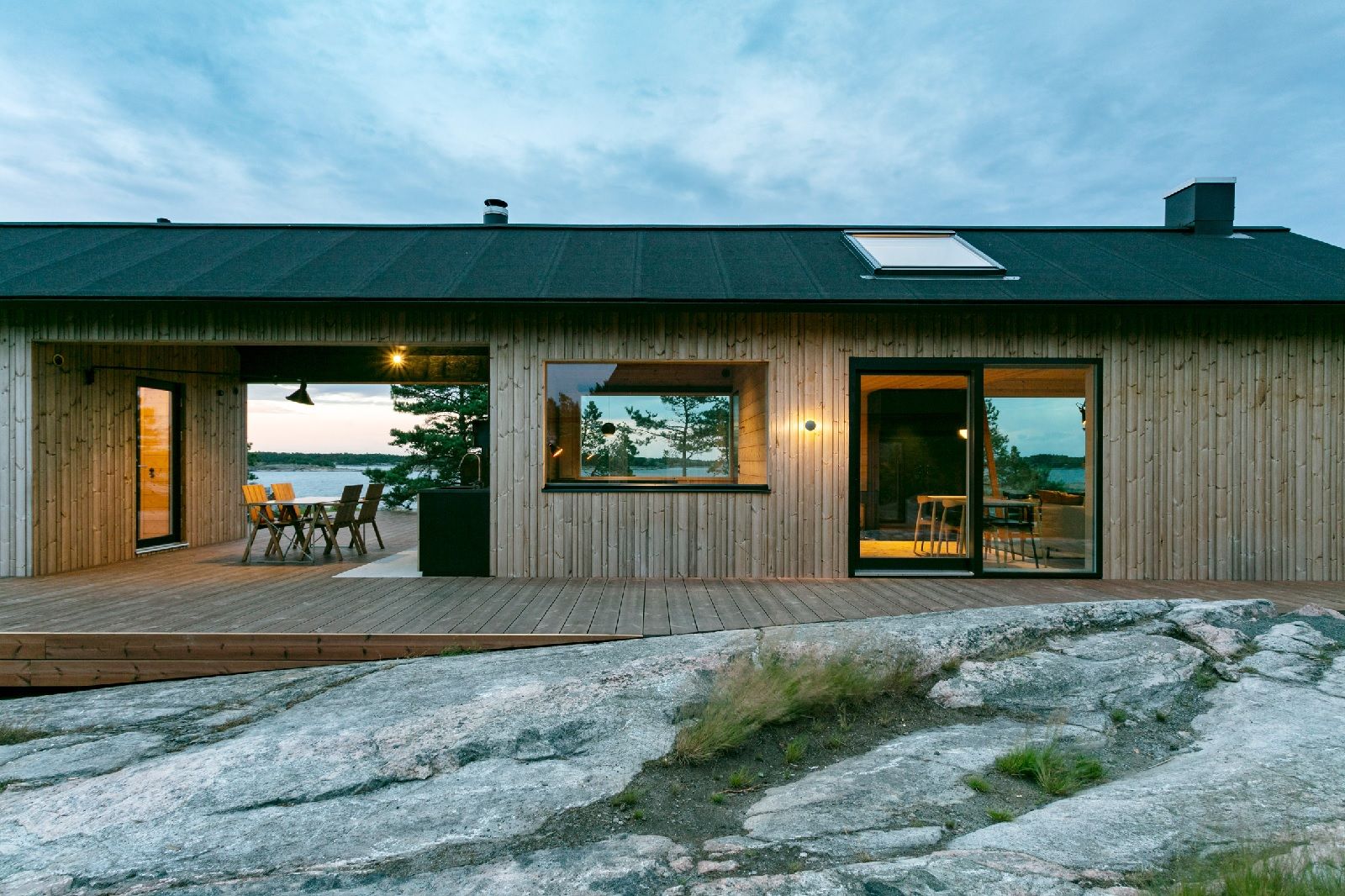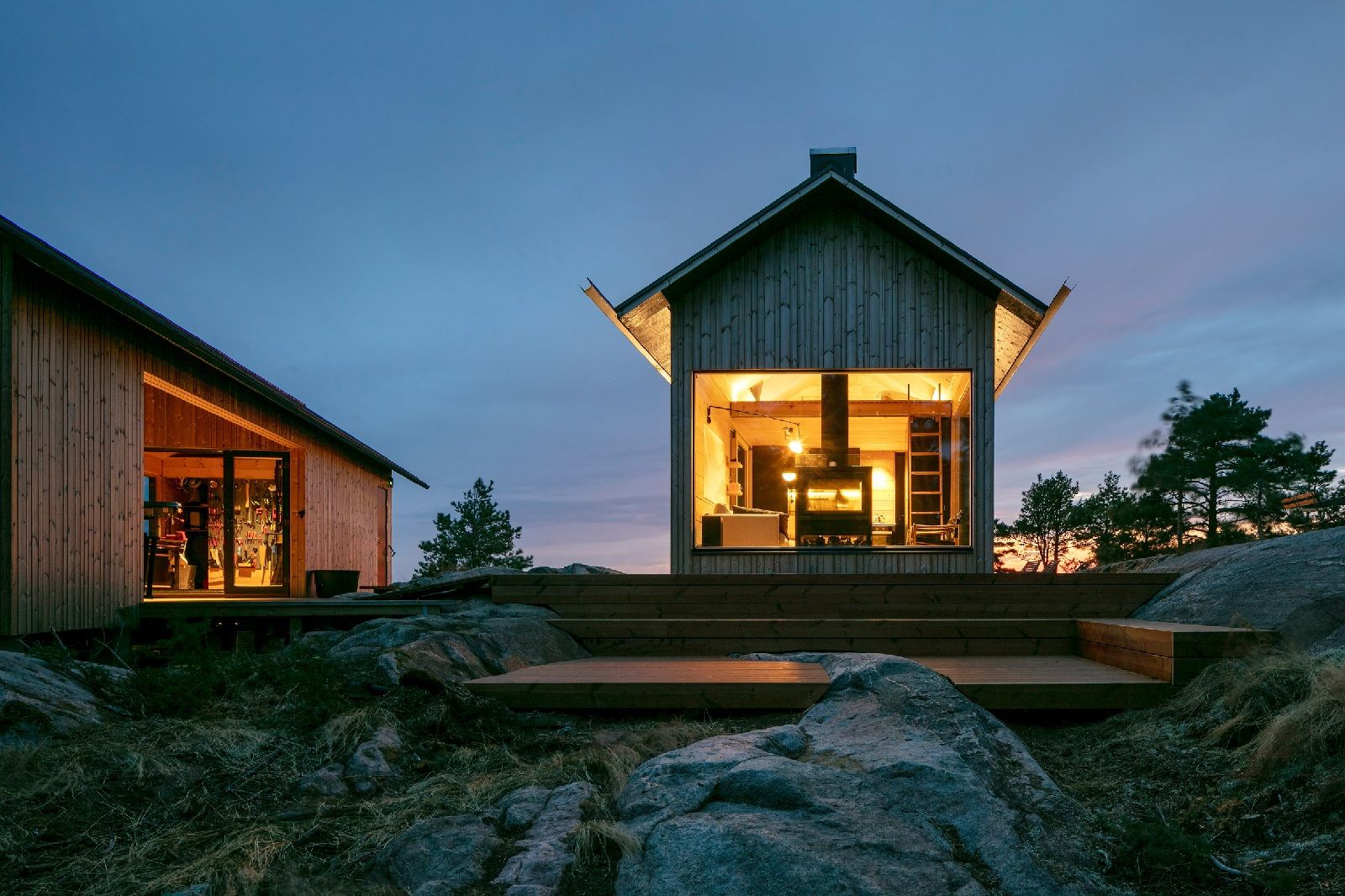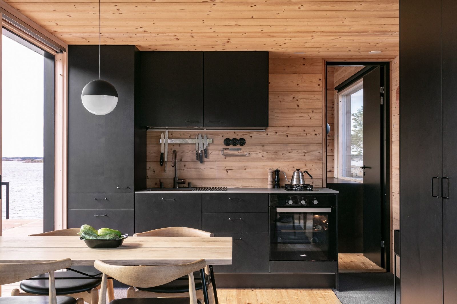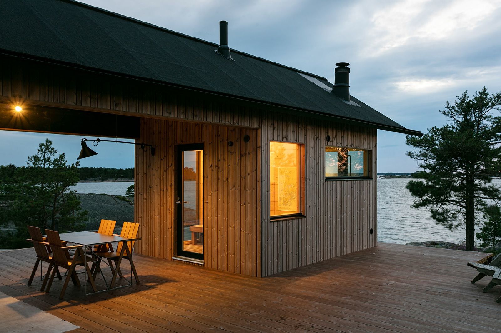 Project Ö è un piccolo complesso di 70m² totali composto da due cabine principali, un'officina e una sauna posizionate in cima a una terrazza di legno e caratterizzate da uno spazio esterno coperto che separa le camere da letto dalla zona giorno. Una scelta di design che, spiega la coppia, “rende omaggio all'estetica tradizionale dell'arcipelago finlandese" e "consente di avere ampie superfici vetrate con viste variabili”, ideali per ammirare i bellissimi tramonti che si riflettono sul mare. I due designer raccontano che le cabine del Project Ö possono ospitare un massimo di 10 persone: