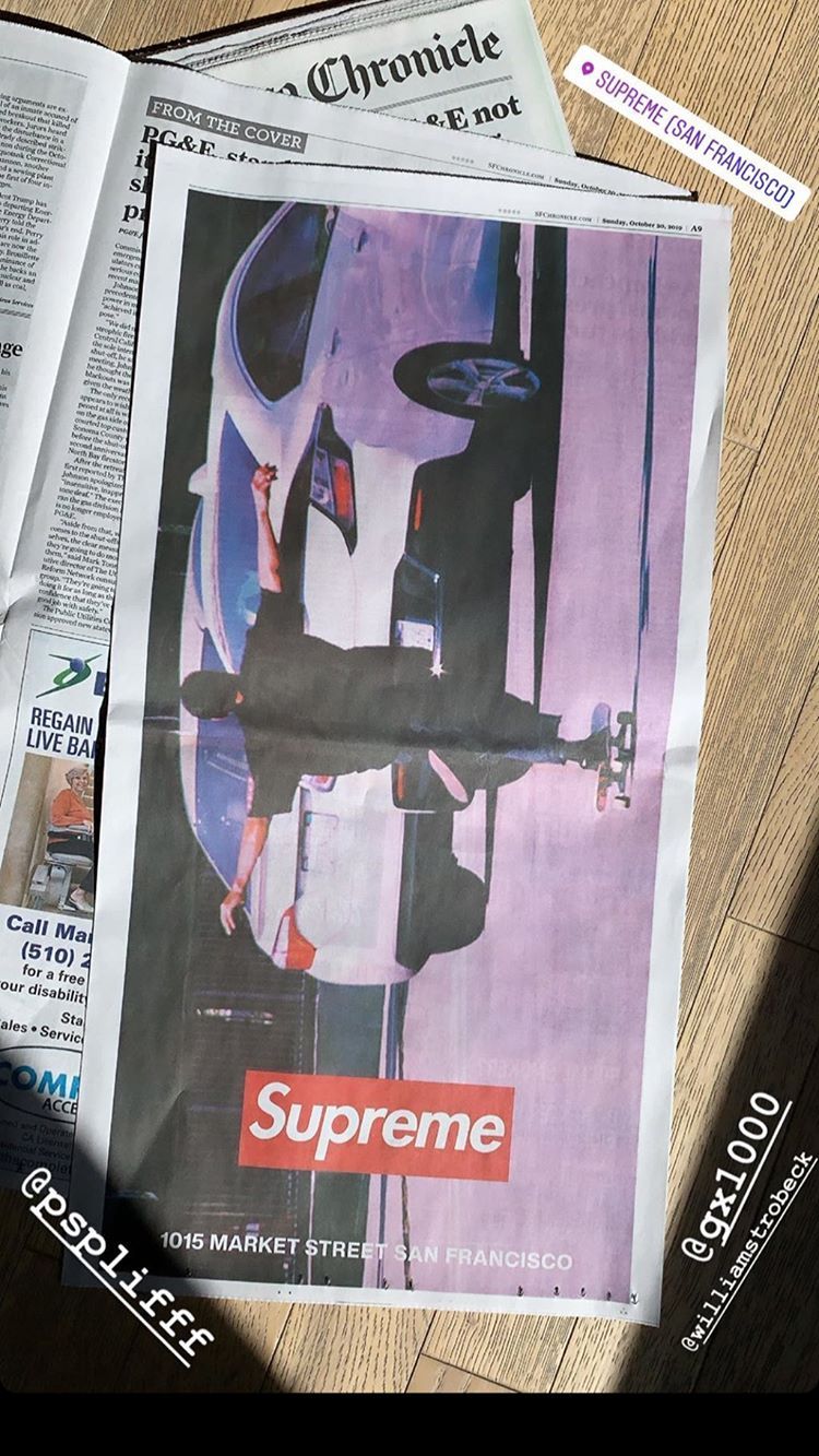 Supreme ha anche comprato una pagina intera del giornale San Francisco Chronicle pubblicando una foto di Pablo Ramirez - un membro del team di San Francisco GX1000 scomparso nell'aprile di quest'anno - e l'indirizzo del negozio, 1015 Market Street in piena downtown a pochi isolati dalla sede di Twitter.