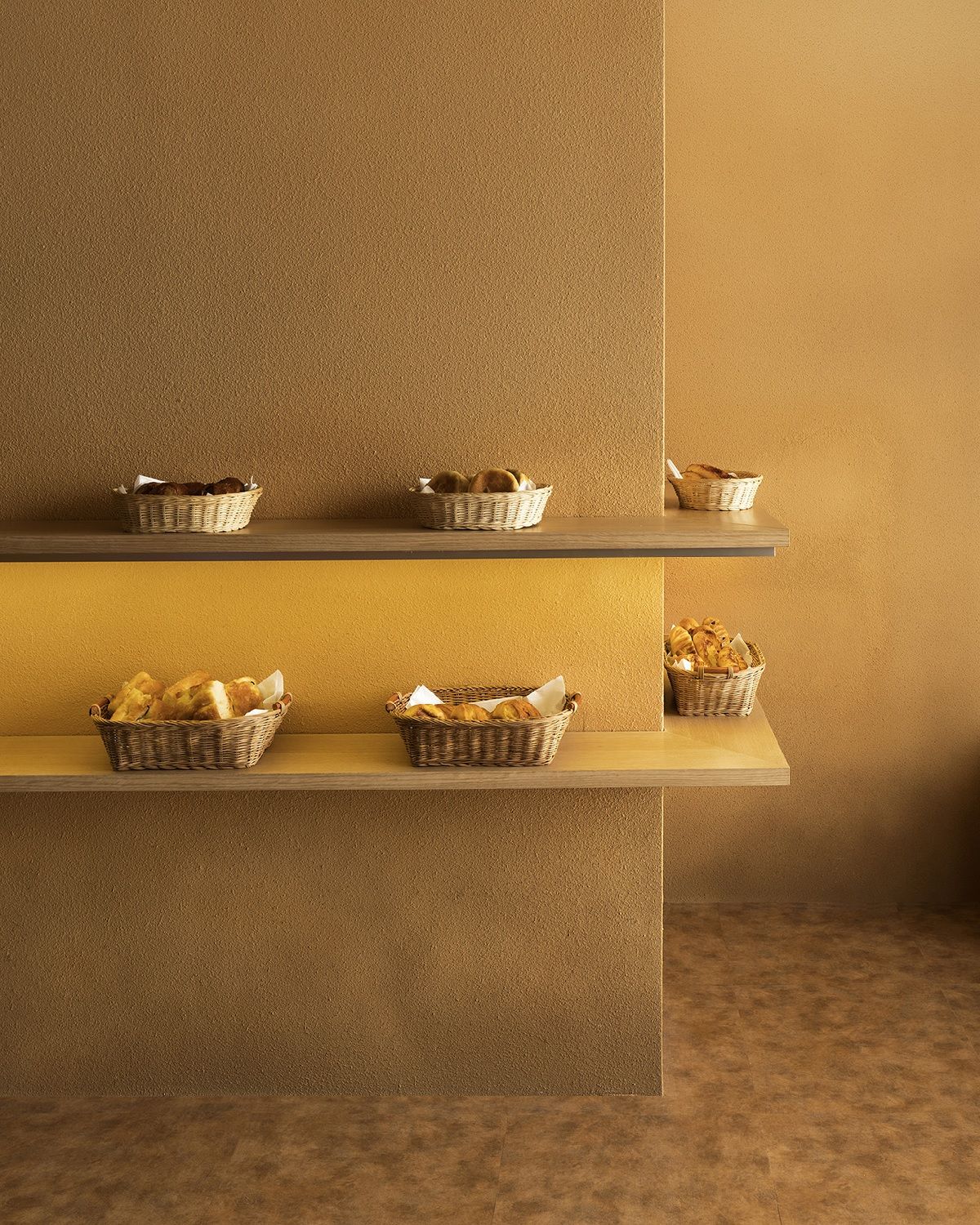 Il tono ocra della parete, spezzato solo da una grande porta a vetro scorrevole, si fonde con il profumo del pane che riempie l’aria. All’interno la stessa sfumatura dorata, enfatizzata da un’illuminazione soffusa, crea un minimalismo caldo e avvolgente che ricorda un po’ lo stile di Muji. Tutto è ordinato, semplice: i vari prodotti sono disposti dentro a cestini di vimini e poi adagiati su lunghi scaffali in legno, lo stesso materiale scelto anche per i pavimenti.