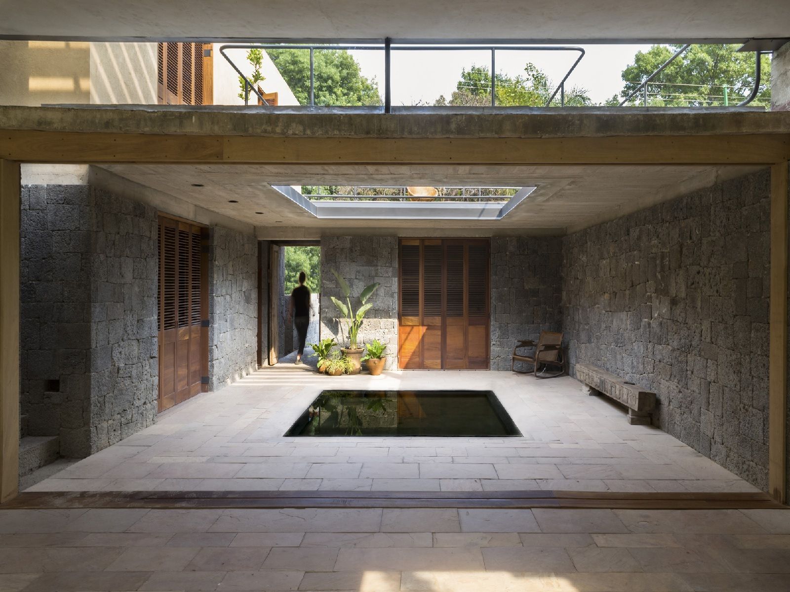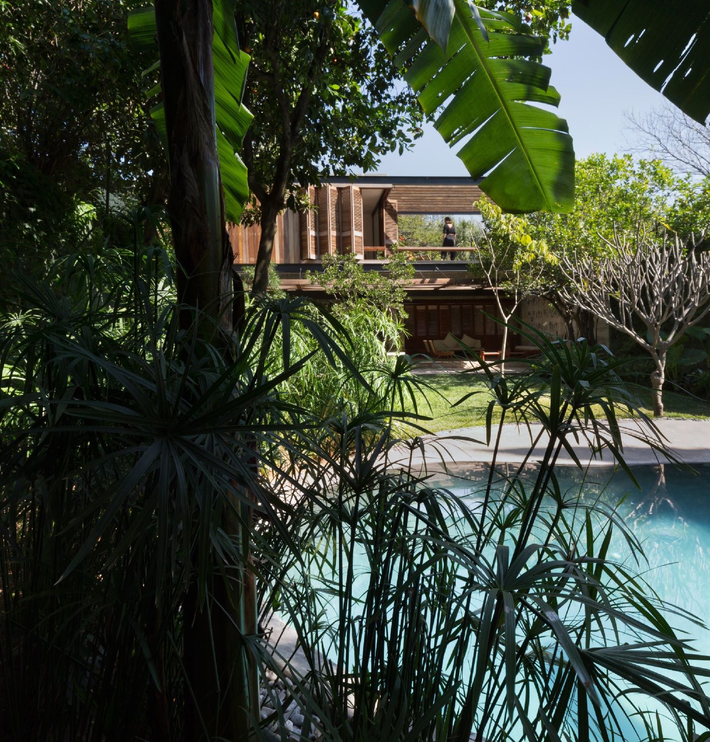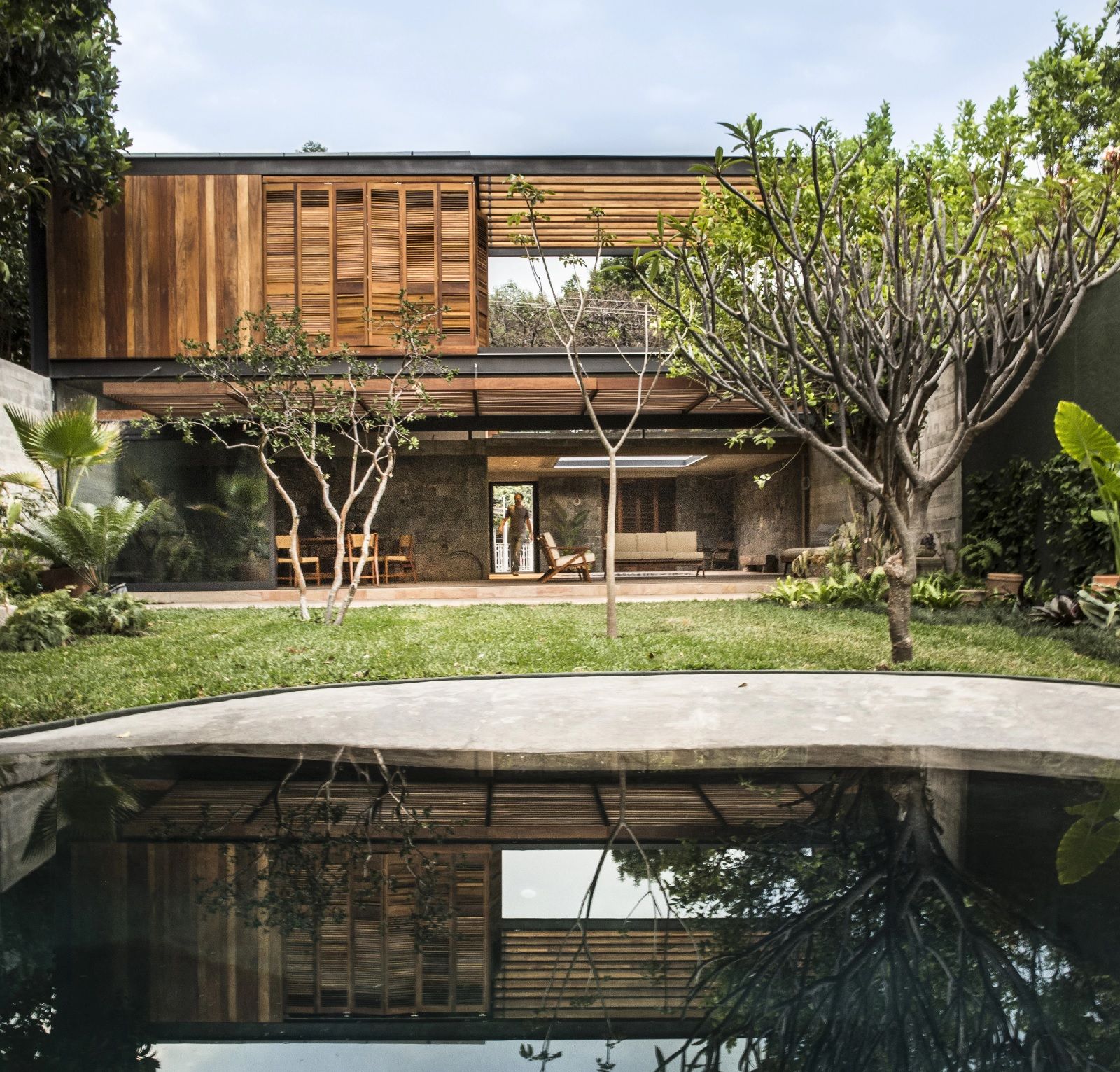 Le superfici rivestite in pietra, le piante che si estendono su un appezzamento di 460 metri quadrati, e l’acqua che ha un ruolo centrale nel progetto delimitano, come in un chiostro, il patio, i percorsi e le stanze. Accanto al cortile si trovano l'alloggio della cameriera, una camera da letto ed uno spazio riservato agli ospiti; mentre al di là di uno stagno poco profondo, ci sono una cucina, un tavolo da pranzo e una piccola zona salotto. Il piano superiore è occupato da tre camere da letto, ognuna con il proprio bagno privato, ma anche da un’ampia terrazza che si affaccia sull’ingresso sottostante.