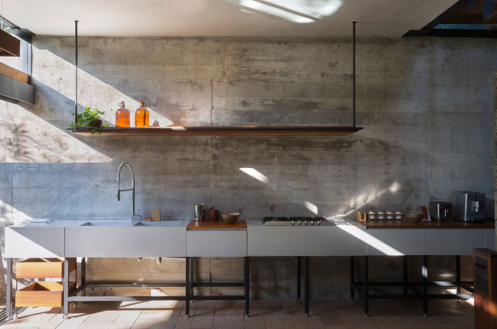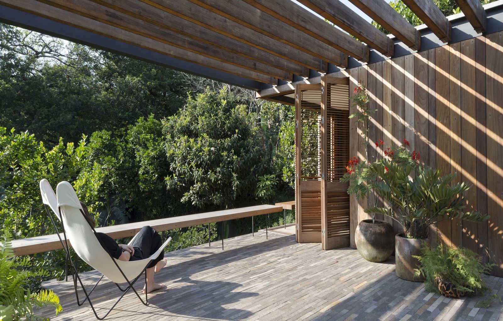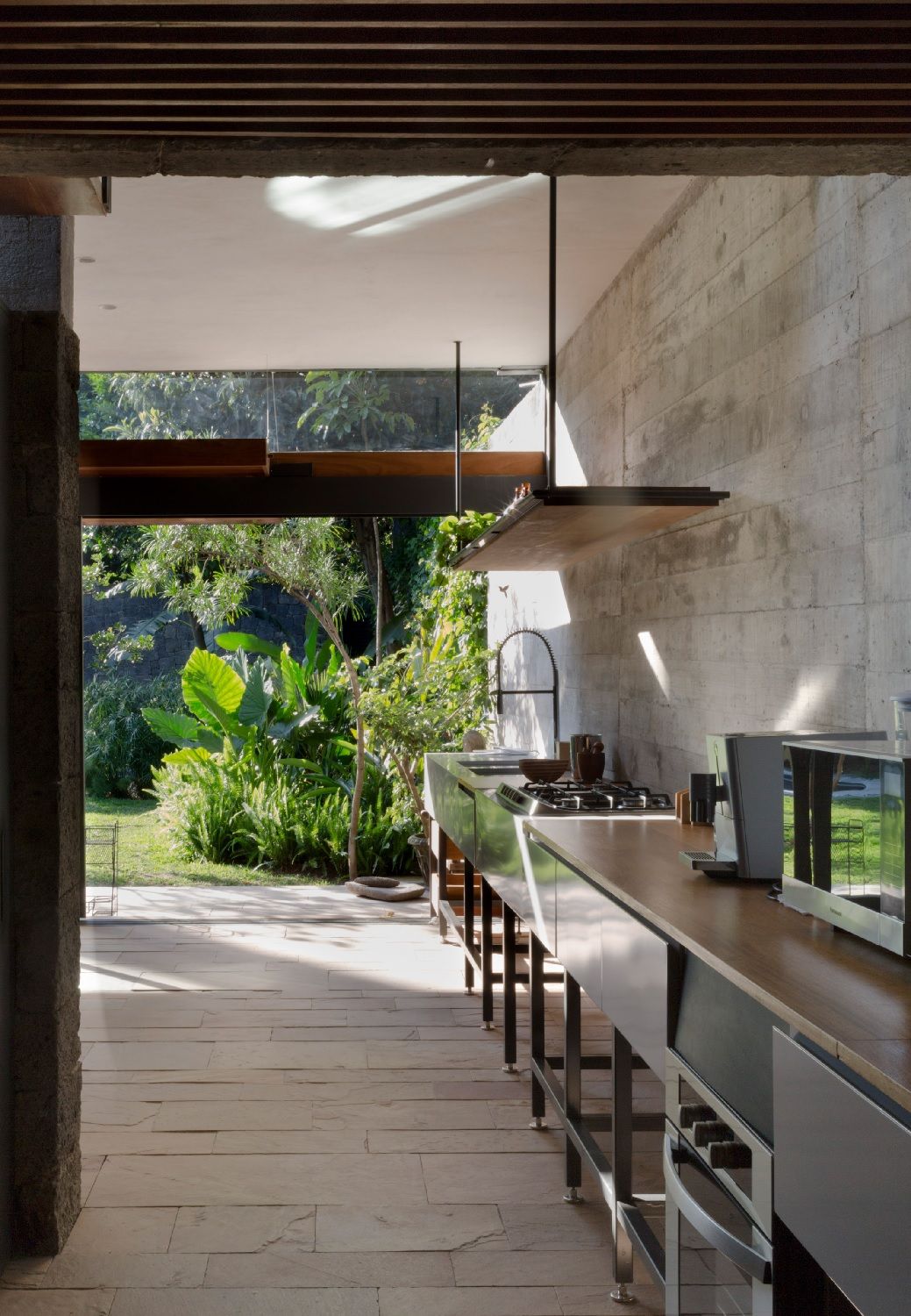 Le superfici rivestite in pietra, le piante che si estendono su un appezzamento di 460 metri quadrati, e l’acqua che ha un ruolo centrale nel progetto delimitano, come in un chiostro, il patio, i percorsi e le stanze. Accanto al cortile si trovano l'alloggio della cameriera, una camera da letto ed uno spazio riservato agli ospiti; mentre al di là di uno stagno poco profondo, ci sono una cucina, un tavolo da pranzo e una piccola zona salotto. Il piano superiore è occupato da tre camere da letto, ognuna con il proprio bagno privato, ma anche da un’ampia terrazza che si affaccia sull’ingresso sottostante.
