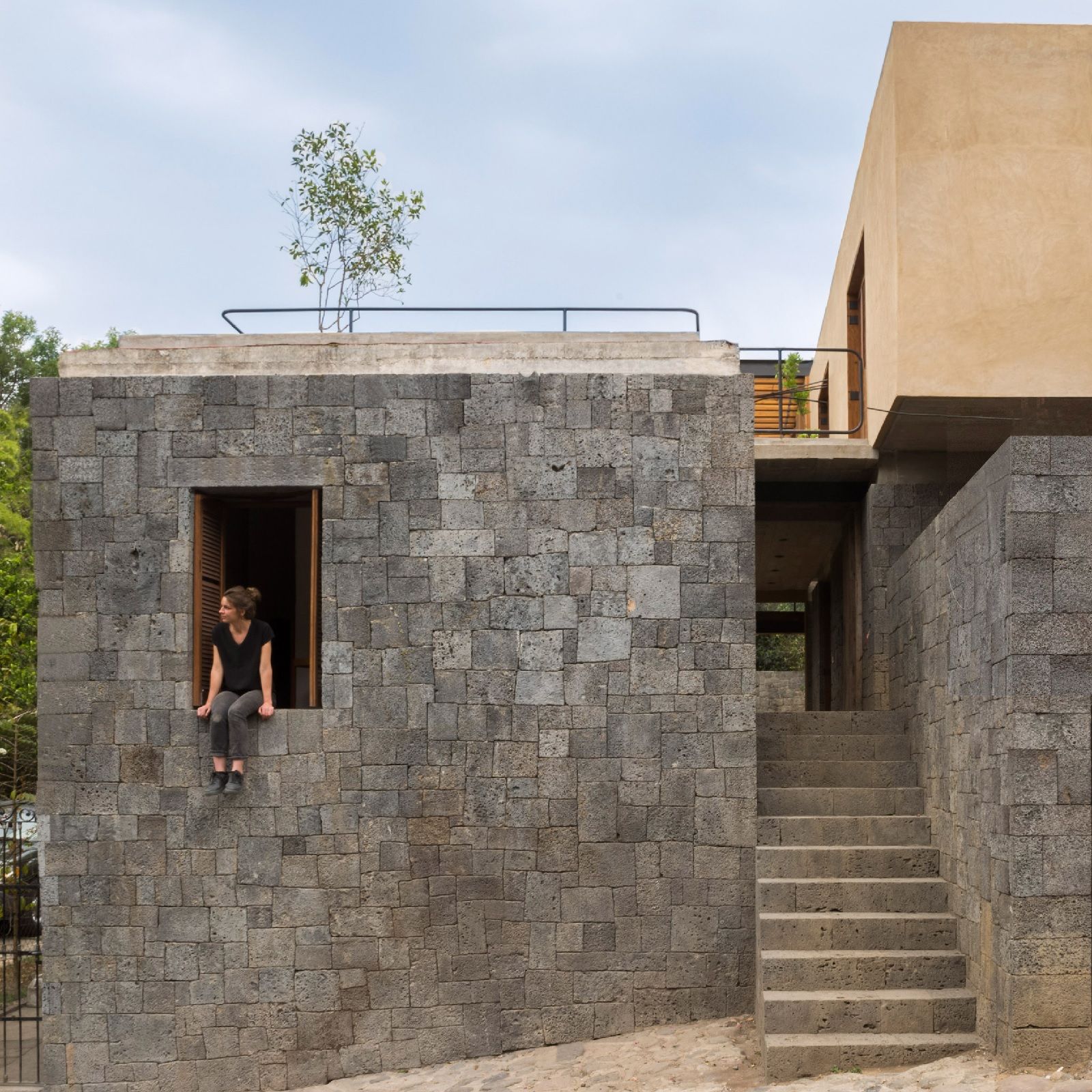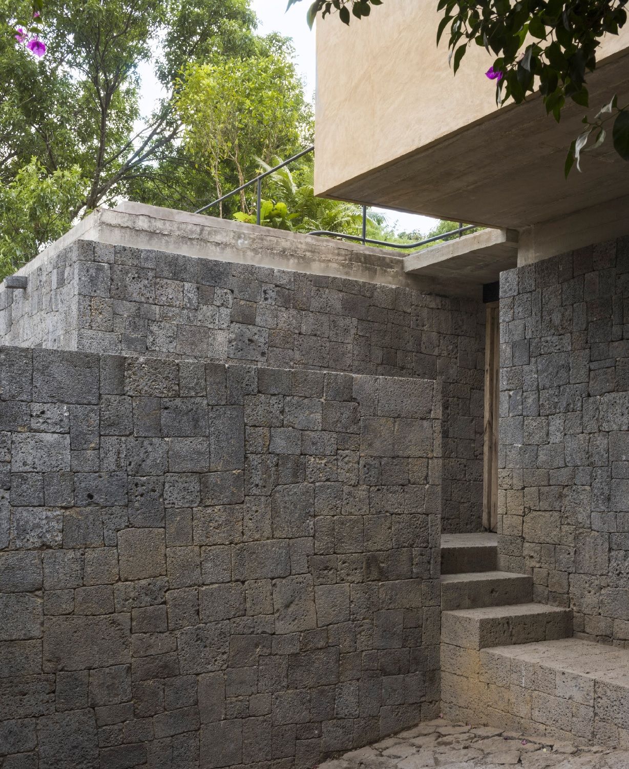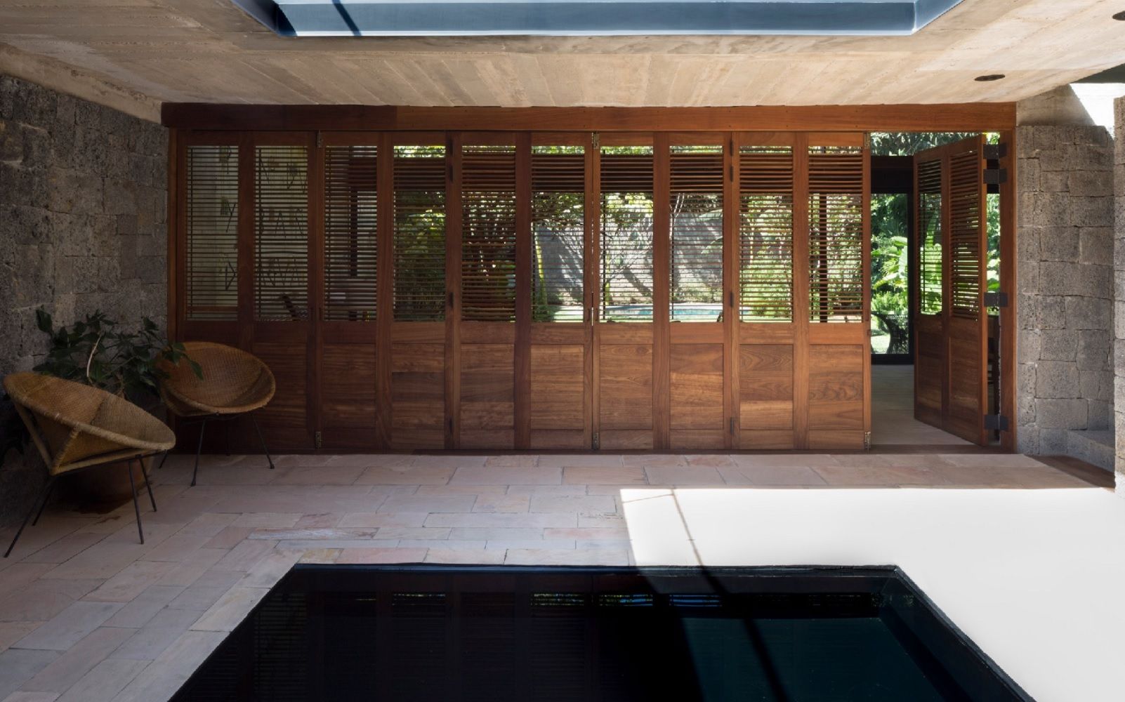 "La casa si intreccia tra interno ed esterno fino alla terrazza e al grande giardino aperto" – spiegano gli architetti - "L'accesso alla casa avviene attraverso una stretta scalinata in pietra. Oltre l'ingresso, un cortile parzialmente coperto con al centro una piscina crea uno spazio di relax all'ombra."