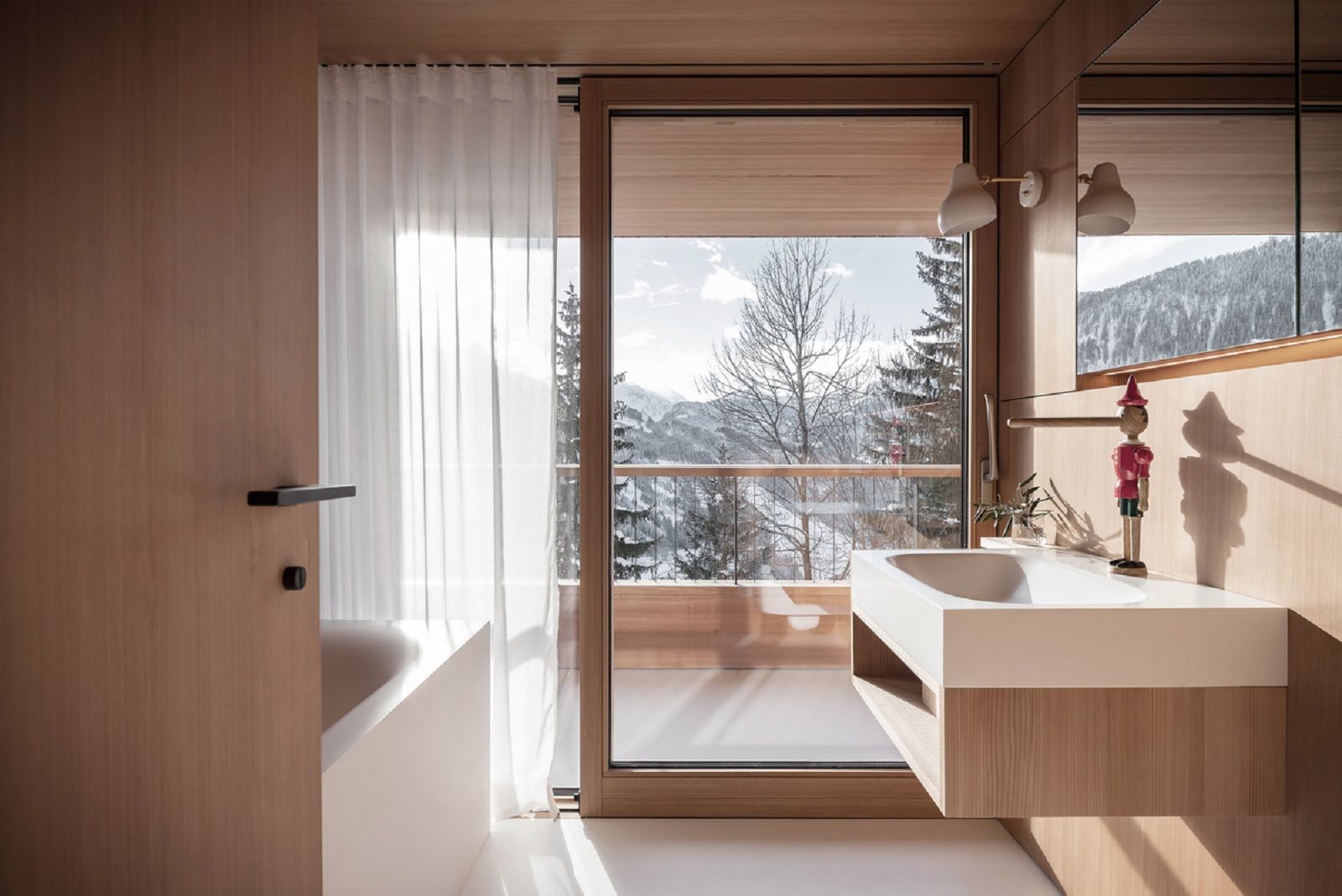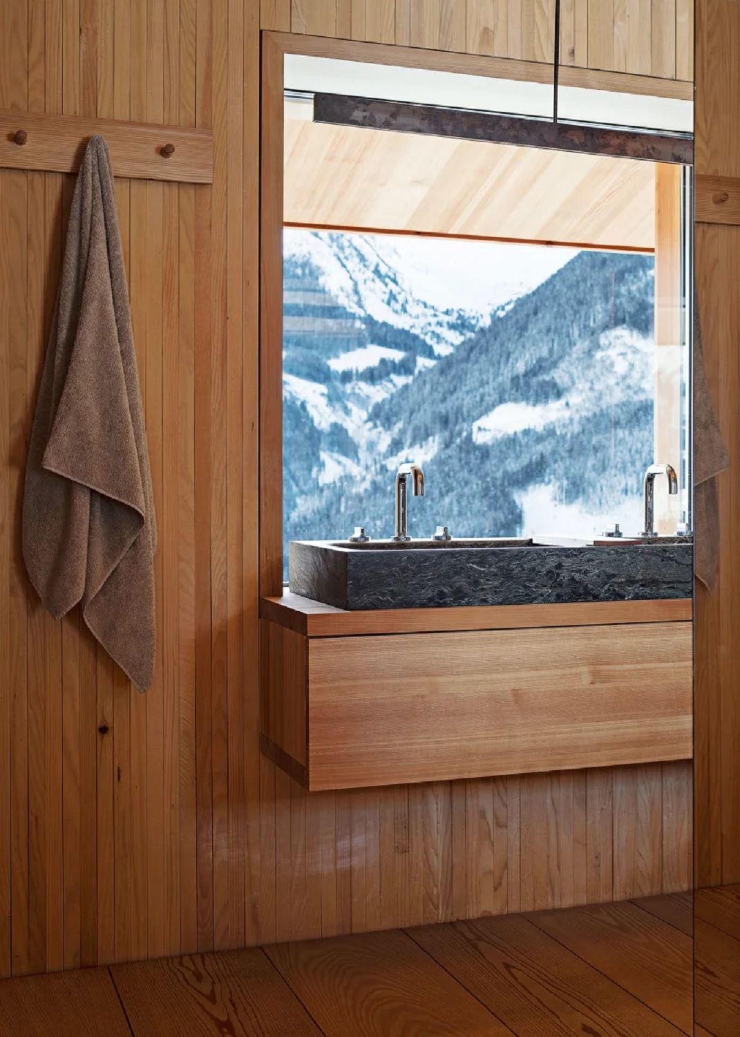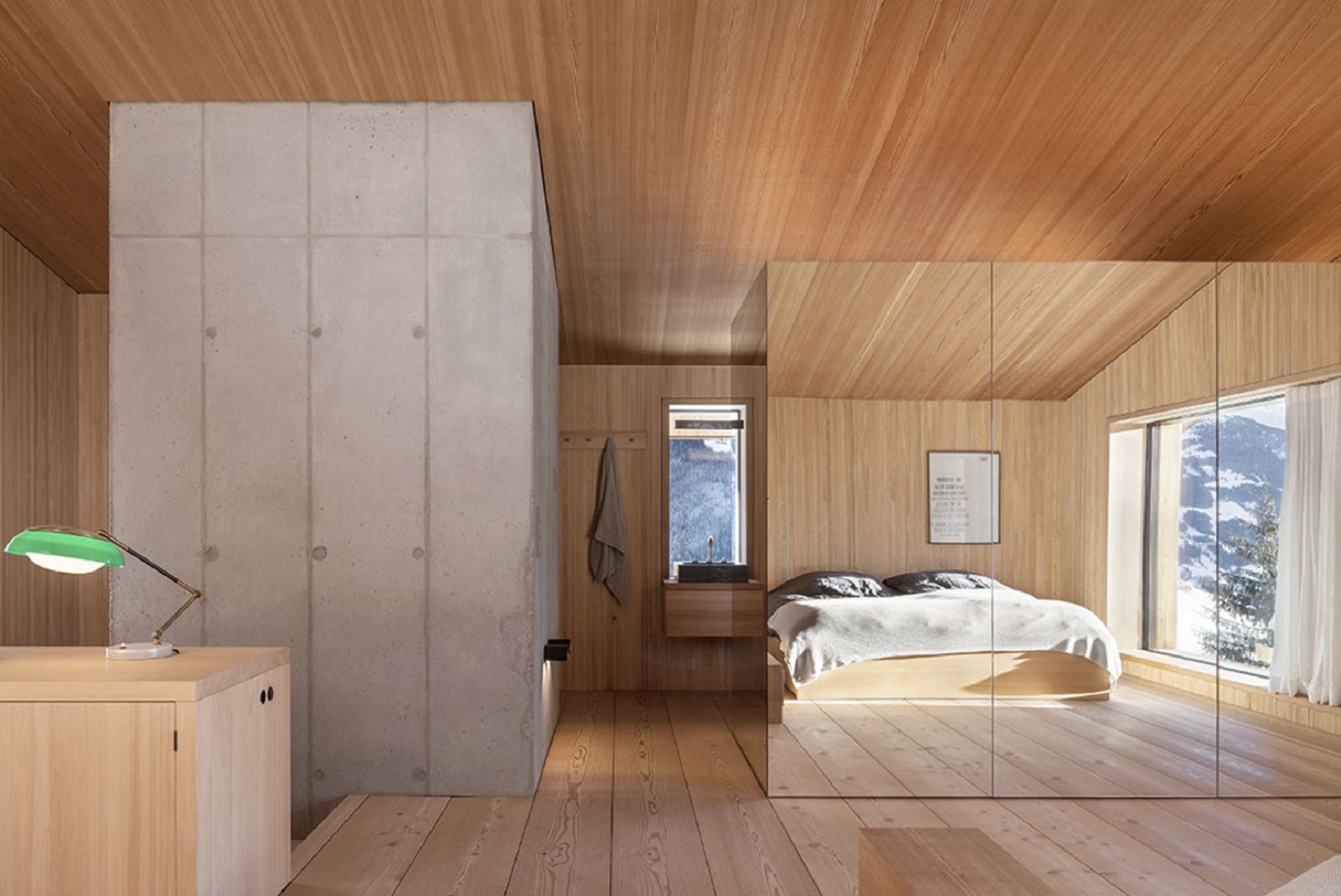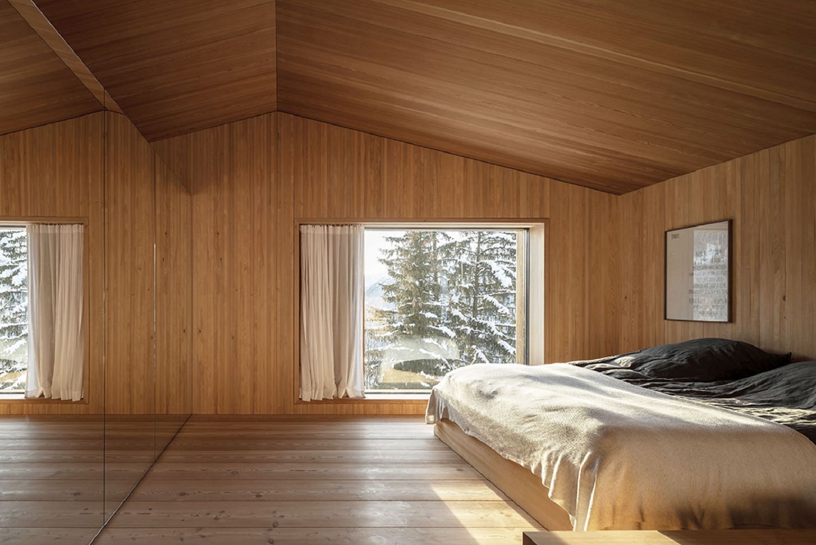 I tre piani inferiori sono scavati nel pendio stesso della montagna e costituiscono la base di cemento che funge da elemento portante per la struttura in legno. All’interno di questa parte dello chalet si trovano il garage,raggiungibile dall’esterno attraverso un vialetto carrabile tagliato nella montagna; una sala biliardo; una cantina e una suite per gli ospiti che comprende cucina, soggiorno, camera da letto, bagno, sauna e una terrazza per godere del paesaggio. Una scala a chiocciola conduce alla zona giorno principale che si estende attraverso il piano terra, quello superiore e la mansarda. Il soggiorno si sviluppa attorno ad un caminetto incorporato nel nucleo di cemento della casa e ospita angolo cottura e zona lounge; mentre nel piano mansardato una scatola a specchio separa le camere da letto, l'ufficio e la biblioteca dalla zona spa con doccia a vapore. Balconi incassati offrono una vista in tutte le direzioni sulle montagne. Arredati con mobili moderni, gli interni sono caratterizzati, come il resto della casa, da pavimento e pareti in legno chiaro, materiale spezzato da un particolare mix cemento, alluminio e pietra naturale.
