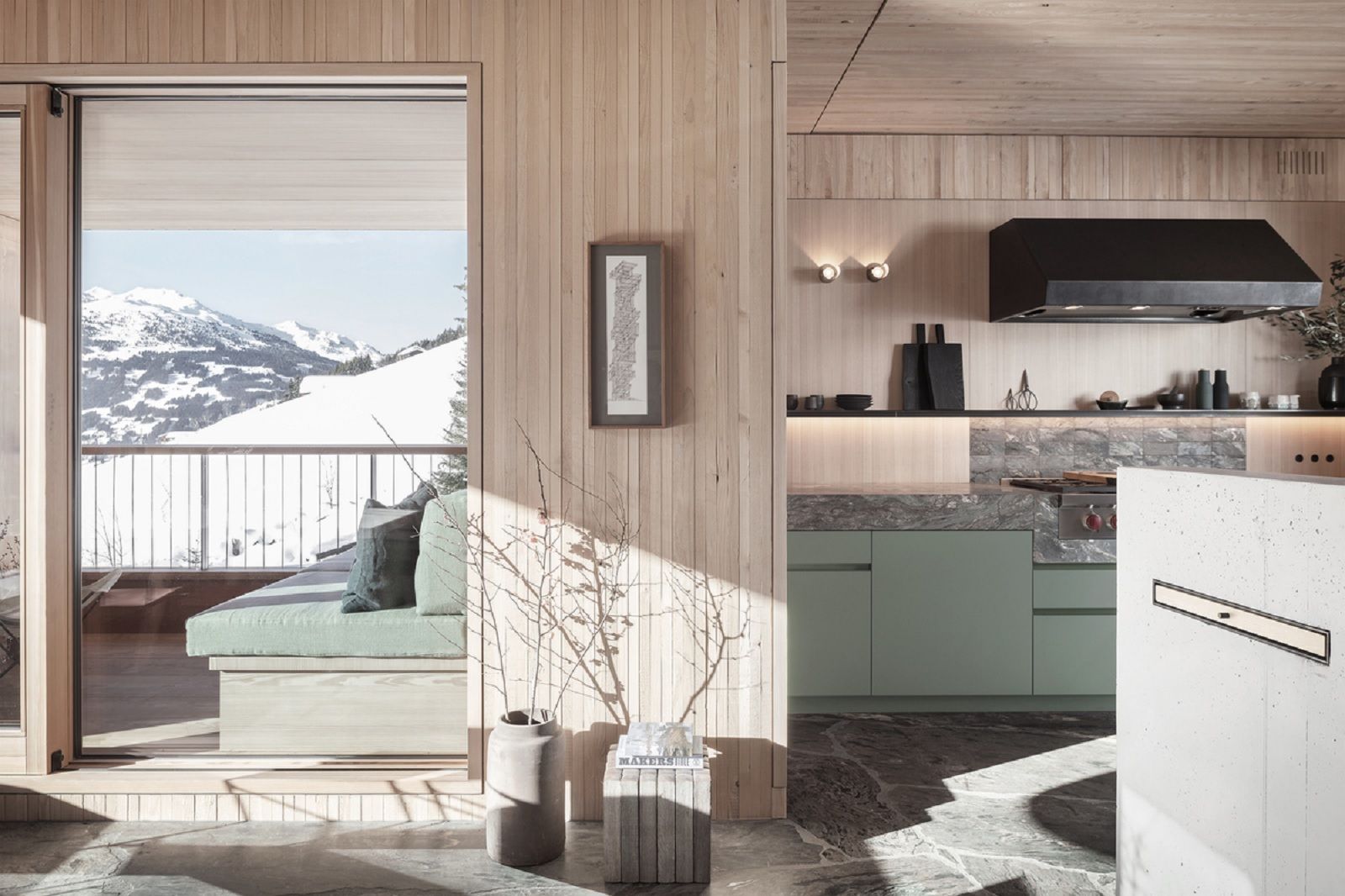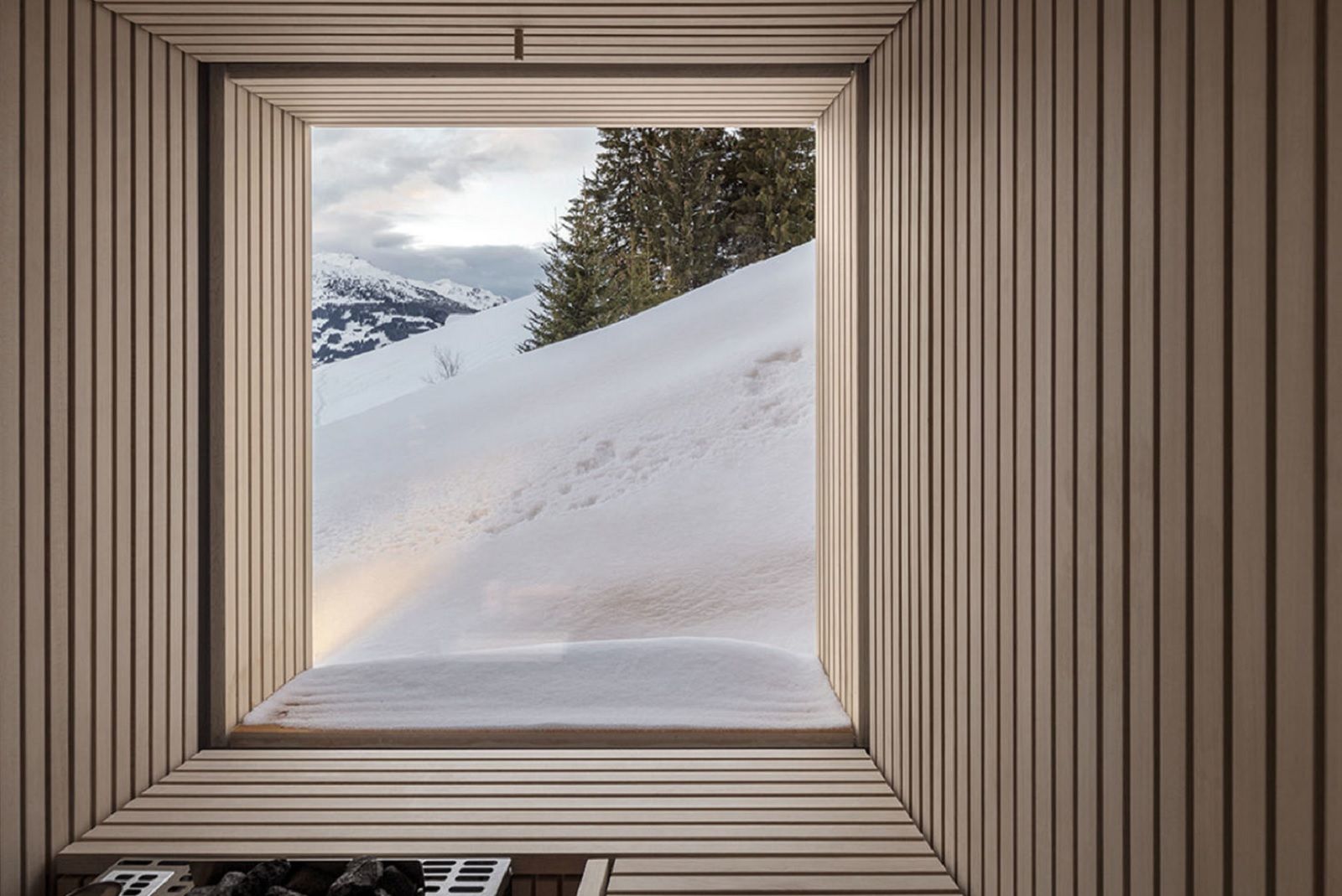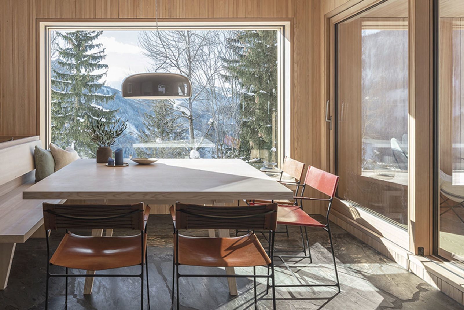 I tre piani inferiori sono scavati nel pendio stesso della montagna e costituiscono la base di cemento che funge da elemento portante per la struttura in legno. All’interno di questa parte dello chalet si trovano il garage,raggiungibile dall’esterno attraverso un vialetto carrabile tagliato nella montagna; una sala biliardo; una cantina e una suite per gli ospiti che comprende cucina, soggiorno, camera da letto, bagno, sauna e una terrazza per godere del paesaggio. Una scala a chiocciola conduce alla zona giorno principale che si estende attraverso il piano terra, quello superiore e la mansarda. Il soggiorno si sviluppa attorno ad un caminetto incorporato nel nucleo di cemento della casa e ospita angolo cottura e zona lounge; mentre nel piano mansardato una scatola a specchio separa le camere da letto, l'ufficio e la biblioteca dalla zona spa con doccia a vapore. Balconi incassati offrono una vista in tutte le direzioni sulle montagne. Arredati con mobili moderni, gli interni sono caratterizzati, come il resto della casa, da pavimento e pareti in legno chiaro, materiale spezzato da un particolare mix cemento, alluminio e pietra naturale.