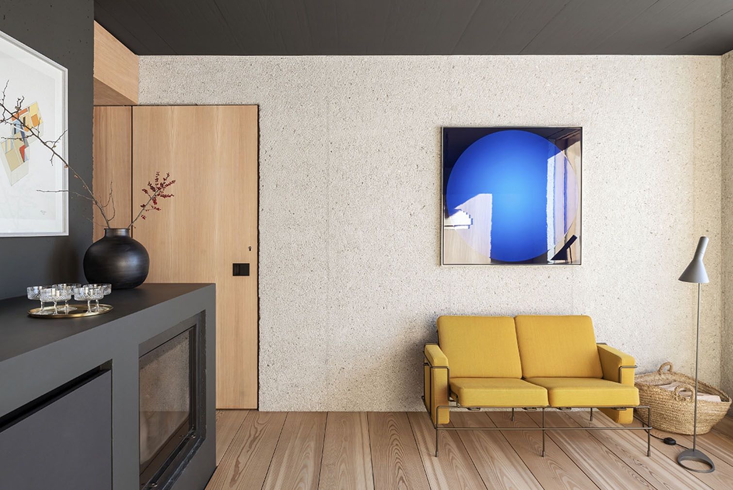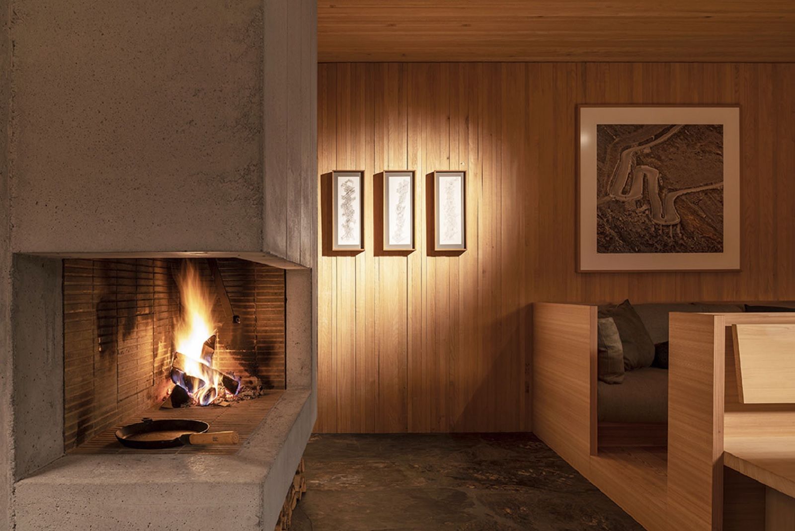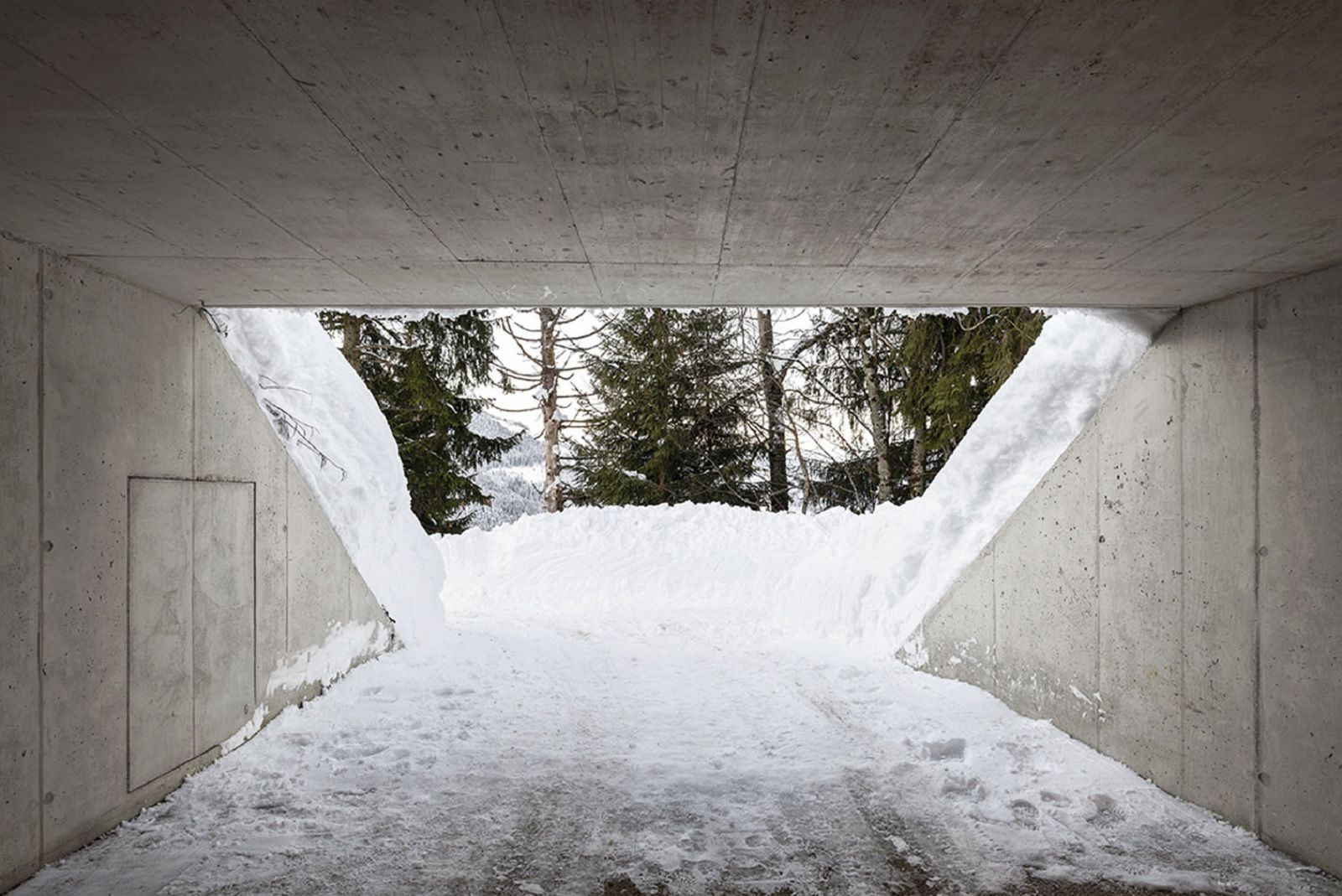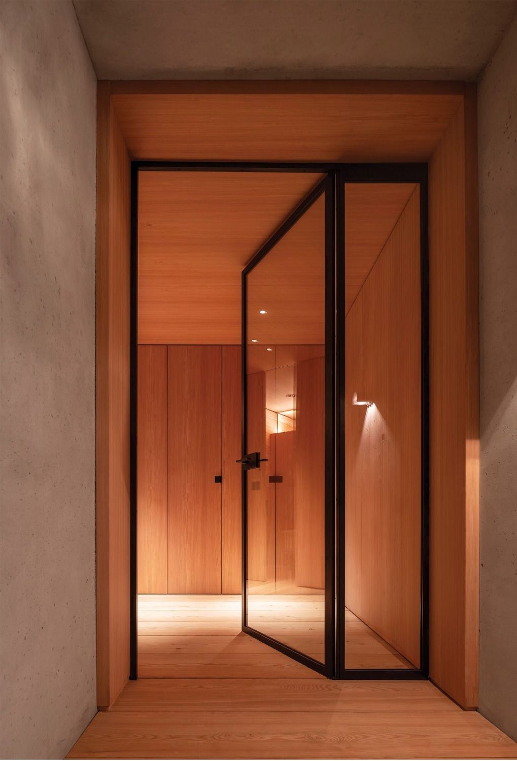 I tre piani inferiori sono scavati nel pendio stesso della montagna e costituiscono la base di cemento che funge da elemento portante per la struttura in legno. All’interno di questa parte dello chalet si trovano il garage,raggiungibile dall’esterno attraverso un vialetto carrabile tagliato nella montagna; una sala biliardo; una cantina e una suite per gli ospiti che comprende cucina, soggiorno, camera da letto, bagno, sauna e una terrazza per godere del paesaggio. Una scala a chiocciola conduce alla zona giorno principale che si estende attraverso il piano terra, quello superiore e la mansarda. Il soggiorno si sviluppa attorno ad un caminetto incorporato nel nucleo di cemento della casa e ospita angolo cottura e zona lounge; mentre nel piano mansardato una scatola a specchio separa le camere da letto, l'ufficio e la biblioteca dalla zona spa con doccia a vapore. Balconi incassati offrono una vista in tutte le direzioni sulle montagne. Arredati con mobili moderni, gli interni sono caratterizzati, come il resto della casa, da pavimento e pareti in legno chiaro, materiale spezzato da un particolare mix cemento, alluminio e pietra naturale.