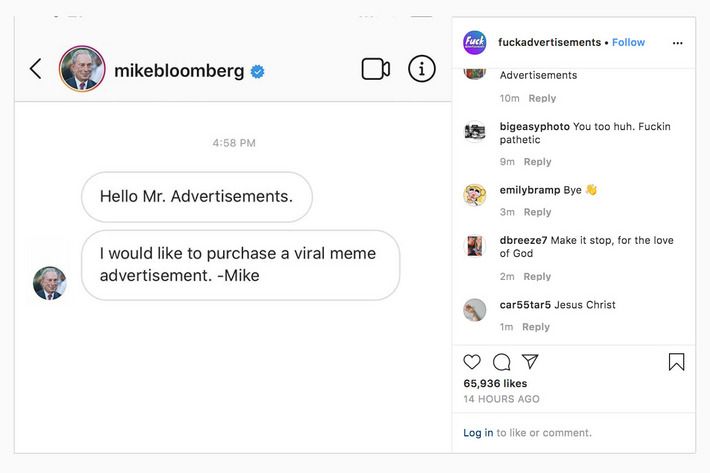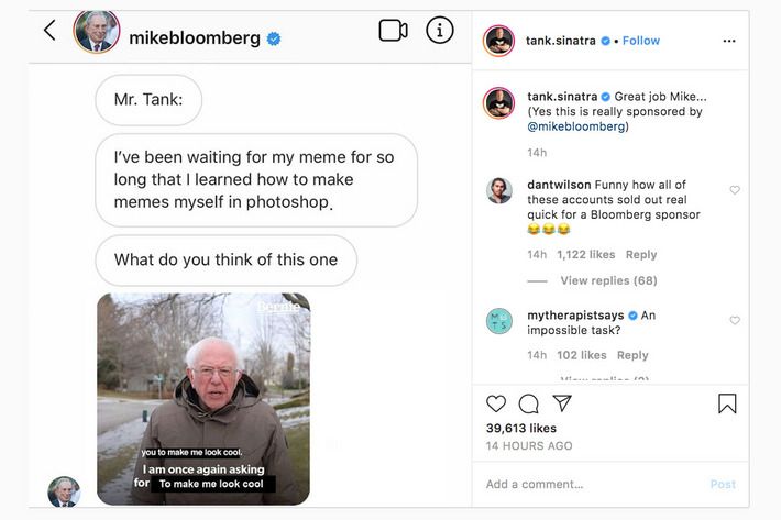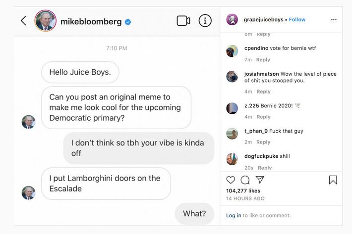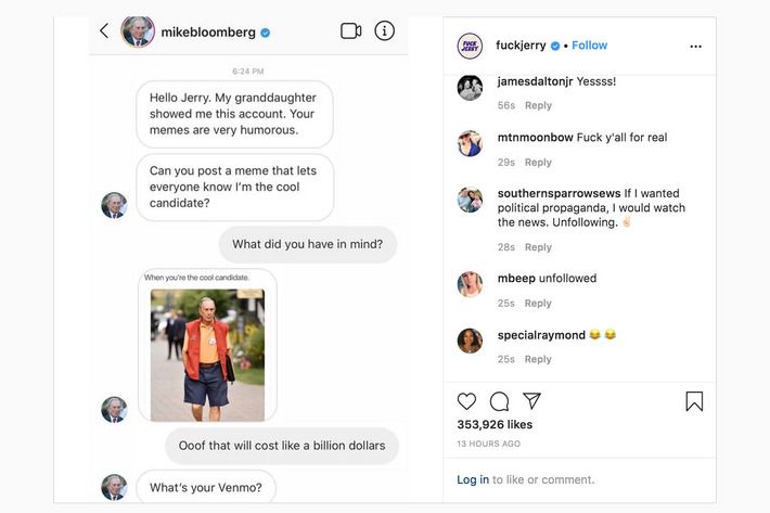 Michael Bloomberg, 78 anni, tre volte sindaco di New York e nono uomo più ricco del mondo, ha infatti assoldato un esercito social per promuovere la sua immagine fra gli elettori più giovani. Account come @GrapeJuiceBoys, @Tank.Sinatra e @fuckjerry hanno organizzato un “drop” collettivo e sincronizzato nella notte del 12 febbraio con tanto di hashtag per contenuti a pagamento, tag all’account di Bloomberg e un esercito di influencers a riempire la sezione commenti per far gonfiare l’engagement alla massima potenza. Le pagine di meme che hanno ricevuto richieste di paid contents possiedono collettivamente oltre sessanta milioni di followers, senza contare i micro-influencers reclutati attraverso Tribe. Per contrasto, l’NBA All-Star Game viene guardato da sette milioni di persone, gli Oscar da trentasette milioni e l’episodio finale di Game of Thrones da diciannove milioni.
