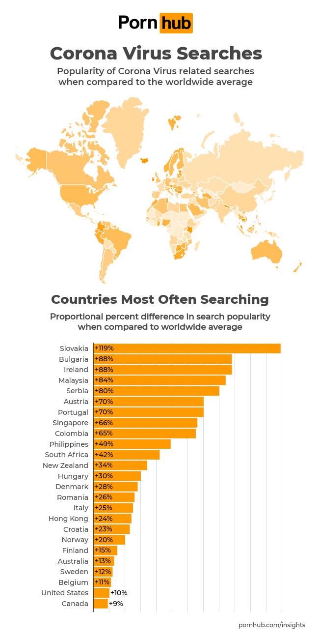 Insieme all'incremento delle visite, le statistiche di Pornhub hanno registrato un altro dato per così dire "caratteristico": gli utenti di tutto il mondo hanno iniziato a cercare sempre di più video con la parola "Coronavirus" e "Corona Virus". Ebbene sì: gli utenti di Pornhub cercano video a tema COVID19. Dal 25 gennaio (il giorno in cui la ricerca "Coronavirus" è apparsa per la prima volta) a oggi, video con i tag "corona" o "covid" hanno superato i 9 milioni di ricerche (per la precisione 9,127,482 milioni). Il primato è tutto europeo ed è detenuto dalla Slovacchia, mentre negli USA da Washington DC.