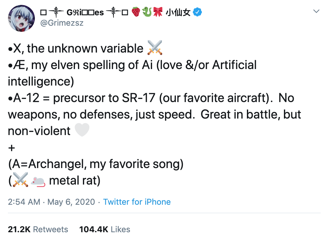 X starebbe per la "variabile incognita" spesso utilizzata proprio in matematica; Æ rappresenterebbe la pronuncia elfica della sigla A.I. (Intelligenza Artificiale); A-12 indicherebbe il precursore di un tipo di aereo militare, l'SR-71 Blackbird (erroneamente indicato nel tweet come SR-17), che a quanto pare è il preferito della coppia perché “Niente armi, niente difese, solo velocità. Forte in battaglia, ma non-violento”; infine, la A indica anche il titolo Archangel, nient'altro che la canzone preferita di Grimes. Stando a questa spiegazione (e alle speculazioni di diversi utenti sul web), la pronuncia del nome dovrebbe essere più o meno: "Ex-Ash-A-Minus-Twelve", o qualcosa del genere.
