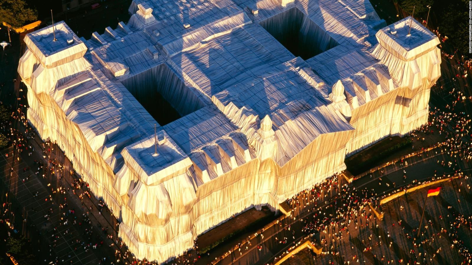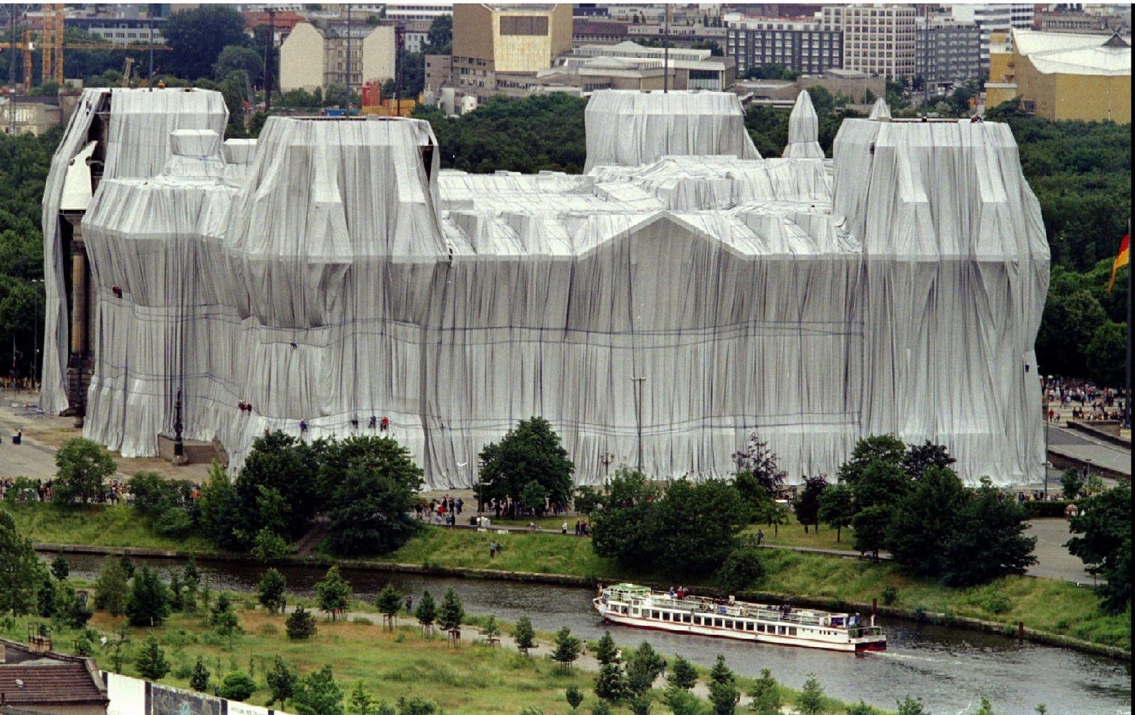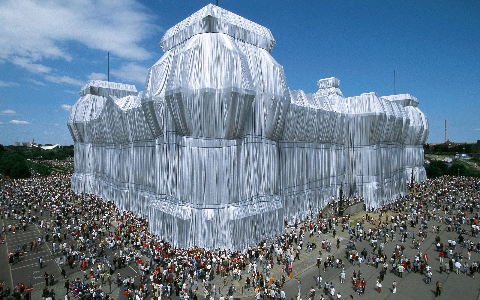 L’imballaggio del Reichstag di Berlino, nel giugno del 1995, è forse l’opera più celebre realizzata dall’artista di origini bulgare. Il parlamento tedesco venne impacchettato con 100mila metri quadri di tessuto argentato. Christo impiegò oltre vent’anni per ottenere il permesso di realizzare quest’opera, che attirò cinque milioni di visitatori.