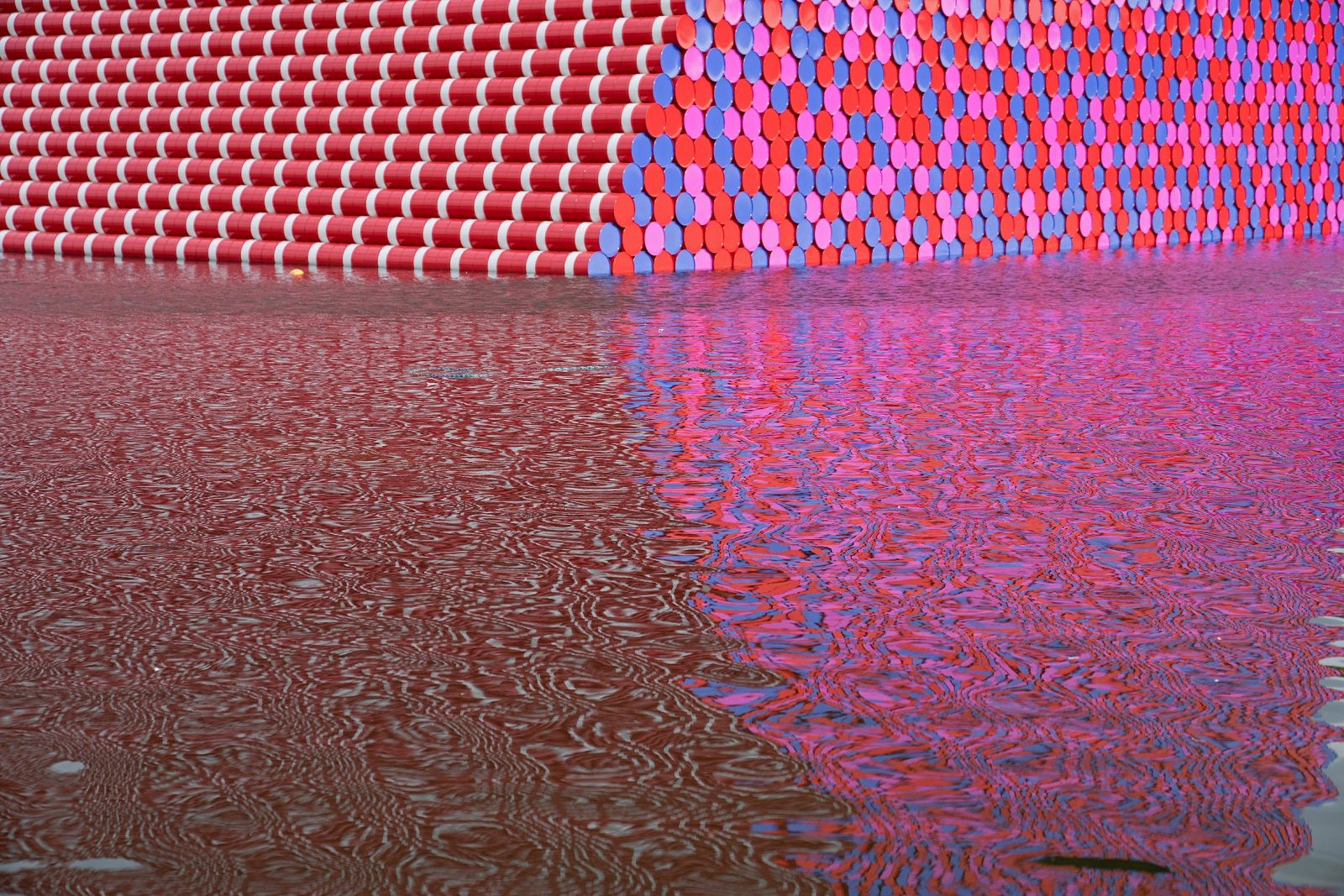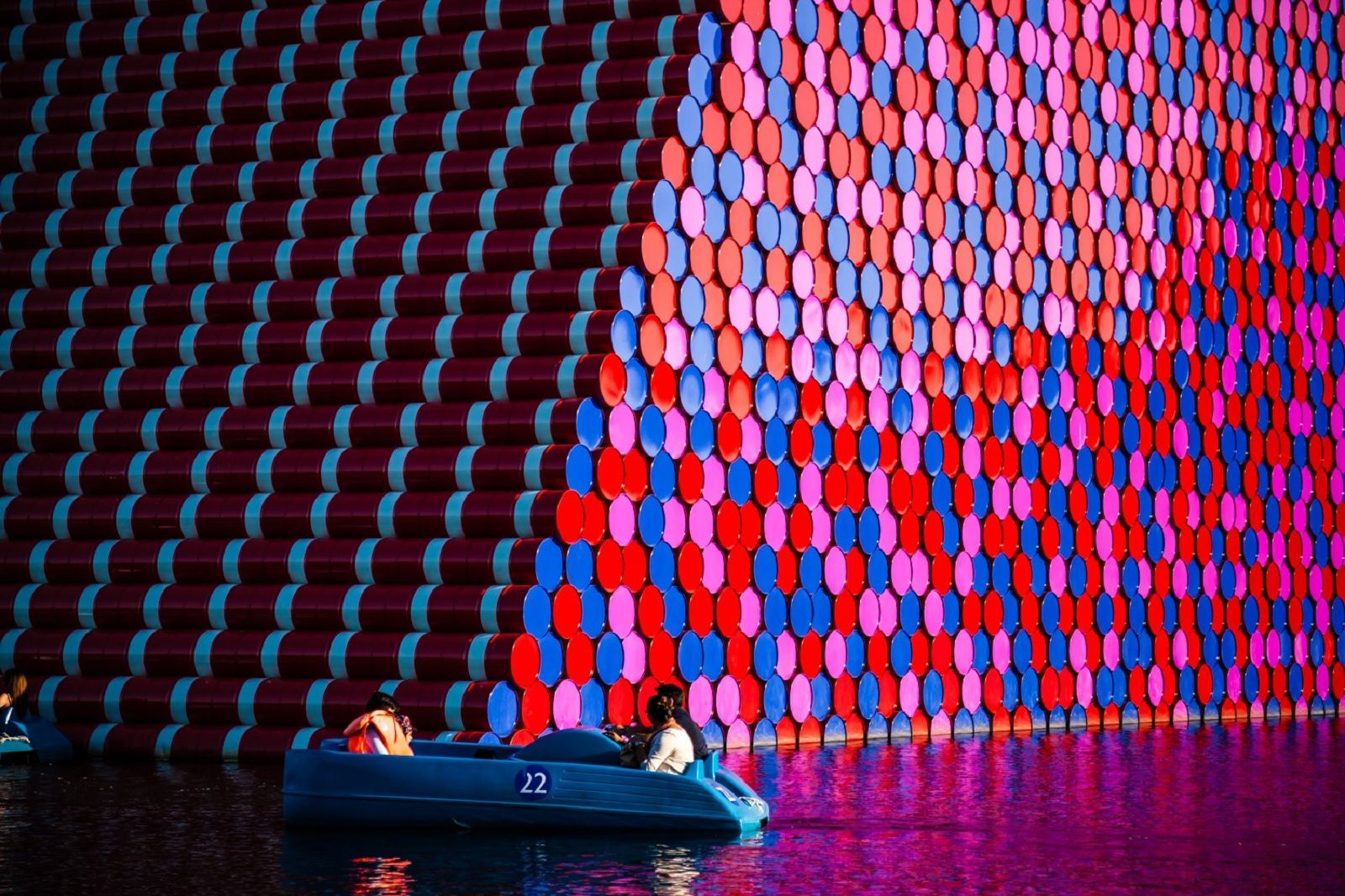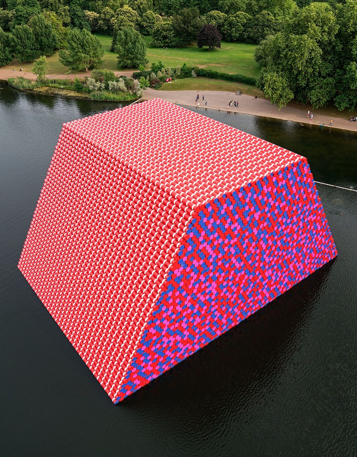 Ispirata alla Mastaba, una costruzione funeraria monumentale dell’antico Egitto, l’opera riprende esattamente questa forma piramidale: alta 20 metri, è realizzata con oltre 7500 barili di petrolio vuoti, impilati uno sull’altro e appoggiati su una piattaforma galleggiante di polietilene che ne sostiene le oltre 600 tonnellate di peso.