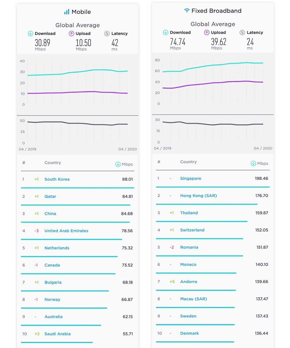 Speedtest, la società di servizi che si occupa della misurazione della velocità di Internet, ha pubblicato la lista aggiornata ad aprile 2020 dei Paesi che hanno la connessione Internet più veloce al mondo. Su un totale di 139 Stati analizzati per la banda mobile e 174 per la banda fissa, le prime posizioni sono dominate in entrambi i casi dai Paesi del Sudest Asiatico e da alcuni Stati europei. L'Italia scende oltre il 50esimo posto: sia per la velocità della banda fissa, per cui è al 55esimo posto, sia per la rete mobile, al 57esimo posto dopo la Lettonia e le Isole di Trinidad e Tobago - un problema che il Presidente del Consiglio Italiano Giuseppe Conte ha menzionato indirettamente ieri in conferenza stampa, riferendosi al piano di ripartenza del paese: