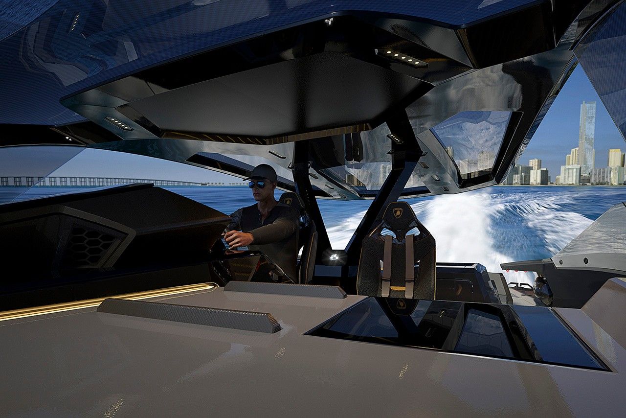 Il design dello yacht è ispirato alle supercar di lusso di casa Lamborghini. Lo scafo e la sovrastruttura ripropongono in chiave contemporanea le linee storiche di due autovetture che hanno fatto la storia di Lamborghini negli anni Sessanta e Settanta, la Miura e la Countach disegnate da Marcello Gandini, mentre il tetto è ispirato ai modelli roadster. Il design di Lamborghini, riconoscibile per le sue forme esagonali e soprattutto per le linee pulite, fa capolino anche in altri dettagli come l'uso delle luci di prua a forma di Y, un omaggio alla concept car del Terzo Millennio. Anche la cabina di pilotaggio ricorda l'abitacolo di un'auto da strada: la plancia di comando interpreta in chiave nautica il cockpit automobilistico, con tanto di sedili sport e timone/volante, mentre il bottone “start&stop” che avvia il motore sullo yacht, presente in due unità, è lo stesso che avvia il motore delle vetture Lamborghini.
