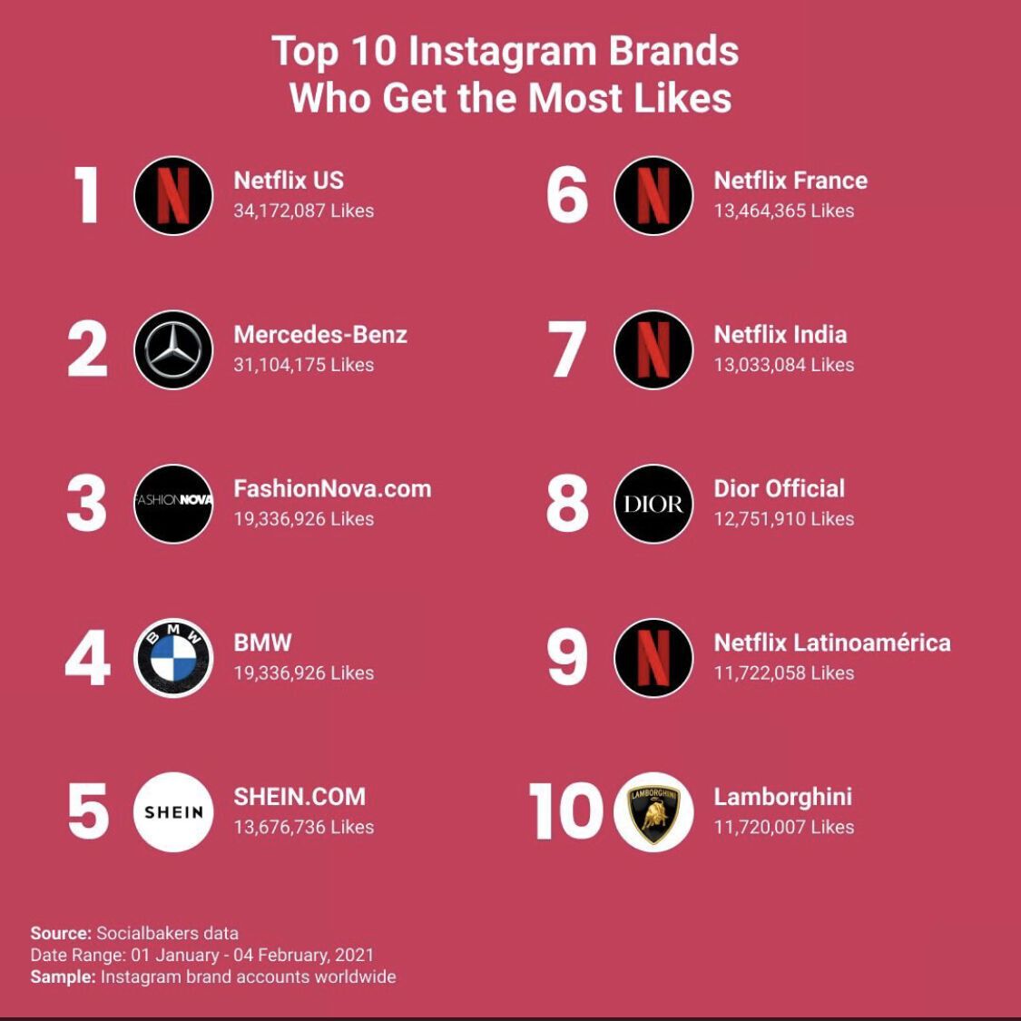 Se la presenza massiccia di Netflix non è una sorpresa, quella di due siti fast fashion come SHEIN e FashionNova è senza dubbio inaspettata. Il servizio di streaming occupa ben quattro posizioni in classifica, dalla prima ottenuta dal suo profilo US alla nona del profilo latino americano. Un piazzamento sicuramente dovuto ai contenuti condivisi online, tra trailer e numerosi meme di alcune delle serie più viste al mondo, facili preda degli utenti di mezzo mondo che guardano film e serie tv su Netflix. Decisamente diverso il discorso per SHEIN e FashionNova, due realtà ben distanti dal concetto di moda che siamo abituati a conoscere e celebri soprattutto per i loro rip-off di designer più celebri. Il loro successo, quasi 20 milioni di like per FashionNova e quasi 15 milioni per SHEIN, è il segno di un fast-fashion più vivo che mai e che, nonostante le campagna che ne chiedevano a gran voce la fine, rimane la prima scelta per gran parte degli utenti Instagram.
