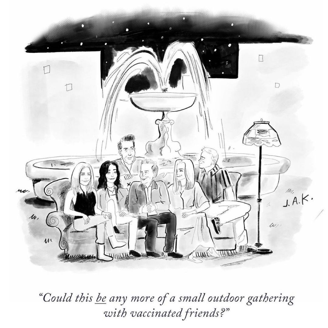 L'approccio con cui ho affrontato la reunion di Friends è lo stesso di quando in autostrada si passa di fianco ad un incidente: da una parte non vorresti fare altro che guardare, cogliere anche solo per un secondo quello che è successo, al massimo della morbosità; dall'altra hai il terrore che quello che vedrai resterà impresso per sempre nella tua memoria. Confortata dal trailer, che preannunciava una reunion senza grandi colpi di scena e quindi senza delusioni, mi sono arresa quasi subito alla visione dello special di una delle sitcom più riuscite e viste della storia della tv - i numeri che sciorina James Corden, inspiegabile presentatore dell'evento, sono impressionanti -, che per fortuna ha evitato operazioni kamikaze come quella di qualche anno fa di Will&Grace.