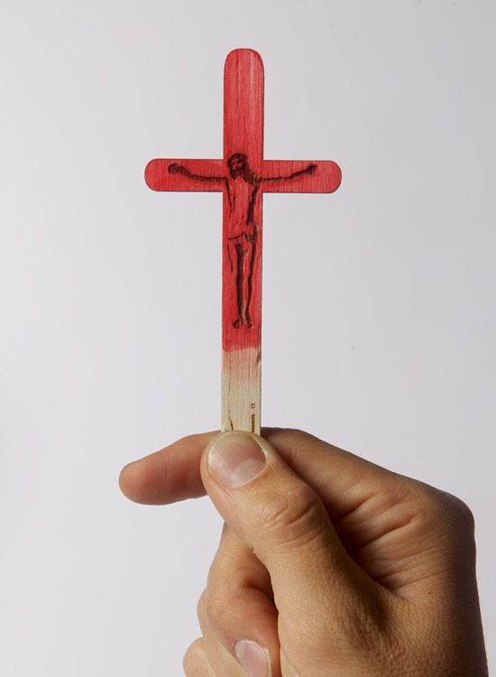 “The holy blood popsicles and their uniquely designed cross stick are a comment of the artist on the close relationship between extreme religious fanaticism and violent historic religious blood baths.”
