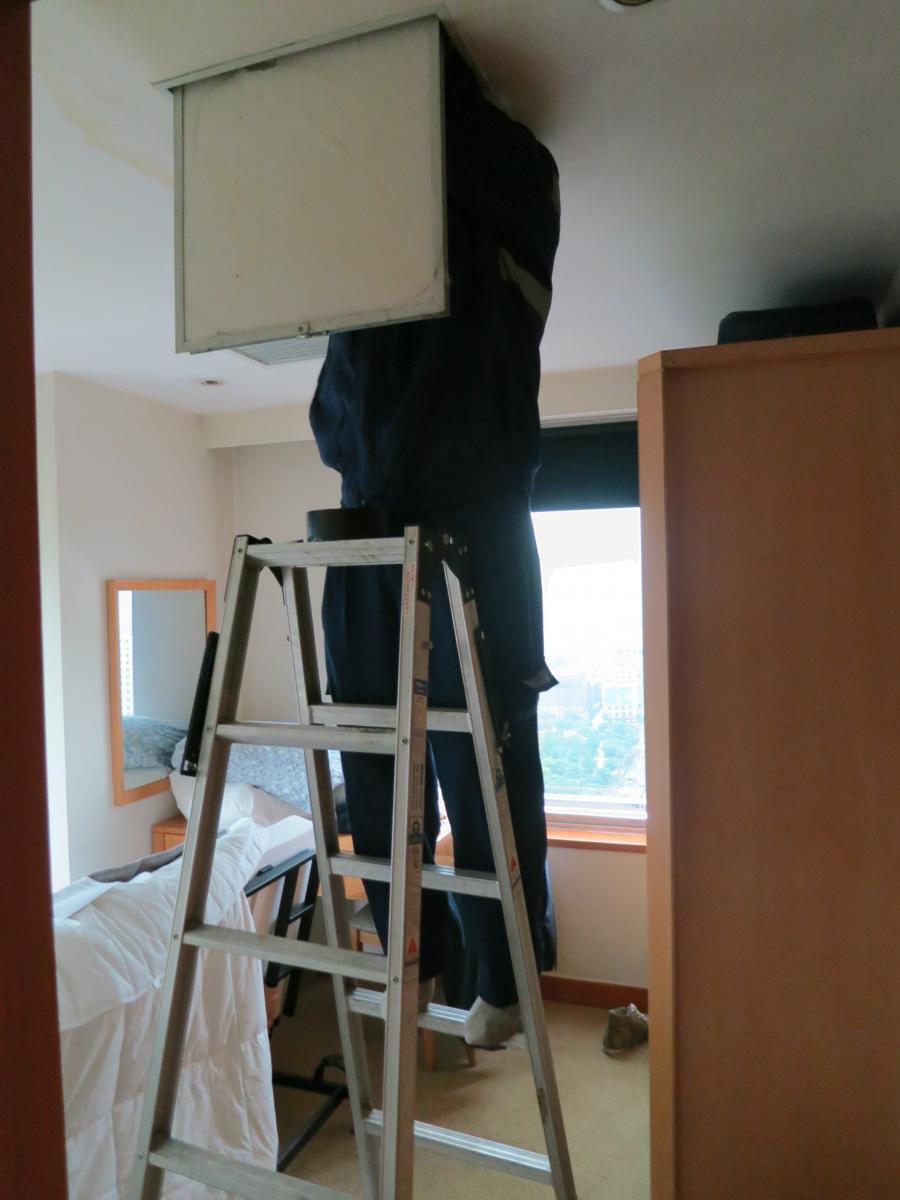 Rientro in camera mia dopo 20 giorni circa e ad attendermi un cascata naturale, naso all'insù e bocca aperta, non per l'incredibile spettacolo naturale ma perché sta per arrivare, è il CDA. Assodata la Rottura dell'aria condizionata, in 10 minuti il mio appartamento diventa una via vai di gente, una sorta di scena stile "la cosa più dolce". Prima l'idraulico dai calzini bucati nella botola, poi tutto lo staff del managment del building, subito dopo sono accorsi il proprietario e ciliegina sulla torta, Sua moglie.