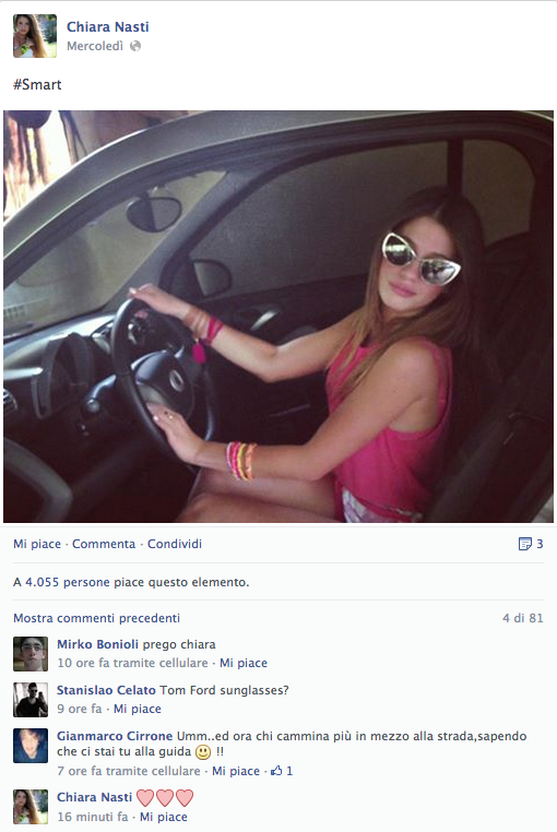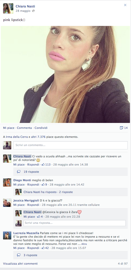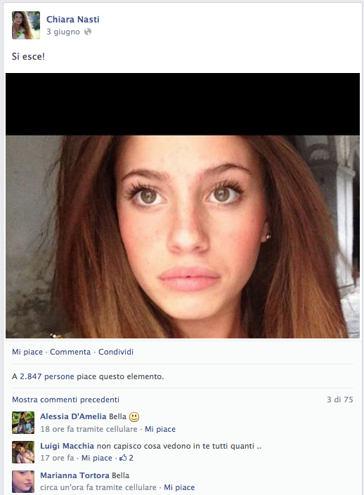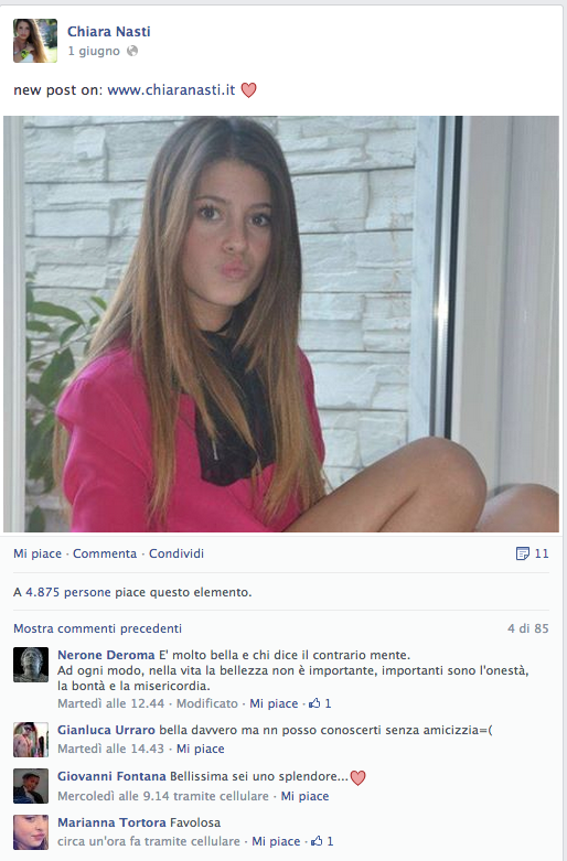Chiara Nasti, porta un nome pesante, un nome che difficilmente riesci a scrollarti da dosso, CHIARA, come Chiara Ferragni, Chiara Biasi, Chiara di Paola e Chiara e volendo anche Chiara di Perugia, ma quella non è una bella storia, pure se figlia anch'essa del web, tutta quella gente li…Lei ha 16 anni, figlia di commercianti d'abbigliamento Napoletani, in tutte le sue web interviste e radio interviste afferma di non sapersi spiegare il suo fenomeno, non riesce a capire come mai abbia avuto così successo. E in effetti aziende e multinazionali con fatturati di oltre milioni di euro, non riuscirebbero a totalizzare 100 mila followers neppure pagandoli in YEN (e noi possiamo confermare…). Questa ragazzina dal viso carino, chiaramente ispirata all'icona del momento aka Belen Rodriguez, ci è riuscita in 1 solo anno, ma i suoi numeri non finiscono qui. I suoi post su Facebook fanno rabbrividire sia la Biasi che la Ferragni, foto con 4mila, 6mila e 7mila like e più, incredibile, eppure a tutto c'è una spiegazione. All'attivo ha già una collaborazione con un brand di T-Shirt, ma il suo sogno è di diventare Fashion Blogger, tutto qui. Di lei sicuramente ne sentiremo parlare ancora, ma purtroppo per lei (…e per noi) non è l'unica, e allora, "Specchio, specchio delle mie brame, CHI è la PIU BELLA DEL REAME?"