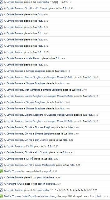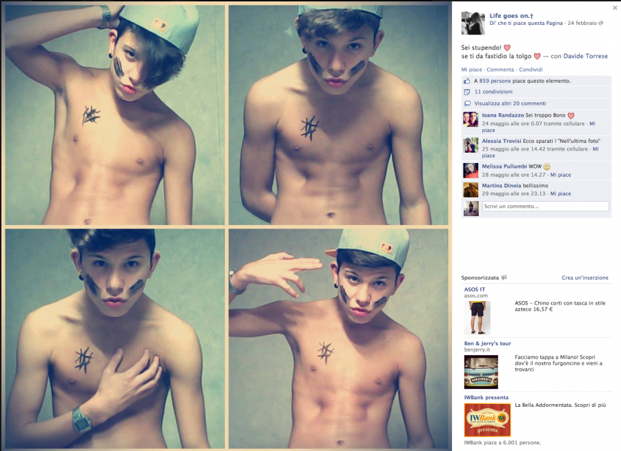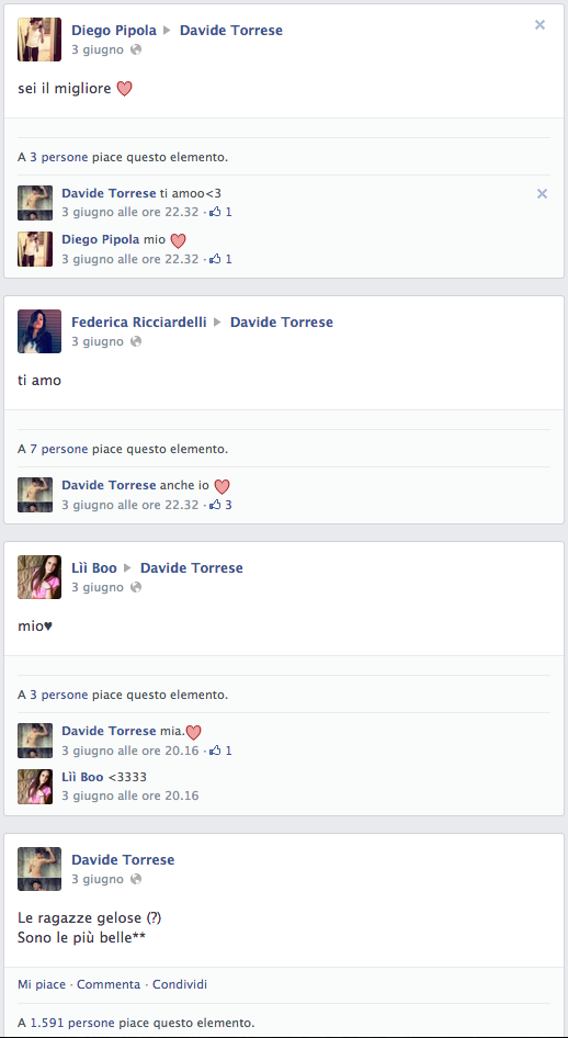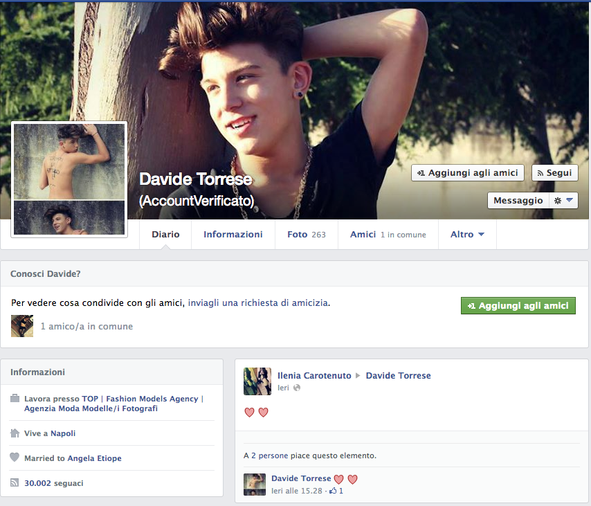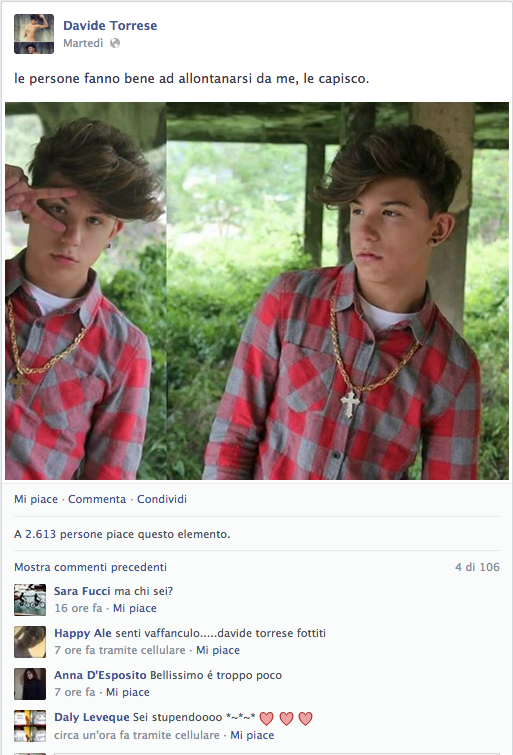 Davide ci da dentro forte! E' probabilmente il più piccolo dei suoi amici Fescion Blogger, ma 30mila seguaci non sono pochi. Anche per lui bacheca piena di Ti Amo e ti voglio bene, solo sentimenti veri per il tenebroso Davide. Le sue foto sono condizionate da pose alla Zayn Malik dei One Direction, e subiscono la stima di 5mila, 6mila follower. Ebbene si, neppure a pagarli, aziende e o leader politici riuscirebbero a totalizzare tutti questi like, ma è con lui che sorge un dubbio! Questi ragazzini, queste blogger, useranno dei Trick? (Vedere foto in cui nel minuto 3.40 è riuscito a fare Like a 60 altre foto). Ciuffo alla "Sampei" e cappellino alla Jay Z, Davide Torrese è l'esempio di una generazione di ragazzini già pronti e preparati su meccanismi e tecnologie web, per far si che a un prodotto si dia visibilità massima e garantita, facendo di se ogni giorno una ottima palestra su cui contare.