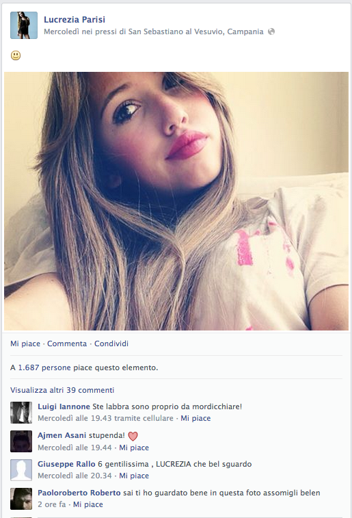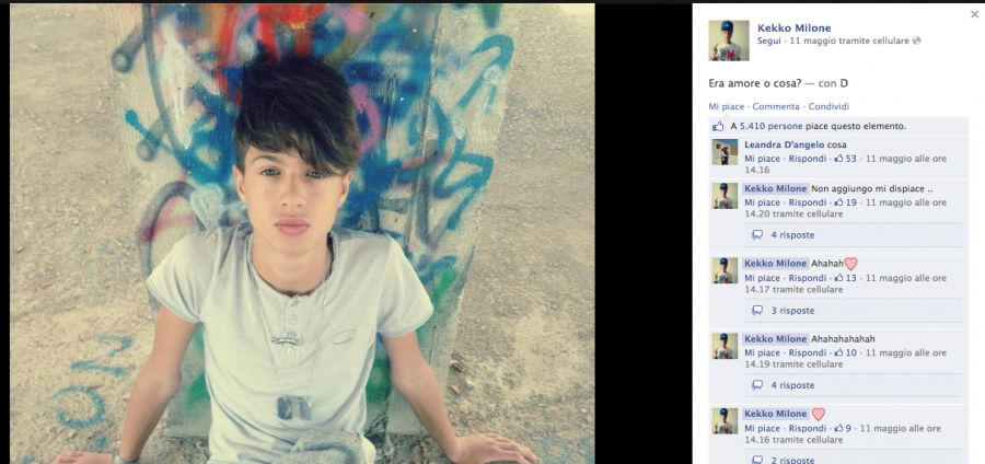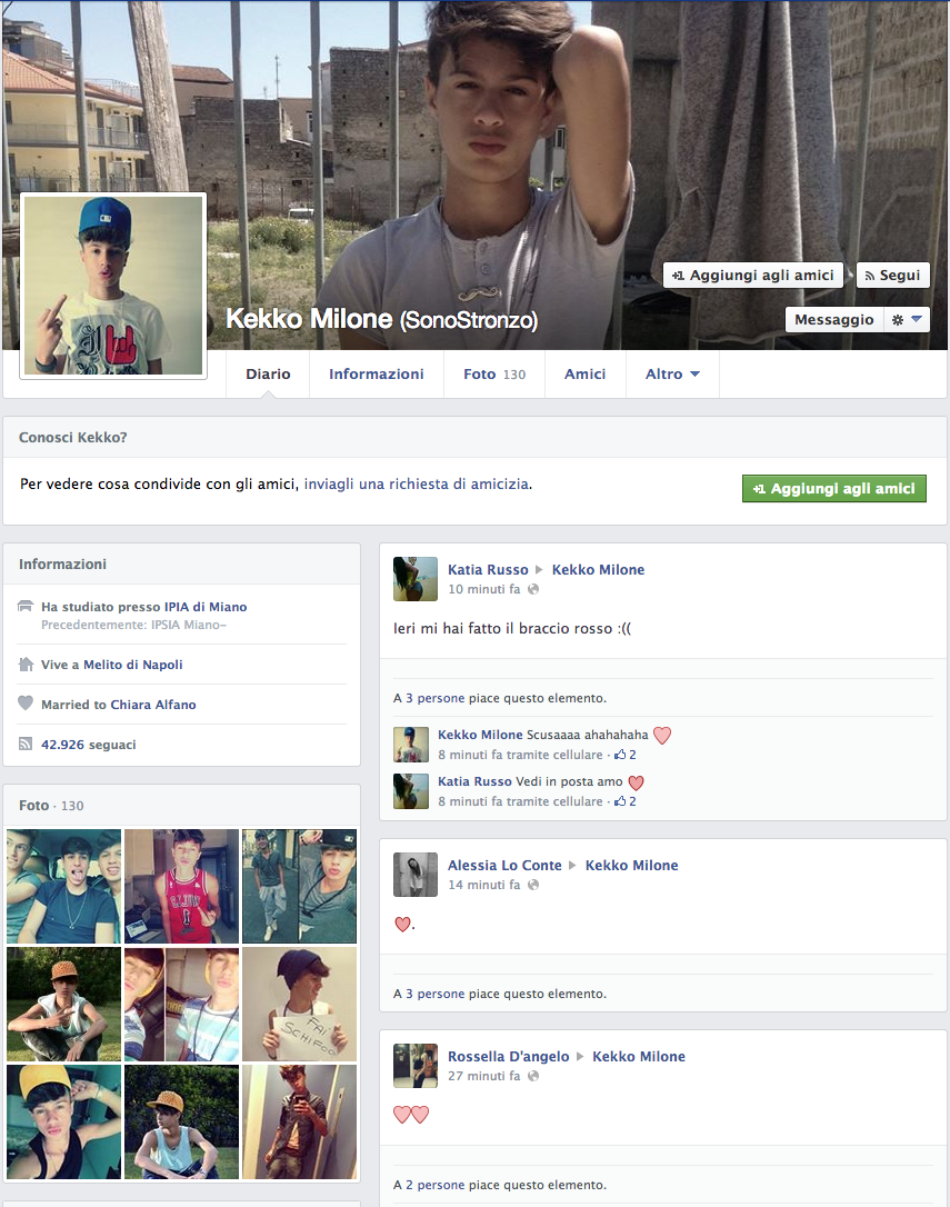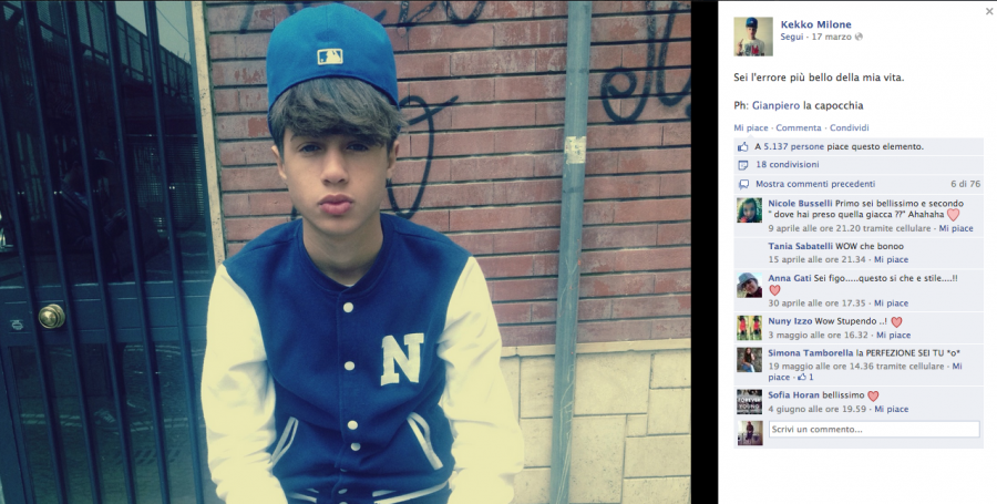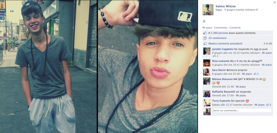 Kekko Milone, è il più HIP HOP di tutti, 42mila fan, vive 10mila storie parallele (almeno crediamo), distribuisce TI AMO in quantità industriali, cuori e baci, ma una espressione su tutte non l'abbiamo ancora compresa, MIA, MINE…sei mia? Sei dei miei? Boh? Amico di Sara Tortora, anche Kekko Milone vive nell'Hinterland Napoletano, Melito per la precisione, la sua bacheca è colma di confessioni d'amore, di mi manchi, di "Ti ricordi di me?", degno di un vero Latin Lover; Anche lui totalizza la media di 5mila Like a foto e il suo viso pulito è il sogno proibito di molte Teenager, che sempre più spesso gli confermano che "la perfezione ha il suo nome". Bocca di rose Kekko Milone, è un TOP Fescion Blogger, e la sua aria da bello e dannato potrebbe fargli valere qualche lavoretto come modello al CIS di Nola nei prossimi anni. Auguri!