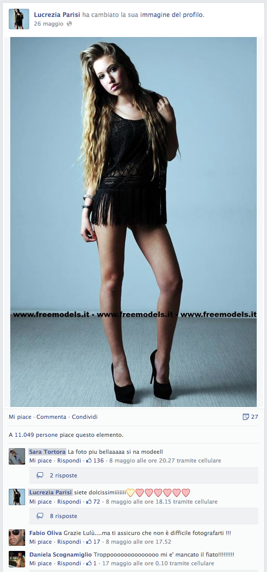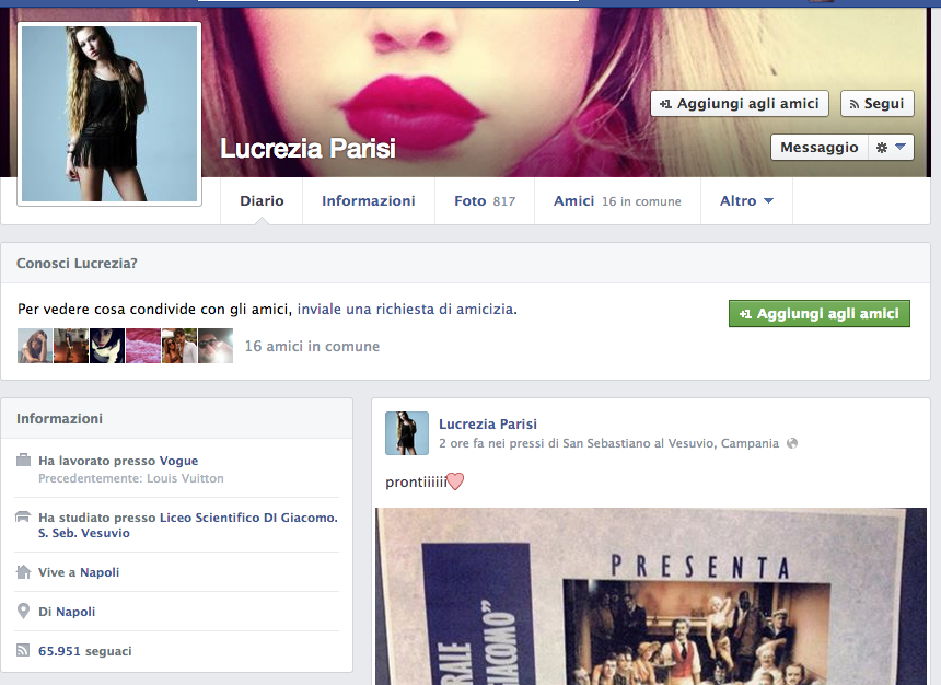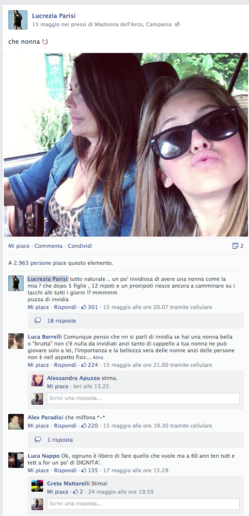 In ordine di Follower dopo Sara Tortora c'è Lucrezia Parisi, 65mila follower e una media di like a foto che si aggira intorno ai 10mila. Lo stereotipo è sempre quello, ragazza pulita, viso carino e sopratutto Teenager, infatti Lucrezia classe 1998, ha appena 15 anni. Anche lei non ha un blog, non è una PR, ma almeno lei rispetto alle altre due sue coetanee, scrive di aver lavorato…presso Louis Vuitton e Vogue, Credici, ma almeno questo fa presagire che in futuro, un lavoro o una occupazione la voglia intraprendere. E' di San Sebastiano a Vesuvio, noto luogo dove imprenditori tessili e d'abbigliamento si danno molto da fare, e in effetti la piccola Fescion Blogger di domani, ha già fatto qualche scatto pubblicitario per un piccolo brand locale, del resto anche Brooke Shields aveva 15 anni quando la sua carriera ebbe inizio. Nelle sue foto notiamo pose più da modella, quindi meno naturali rispetto alle altre, ma una foto su tutte ci ha deliziato la giornata, la Nonna e lei in giro come due amiche, un tripudio di gioia per ogni MILF addicted ... assolutamente da non perdere.