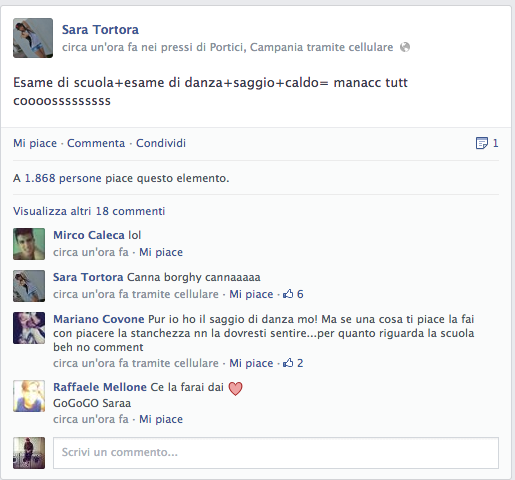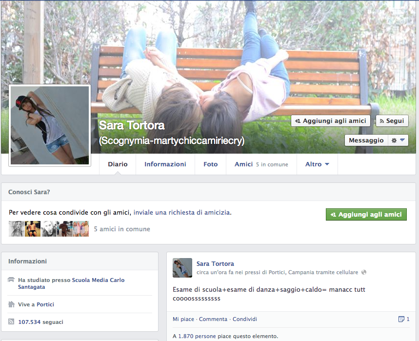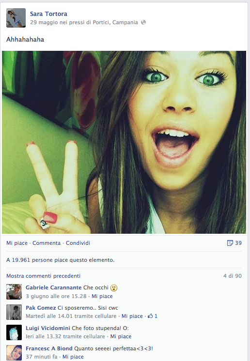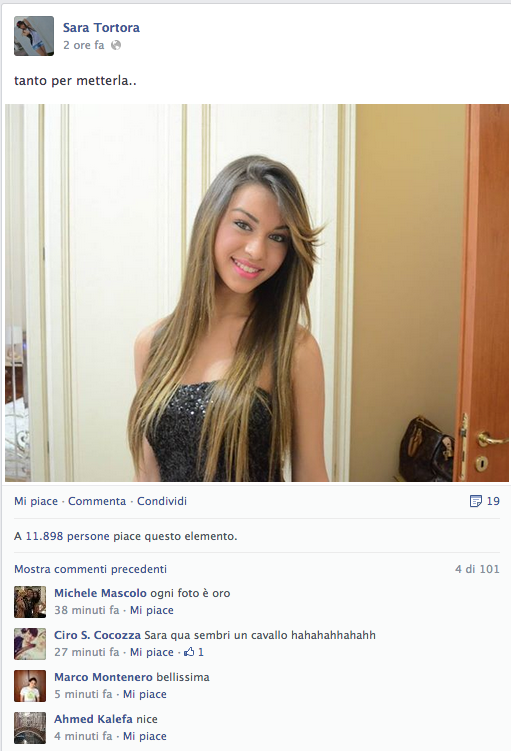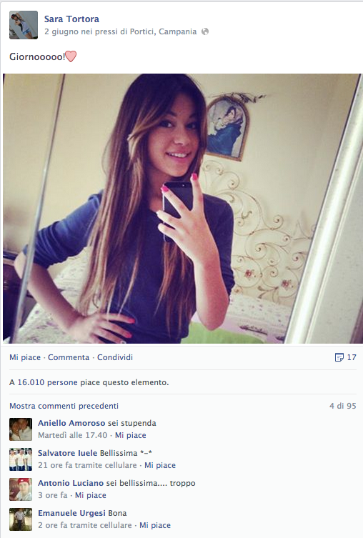 Sara Tortora, non ha un sito, non ha twitter, non è una PR, non lavora per qualche azienda di Marketing e Comunicazione, niente, lei va alla SCUOLA MEDIA CARLO SANTAGATA, ed è la classica ragazzina che a Portici (ricordiamo che Portici è la città europea con più alta densità di popolazione per chilometro quadrato) fa girare la testa a tutti i dodicenni e tredicenni, in giro il sabato a fare vasche in strada. Il Suo profilo Facebook, vanta ben 108 mila "seguaci", incredibile, e anche lei su ogni foto, strappa la media di 3mila, 4mila like, ma da attente analisi, abbiamo registrato anche i 16mila e 20mila like, cose che sono riuscite solo a David Guetta e Lady Gaga. Per tutti questi like, la giovane Sara, quasi ogni giorno regala una foto ai suoi seguaci, nella sua più comune espressione, la sua "magnum" per intenderci, il BACIO A LABBRA PIENE, bellissima, infatti non potevamo farci mancare un collage di alcune foto, perché metterle tutte era praticamente come creare un file dalle misure di 6 metri per 3, l'equivalente di un banner promozionale di strada. Anche per Sara Tortora, c'è una netta somiglianza con la Belen, sogno erotico di tutti i maschietti di età compresa tra i 13 anni e i 70. Sotto il profilo promozionale e pubblicitario, è ancora vergine e si spera anche per altro, ma siamo sicuri che ben presto non mancheranno le offerte e la scoperta da parte di tutte queste ragazzine della parola, BUDGET! E quindi si prospetta un futuro bello roseo…un declino assicurato, dove a farla da padrona saranno like e cuoricini, e baci e ti amo regalati come caramelle. Buone cose.
