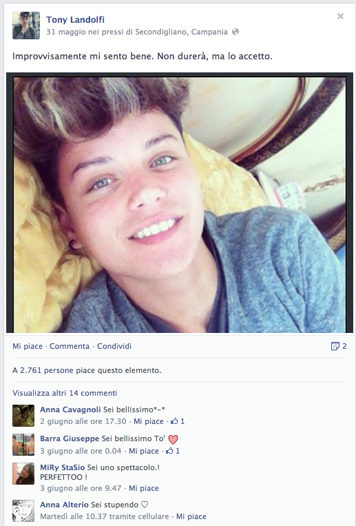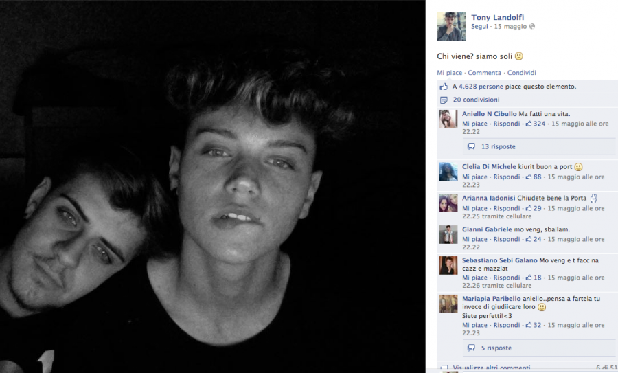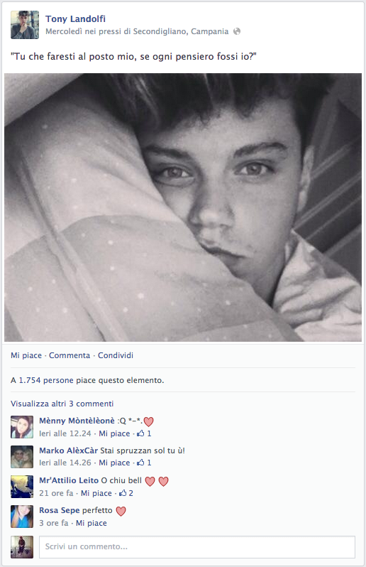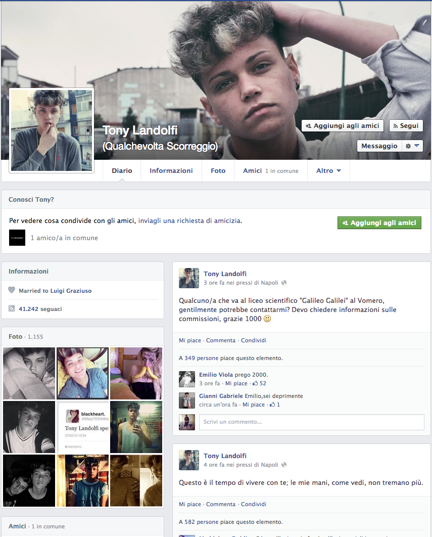 Lui è Tony Landolfi, il Justin Bieber di Secondigliano, ha all'attivo 41mila Follower su Facebook, va a liceo ed è amico di altri tre mini fescion blogger del futuro, con cui ogni tanto si diverte a creare delle foto COMBO per riuscire a fare sempre più visualizzazioni e like possibili. Faccia d'angelo, usa Facebook per vanità, infatti molti sono autoscatti in cui chiede ai suoi fan, chi gli vuole bene o chi se lo scoperebbe; Ogni tanto tra una foto e una instagrammata, regala frasi e citazioni da urlo, copiate e incollate un po' qua e un po' là, Paolo Coelho, Lucio Battisti, Nek, riuscendo a stupire una media di 1000 fan ogni volta, Genio. Della cricca dei maschi è quello più introspettivo, più profondo, quello che cerca di piacere un po' a tutti insomma, eppure alcuni fan riescono ad essere sempre cattivi, tra chi preferisce farlo bruciare nell'acido e chi gli consiglia un buon lavoro con una buona reputazione. Beh noi ve lo abbiamo segnalato, appuntate questo nome e chissà che in futuro non lo si ritrovi in qualche sfilata uomo Milano, e magari seduto proprio accanto a voi in primafila.