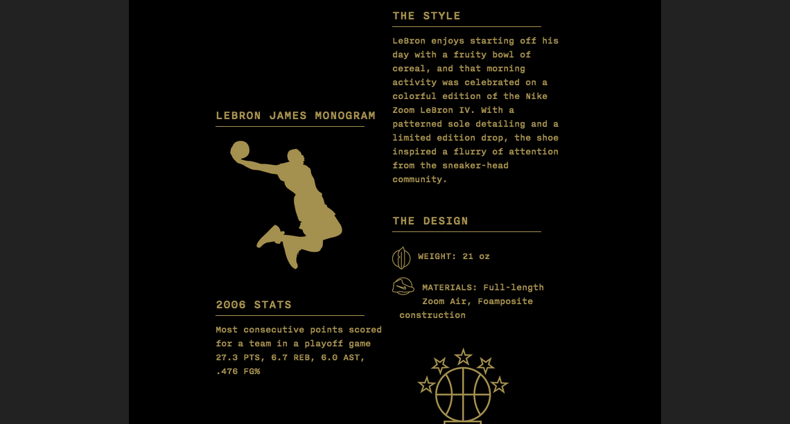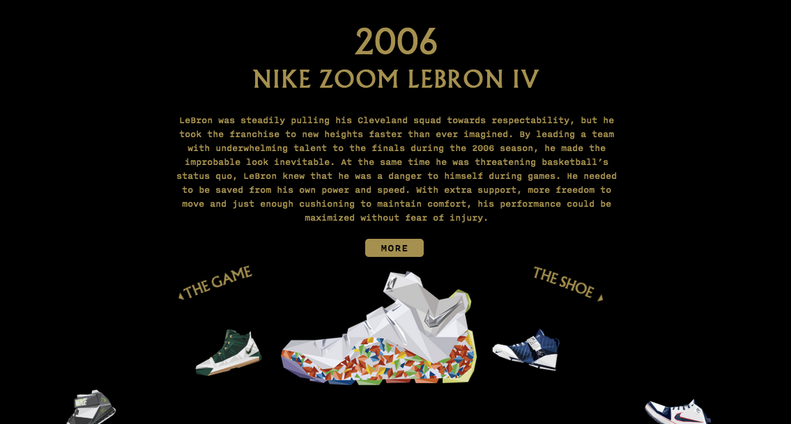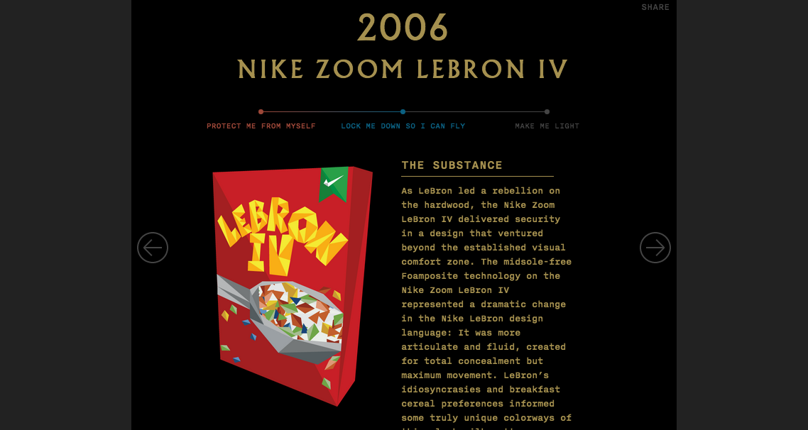 Nike celebra LJ con un simpatico sito dal titolo Lebron James: A decade in the Making, una nuova esperienza interattiva dedicata alla tanto amata serie firmata dal campione che quest'anno arriva a quota 11. Il sito si divide in due parti: La prima, è un viaggio attraverso le scarpe della star del basket, prodotte con Nike dal 2003 fino ad arrivare alla Lebron 11, per poi concludersi con una cronaca sui i suoi risultati come atleta. Check it out!