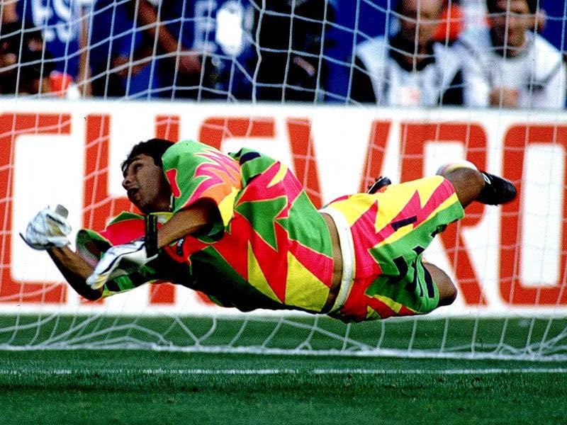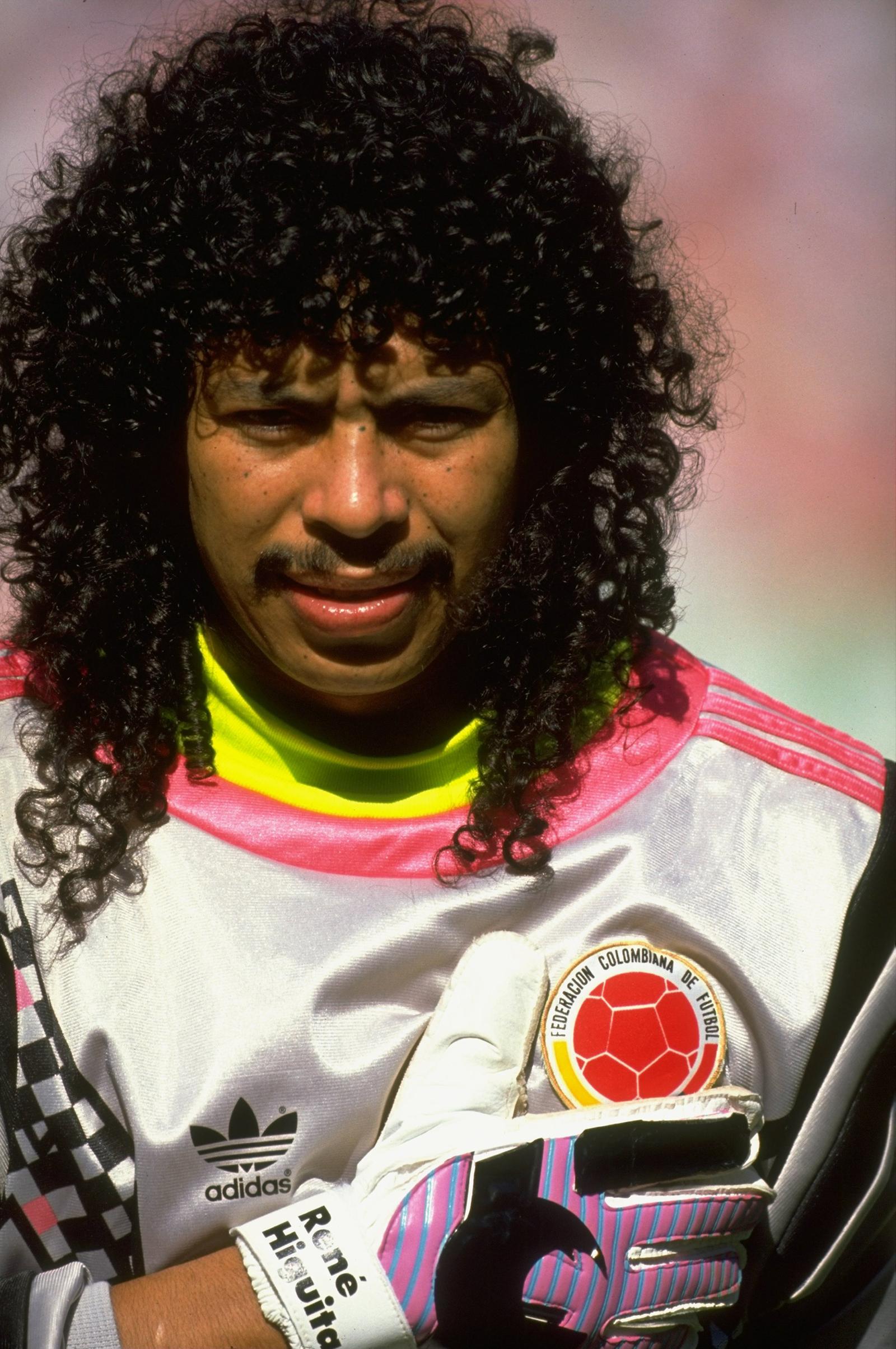 Altro esempio di genio e sregolatezza del calcio mondiale. Titolare della nazionale colombiana dal 1987 al 1999, Higuita è passato alla storia per i gol messi a segno (ben 54 con squadre di club) ma, soprattutto, per il suo "marchio di fabbrica", ovvero la 'Mossa dello Scorpione'; un gesto tecnico che effettuava nel momento in cui, una volta postosi sulla linea della porta, respingeva la sfera con i piedi uniti dopo aver saltato in avanti. Un'azione spettacolare che faceva impazzire gli spettatori. La sua carriera si è sviluppata soprattutto in squadre di club sudamericane, mentre con la nazionale colombiana ha preso parte ai mondiali di Italia '90 ma non a quelli di Usa '94, in quanto fu squalificato dalla Fifa dopo esser stato trovato positivo alla cocaina. Così come Chilavert, Higuita ha passato alcuni mesi della sua vita in prigione per aver mediato (senza autorizzazione della Polizia) alla liberazione di un uomo sequestrato da una banda di malviventi colombiana. La sua divisa 'Adidas' sfoggiata al Mondiale del 1990 presenta una serie di triangolini viola, verdi e blù che anticipano le fantasie ideate qualche anno più avanti dalla 'Umbro'. A questo link puoi trovare tutte le vecchie maglie della Colombia. (OLD COLOMBIA FOOTBALL JERSEY)