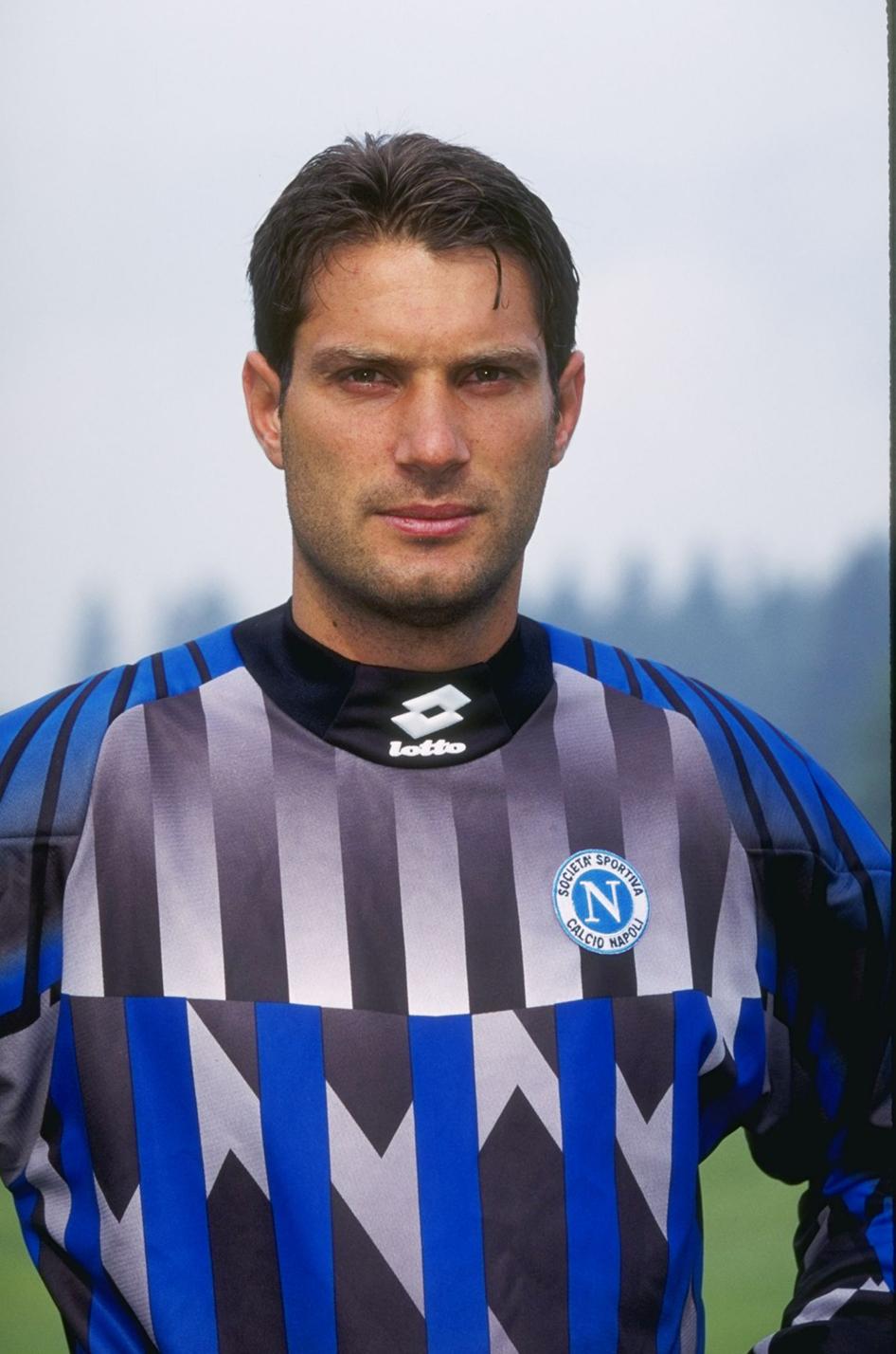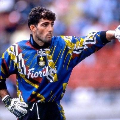 Uno dei portieri più forti del calcio italiano degli anni 90'. Con la Sampdoria e l'Inter ha collezionato scudetti e trofei internazionali che gli hanno permesso di difendere la porta dell'Italia ai Mondiali di Usa '94 e Francia '98. Il suo carattere particolarmente estroverso (soprattutto in campo) e la sua tendenza a voler dare un'immagine di se da 'belloccio' gli hanno attirato l'antipatia di molte tifoserie avversarie. La divisa che indossa nella foto risale alla sua esperienza all'Inter; era la metà degli anni '90, quando la Umbro divenne sponsor tecnico della maggior parte delle squadre di club e nazionali. In quel periodo, la casa di produzione sportiva inglese propose fantasie multicolori e multiforme per le casacce dei portieri: tante tonalità cromatiche e forme geometriche piazzate un pò 'a caso' che ricalcavano la moda di quel tempo. A questo link puoi trovare tutte le vecchie maglie dei portieri dell'Inter (OLD INTER GOALKEEPER FOOTBALL JERSEY)