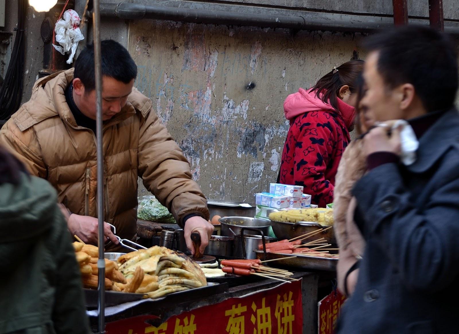 Camminando per la strada è facile imbattersi in gruppi di persone che, seduti su minuscoli sgabellini, consumano il loro pasto magari accompagnandolo con un tipico tea cinese, parlando e ridendo a voce molto alta, come è solito fare qui in Cina.