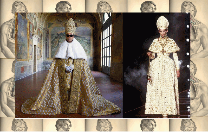Gli abiti dello show sono un mix di creazioni realizzate ad hoc e capi d'antan. Alcuni, risalenti anche al Settecento, rispecchiano bene il dualismo della chiesa, da un lato la sobrietà castigata di suore e preti, ripresa recentemente nelle collezioni di designers come Nicomede Talavera e Damir Doma, mentre dall'altro l'edonismo e il lusso di vescovi e papa ben rappresentato da John Galliano per Dior nella Couture Fall del 2000 con un look che sembra provenire direttamente dal guardaroba di Pio XIII.
