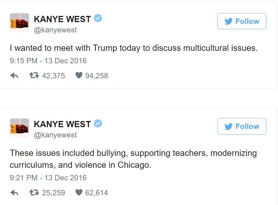 Intorno alle 9 pm, infatti, tramite il suo account Twitter il cantante spiega che lui e Trump hanno discusso di "questioni multiculturali", ma anche di bullismo, sostegno degli insegnanti, modernizzazione dei curricula, violenza a Chicago e dell'importanza di avere una linea di comunicazione diretta con il futuro presidente se si vuole veramente cambiare.