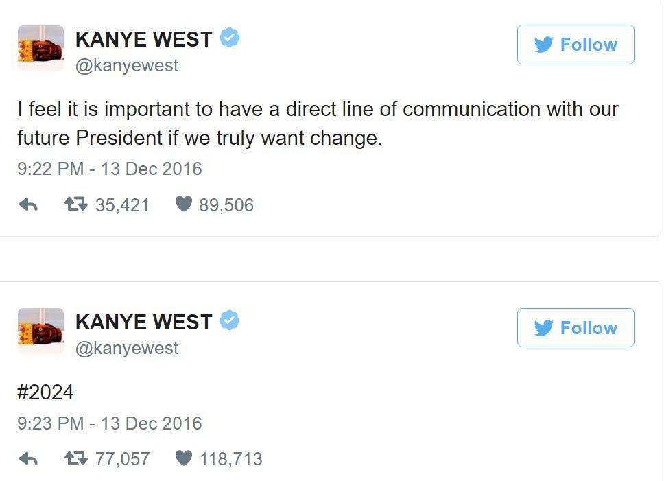Si sono rivelate dunque false tutte le chiacchiere apparse sul web dopo la notizia dell'incontro tra i due, ma non ai rumors che sostengono che dietro questo incontro ci sia il desiderio di West di cantare alla cerimonia d'insediamento del magnate dell'edilizia il 20 gennaio a Washington. Kanye West continua quindi a far parlare di sé. E che dire dell'intenzione di West di diventare presidente degli Stati Uniti?