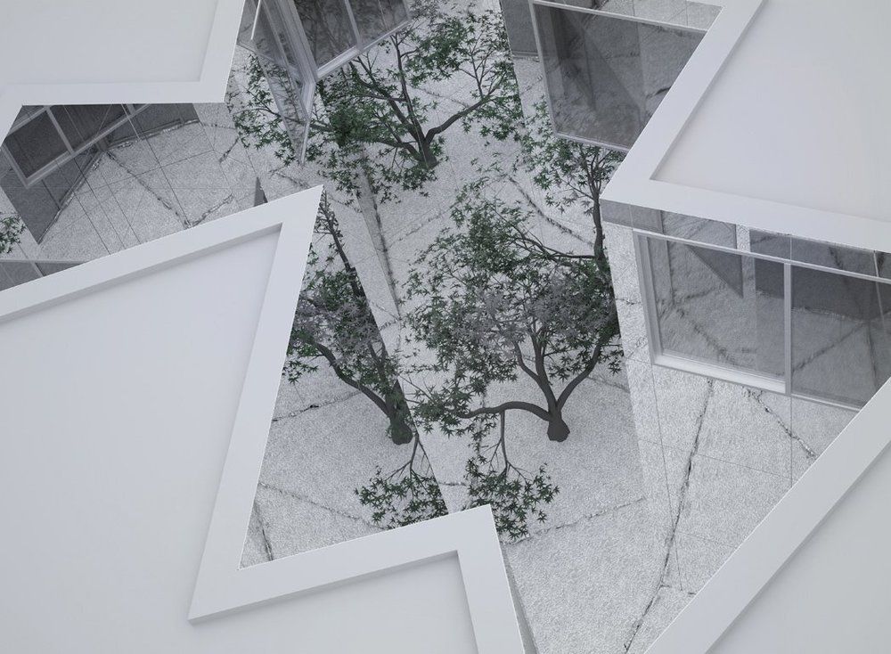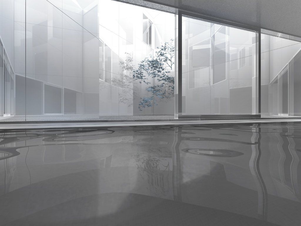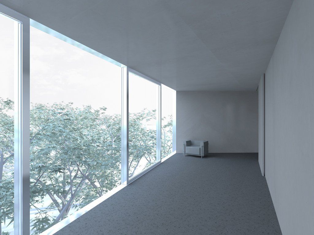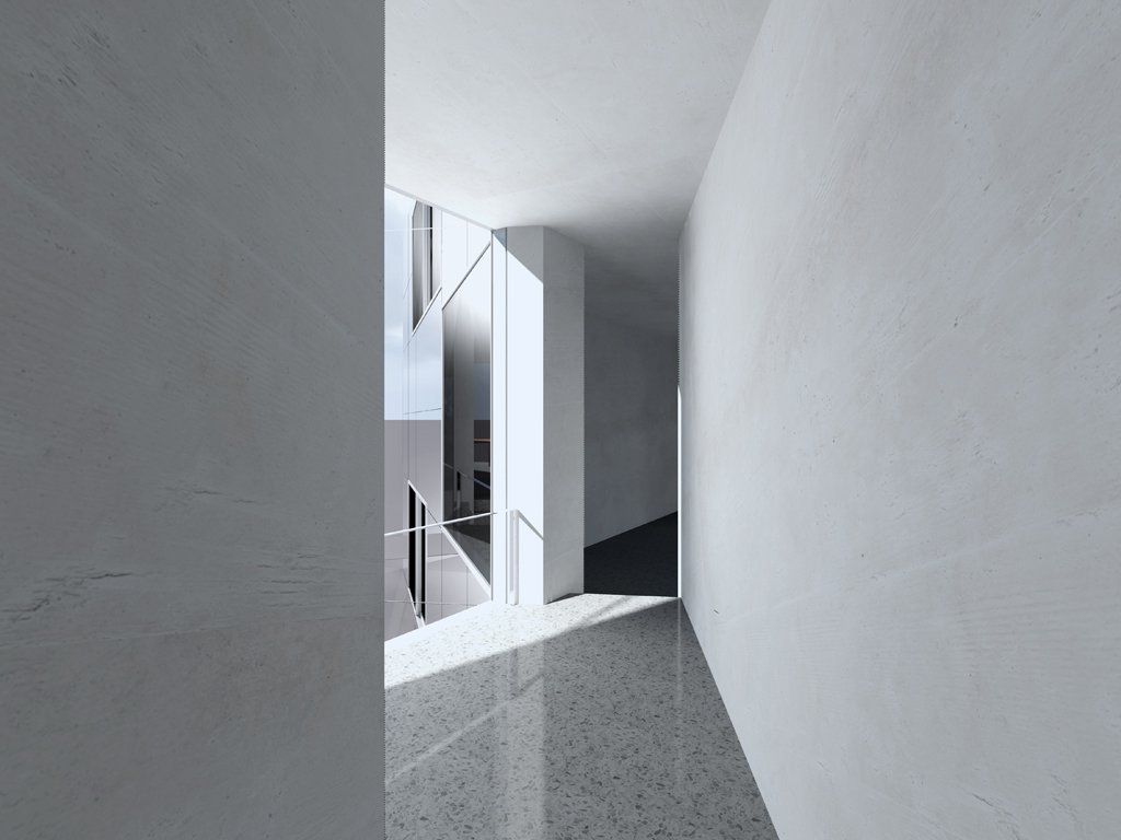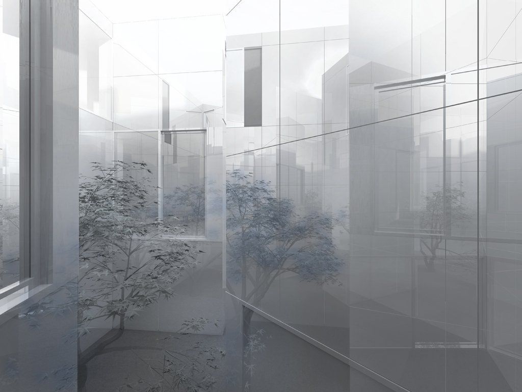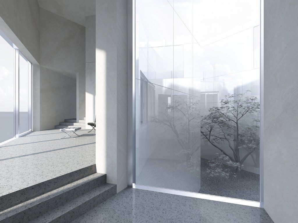 All'interno gli unici materiali utilizzati sono gesso bianco, marmo e cemento, che insieme colorano l'estesa superficie di diversi toni di grigio, rischiarati dalla luce proveniente attraverso grandi finestre. Villa 058 è un progetto unico che grazie alla geometria frammentata del proprio volume e al rivestimento specchio offre una privacy assoluta, una pace assoluta, un rifugio zen e futuristico dalla trafficata vita metropolitana della cità.