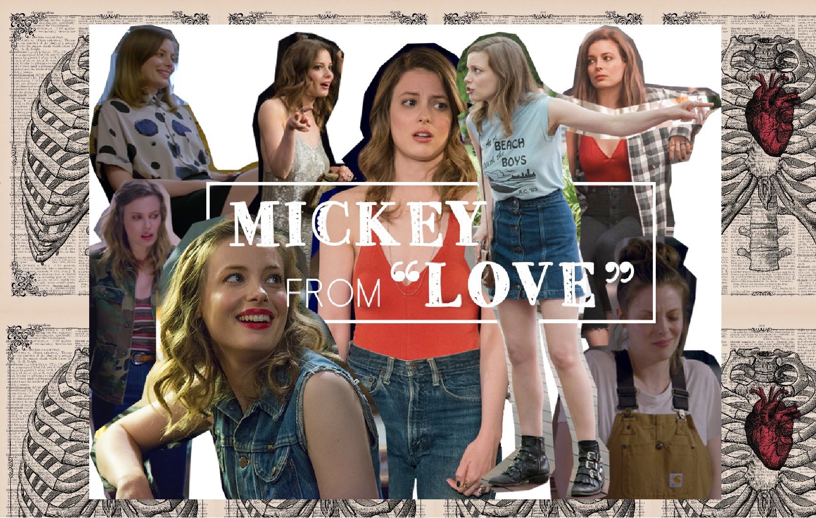 La costume designer Jennifer Eve ha setacciato un gran numero di negozi e mercatini per scovare i pezzi che compongono i look di Mickey. E il risultato spacca! Il suo mix di streetwear, sfumature grunge e capi sportivi la rende unica, cool, modernissima e ricorda molto le ultime collezioni presentate dal marchio Coach 1941. Su di lei, grazie anche alla bellissima struttura ossea del viso e ad un personaggio affascinante, funziona tutto: Levi's vintage a vita alta, camicie di flanella, i giubbini Adidas, salopette da lavoro, bluse di seta col fiocco, mini abiti in paillettes, maglioni over, shorts col pizzo, minigonne, band tees e persino ciabatte da piscina con i calzini di tulle. La protagonista di Love è una vera icona fashion, una it girl da copiare, strampalata, ironica, incasinata...una perfetta ragazza contemporanea.