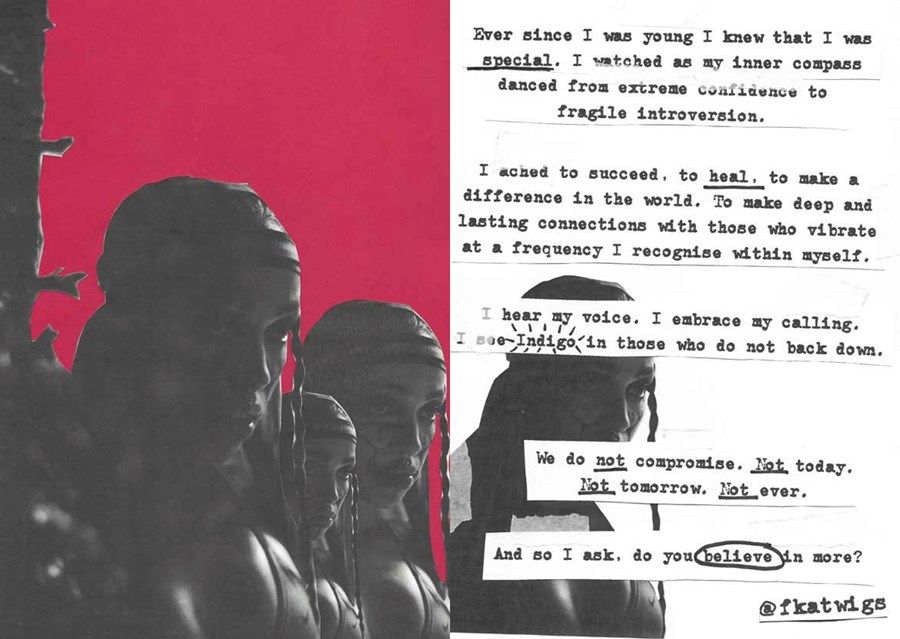 Fresca della sua collaborazione con Nike, lanciata pochi giorni con il suggestivo videoclip “Do You Believe In More?”, FKA Twigs continua a far parlare di sé, presentando in anteprima alcune immagini della sua nuova fanzine. Cantante, musicista, ballerina e Creative Director della nuova campagna NikeWomen's Spring Zonal Strenght Tights di Nike, adesso FKA Twigs si lancia anche nell'editoria, con la sua personale zine che fa parte del progetto “Do You Believe In More?”. Una pubblicazione intima e immediata come un diario segreto scritto tutto d'un fiato, in cui l'artista indaga il significato di creatività ai giorni nostri e il bisogno di realizzare le proprie aspirazioni, ma anche temi come la sexual fluidity e la self-expression. FKA Twigs si rivolge direttamente ai suoi lettori, gli unici capaci di rendere reali i loro sogni, spronandoli a dare il meglio di sé nella vita. Il progetto “Do You Believe In More?” ci mostra la vita di una ragazza “who grew up looking different from everybody else around me, who wanted to do things no one else wanted to do in a small town, who didn't grow up with lots of money, but just had so much determination and hope inside herself” come dice FKA Twigs e aggiunge: “I wanted to do more with my life. I wanted to do everything”. Le pagine della fanzine, mostrate in esclusiva su Dazed, mostrano una serie di collage colorati, fotografie e note personali della cantante. Il progetto, realizzato da FKA Twigs e Suzannah Pettigrew, include le collaborazioni con English Gardner, Chester Martinez, Saskia Horton, Paleta CalmQuality, Jay Kirton, Rithiely Pereira, Lilly Leithner, Latonya Swann, Kaili Bright, Madelyne Spang, Mishay Patronelli, Cyan Assiter-Clark, Oneohtrix Point Never, Motion Graphic e David Uzochukwu. Infine, FKA Twigs ci chiede: “Do you believe that you can reach your best physical shape? Do you believe that you can use your confidence to get that promotion at work or finish that creative project?”. E voi cosa rispondete? Do you believe in more?