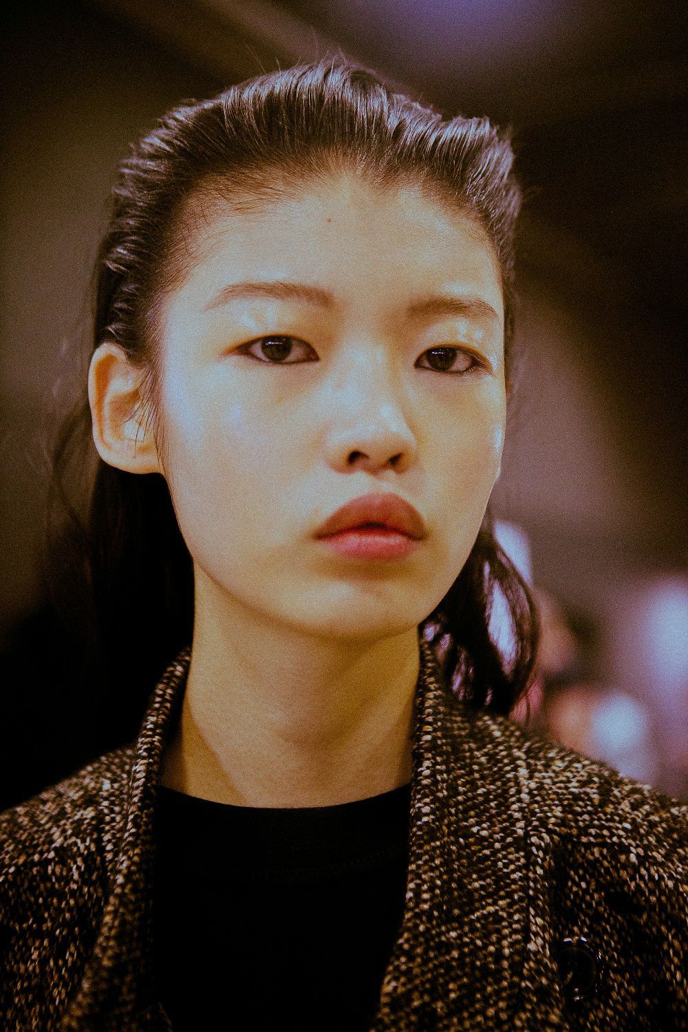 Il beauty, invece, è piuttosto semplice, make-up nude, rossetto pesca, mentre i capelli cadono dietro le spalle tirati indietro.