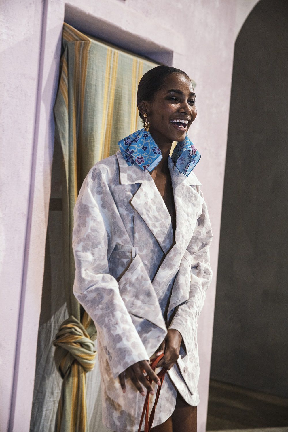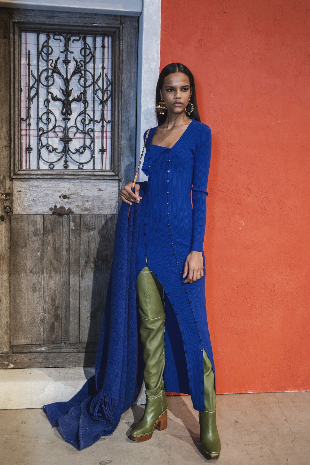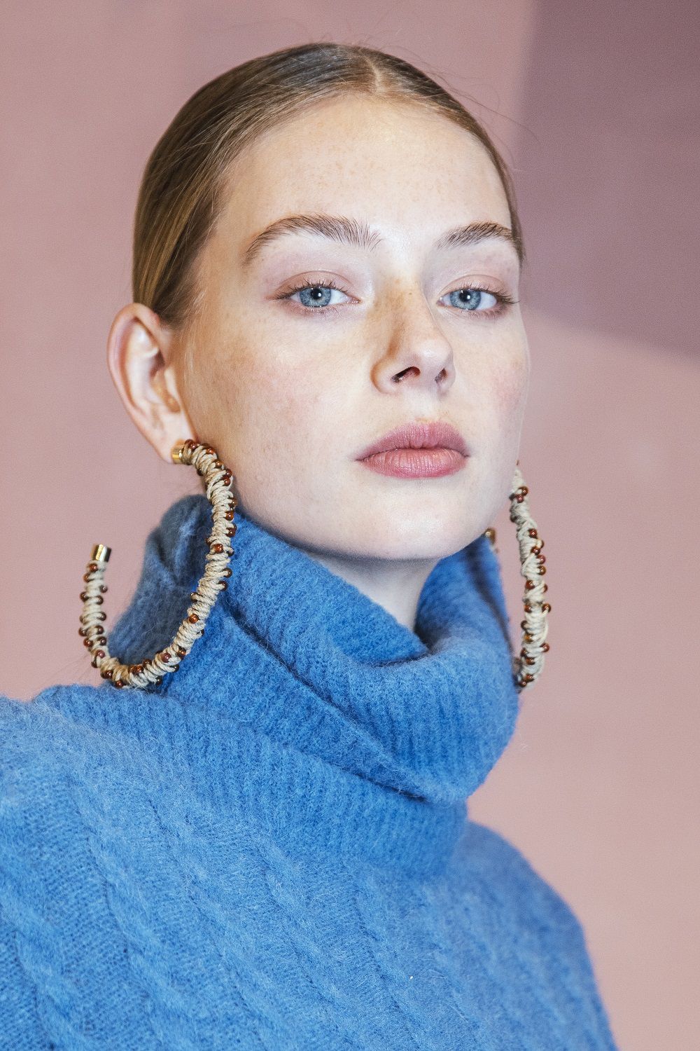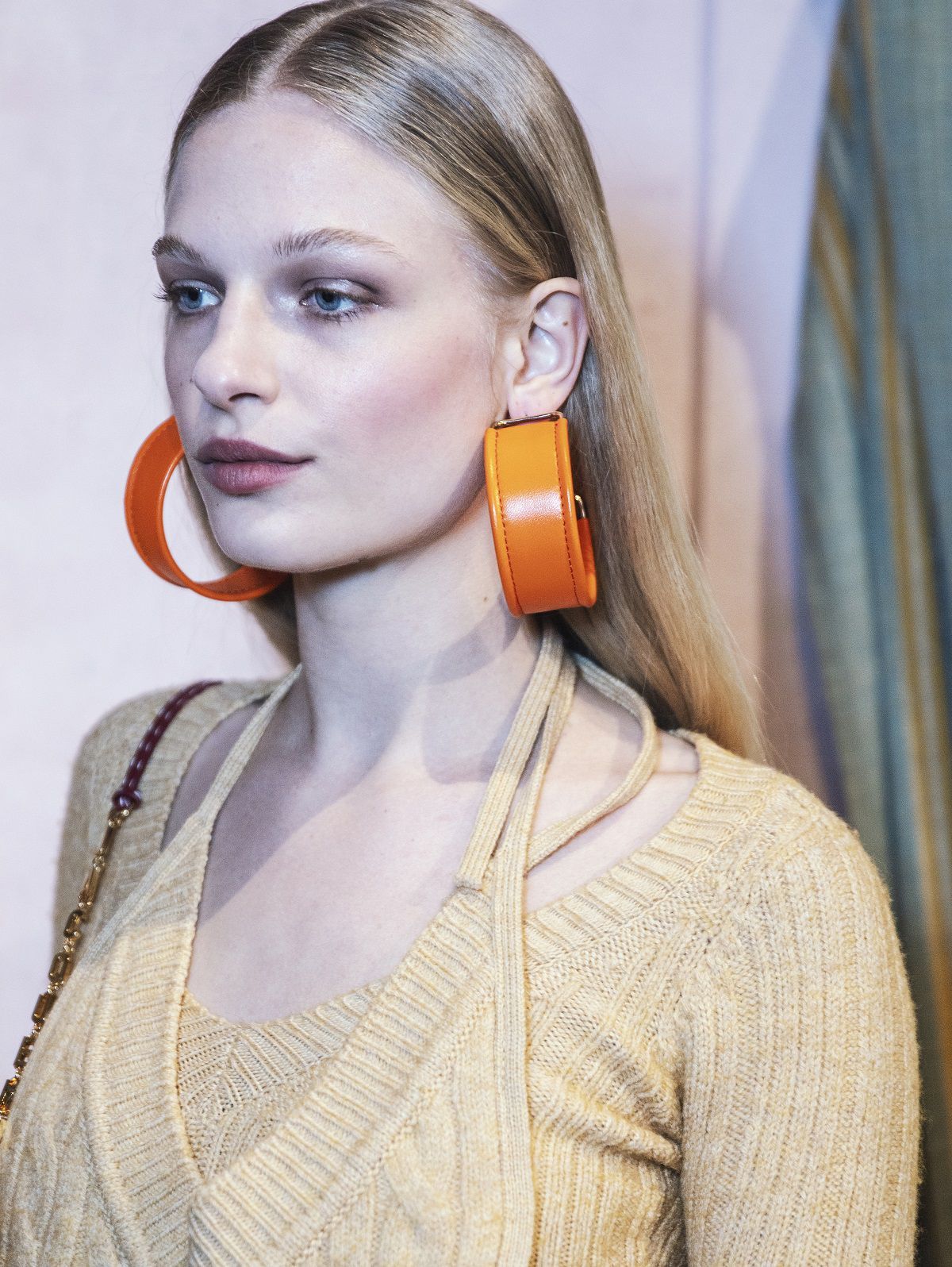 A completare il look scarpe a punta, ampi cuissardes con suola in gomma, orecchini a cerchio colorati, un hairstyle semplice e ordinato e un beauty naturale, labbra pesca, blush rosa sulle gote e ombretti caldi.