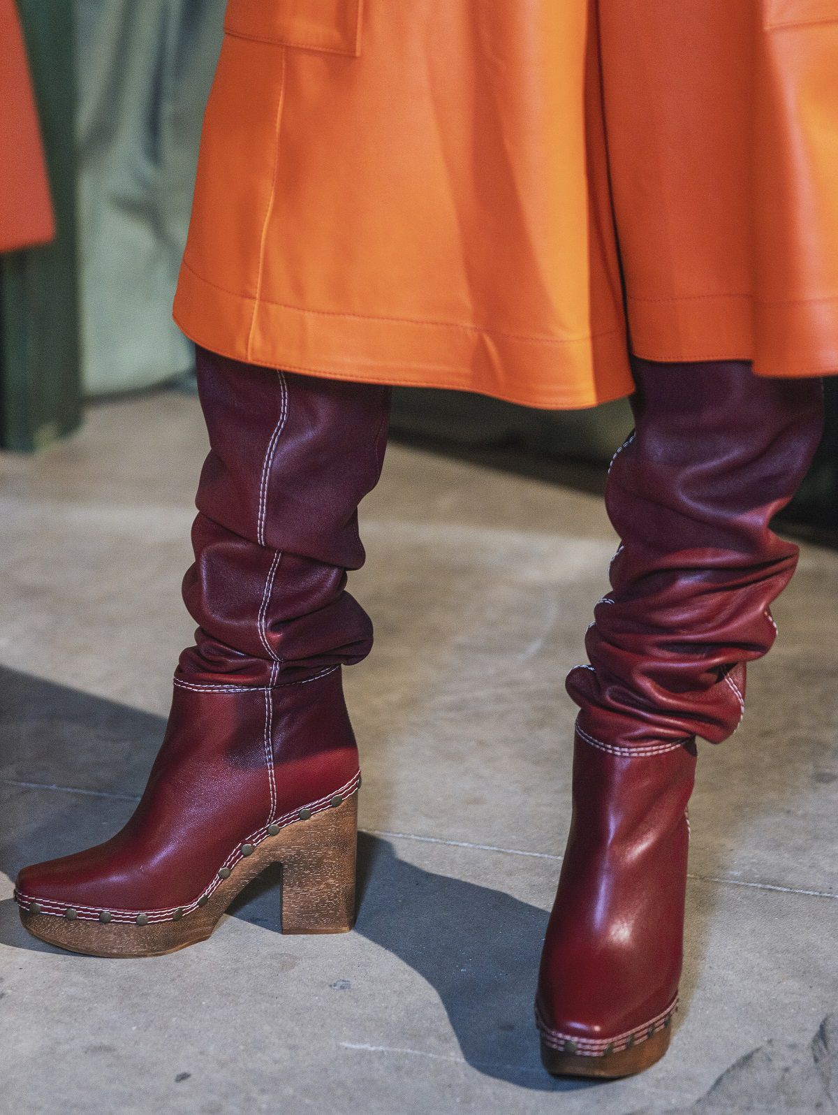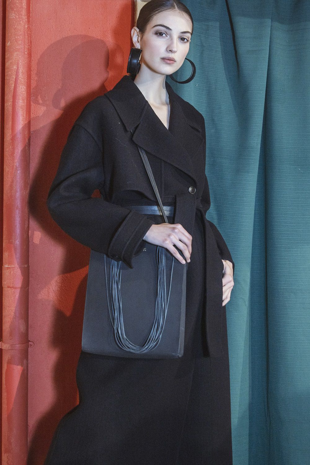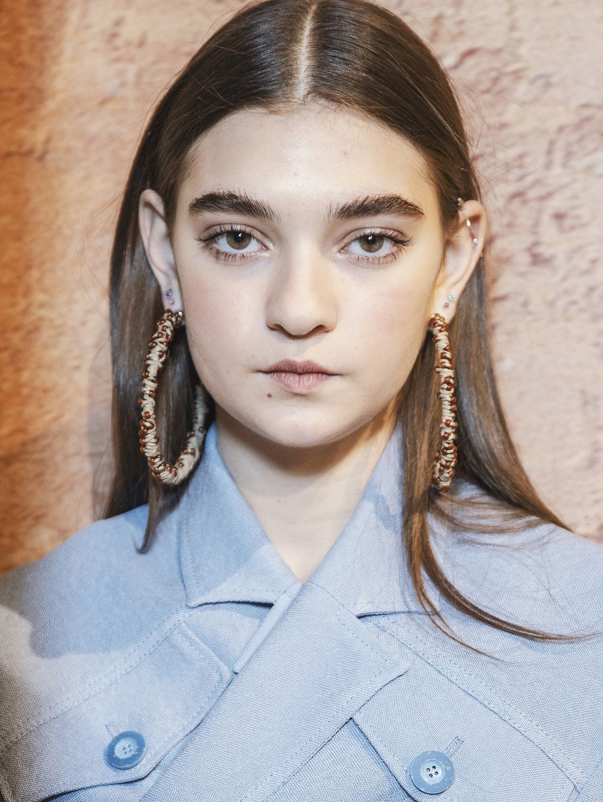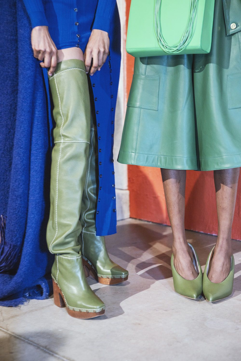 A completare il look scarpe a punta, ampi cuissardes con suola in gomma, orecchini a cerchio colorati, un hairstyle semplice e ordinato e un beauty naturale, labbra pesca, blush rosa sulle gote e ombretti caldi.