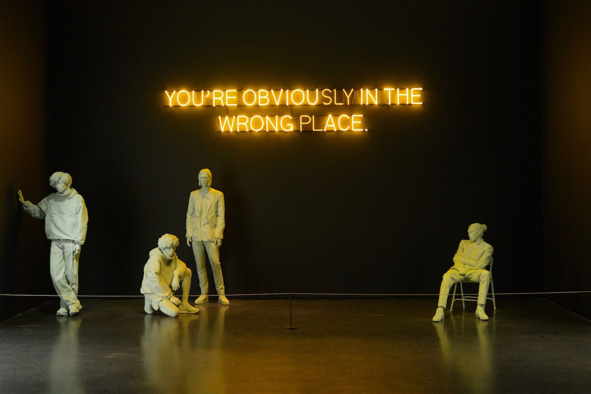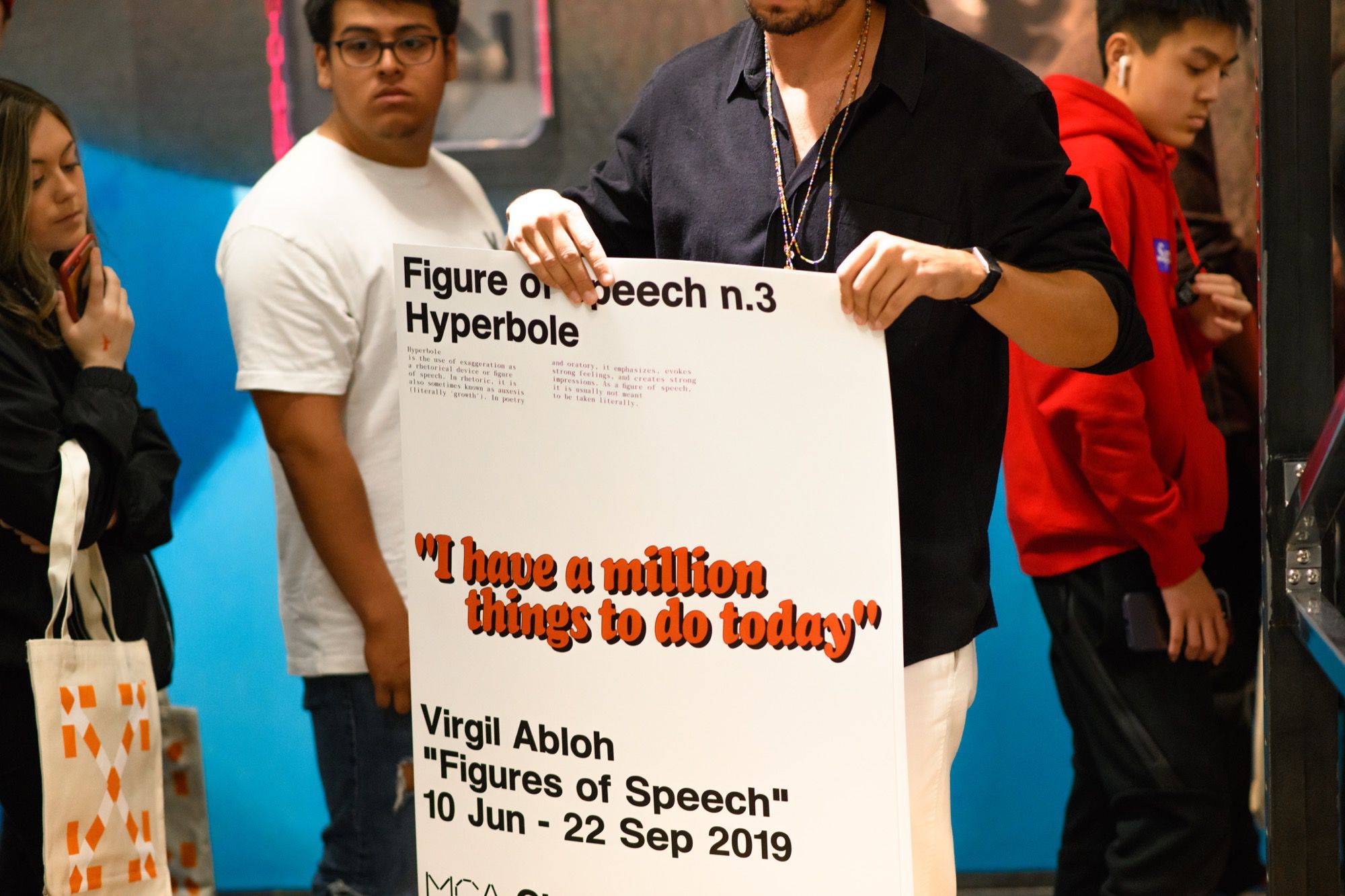 In larga parte 'Figures of Speech' è una retrospettiva fortemente connessa con il mondo della pubblicità e dell'idea di immagine proiettata. Ogni volta che un'idea colpisce una superficie, una foto stampata, uno schermo, un cartellone pubblicitario o una tela, sembra diventare un fatto. Questa mostra mette in luce la mia lotta con questo concetto, approfondito attraverso media diversi, mentre ricerco soluzioni personali. [...] Questo è il punto in cui il percorso dei turisti e quello dei puristi si incontrano. L'atmosfera è letterale e figurativa. Virgil Abloh