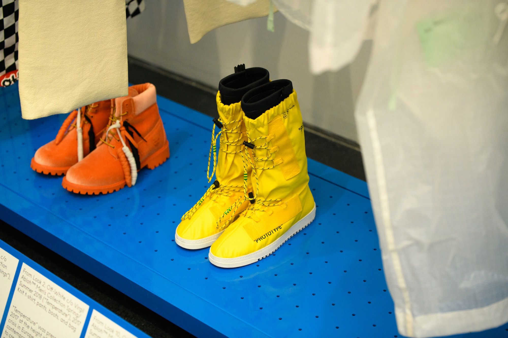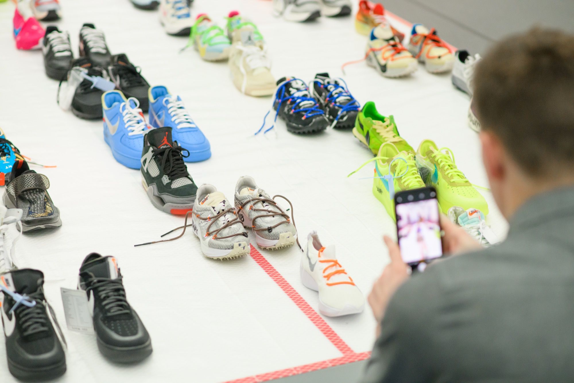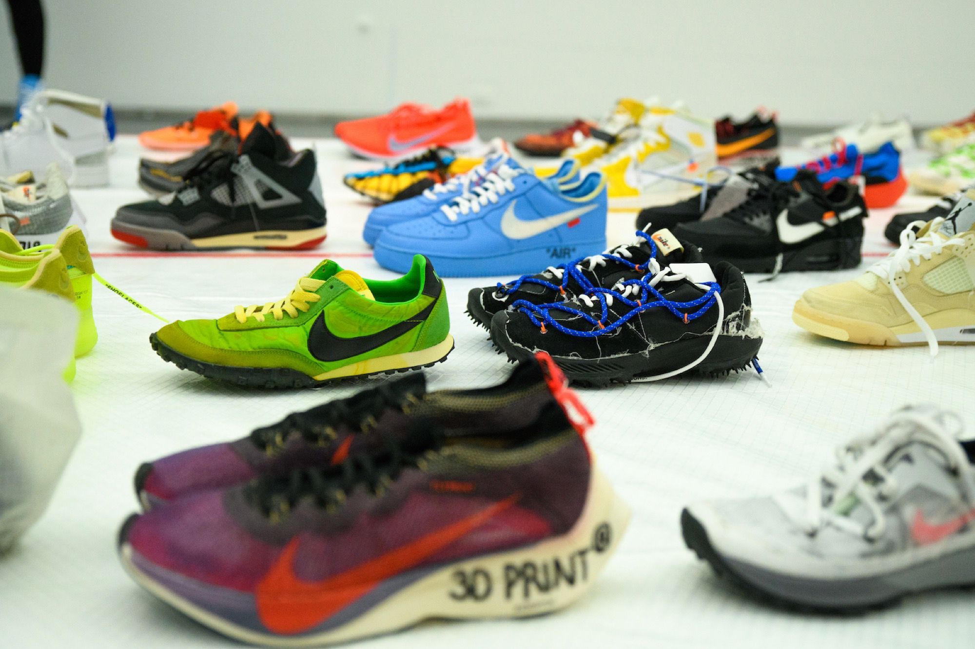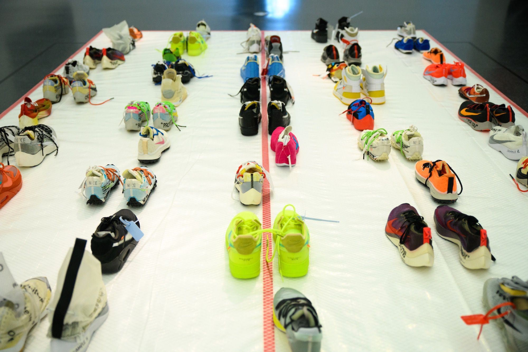 Proprio perché la sua figura è così multiforme la mostra raccoglie oggetti e opere d'arte molto diversi tra loro. Ci sono stampe e quadri che raffigurano le ultime campagne pubblicitarie di Louis Vuitton, vere e proprie installazioni, gli oggetti d'arredo disegnati insieme ad IKEA, la consolle creata per l'occasione con Pioneer DJ, una boxlogo di Supreme mai vista prima, e poi non potevano mancare gli abiti, dal suo primo brand, Pyrex, fino alle ultime creazioni per Louis Vuitton e Off-White. Ma quello che finora ha raccolto la maggior attenzione dei visitatori - in particolare dei fan più giovani di Abloh - è la stanza che ospita le sneaker (tante, molte delle quali inedite) realizzate in collaborazione con Nike.