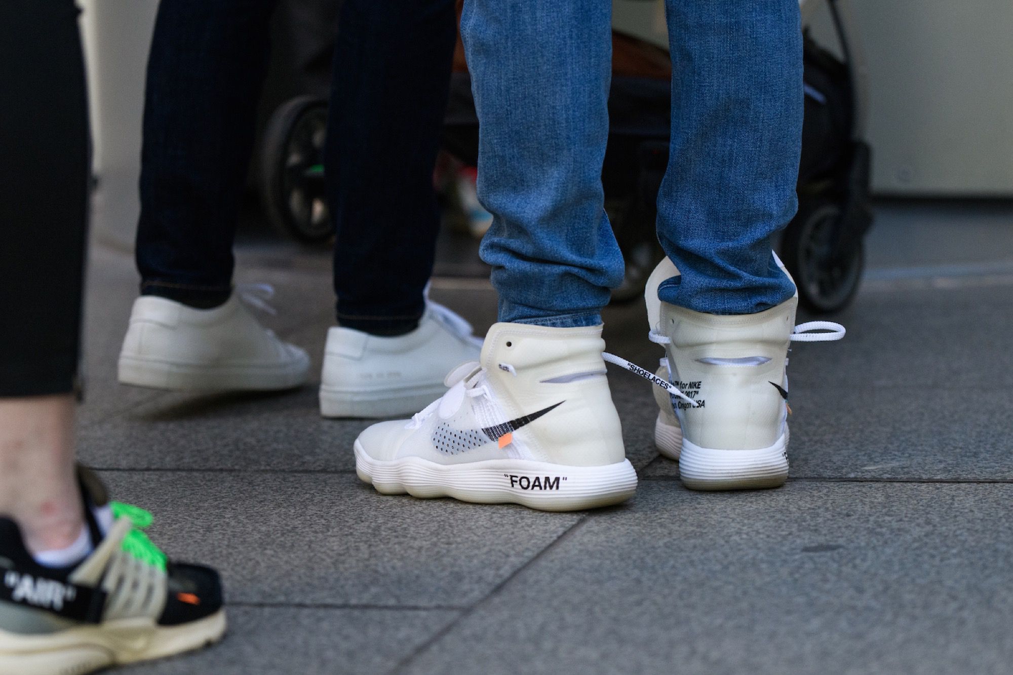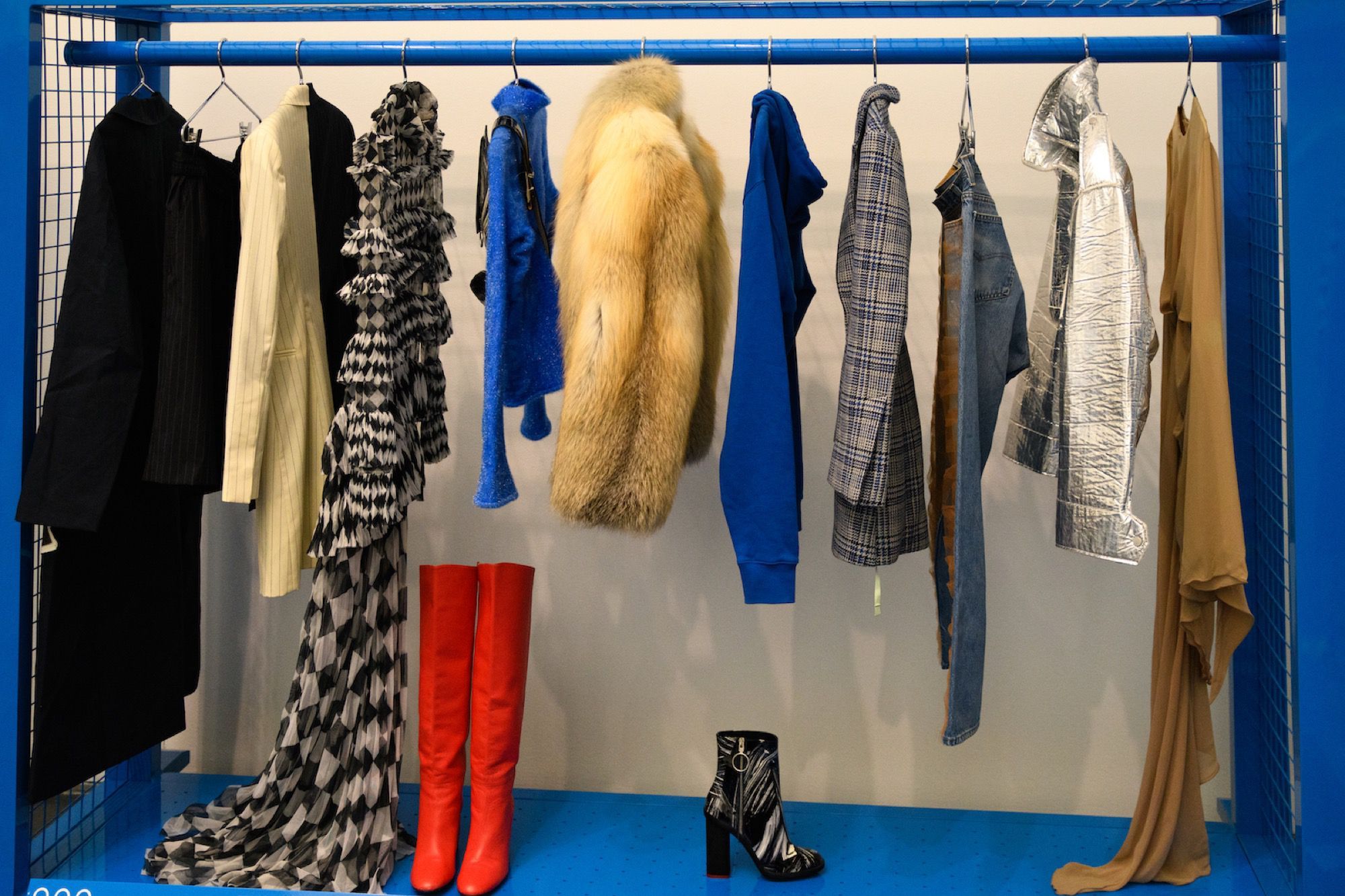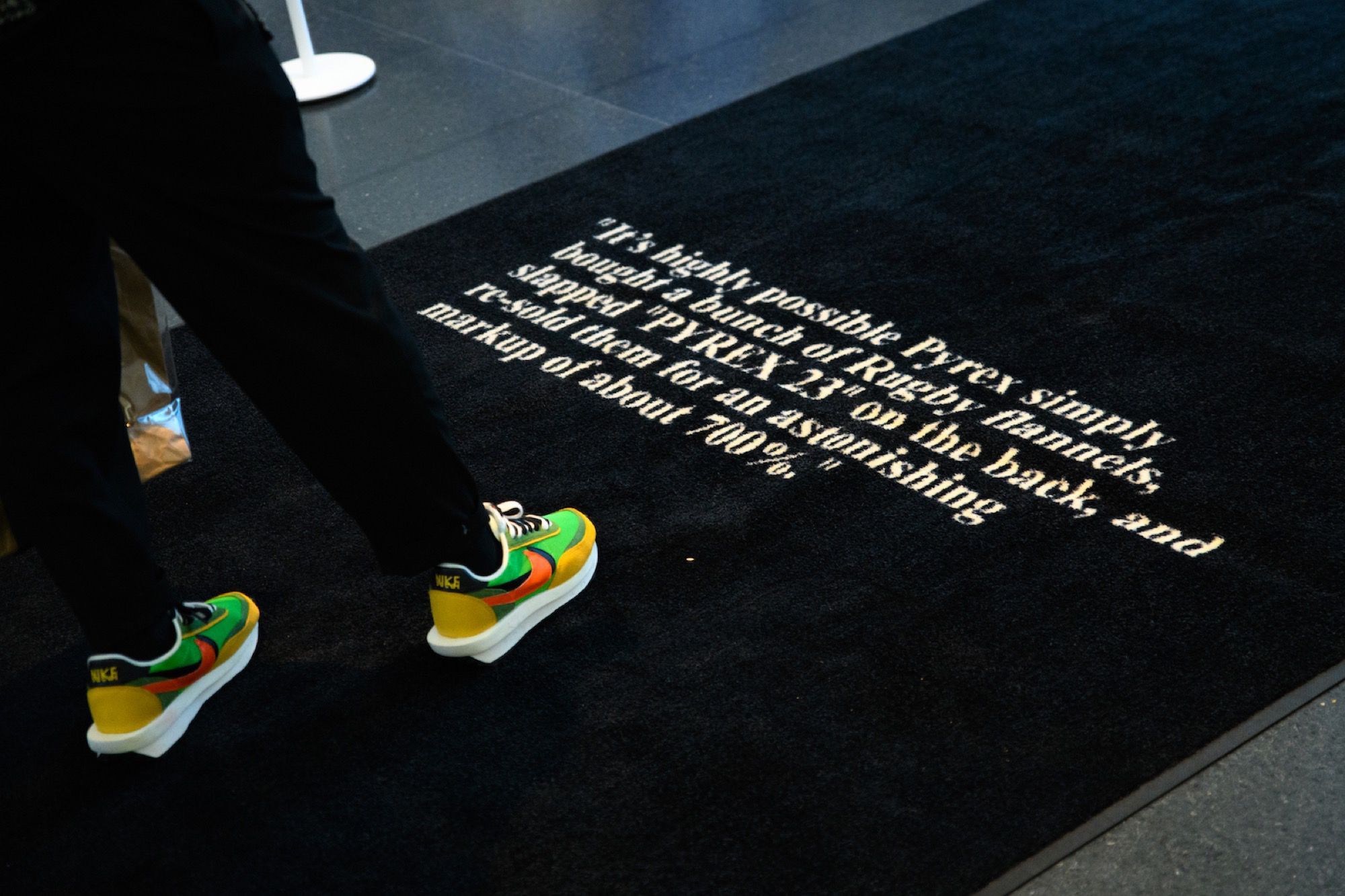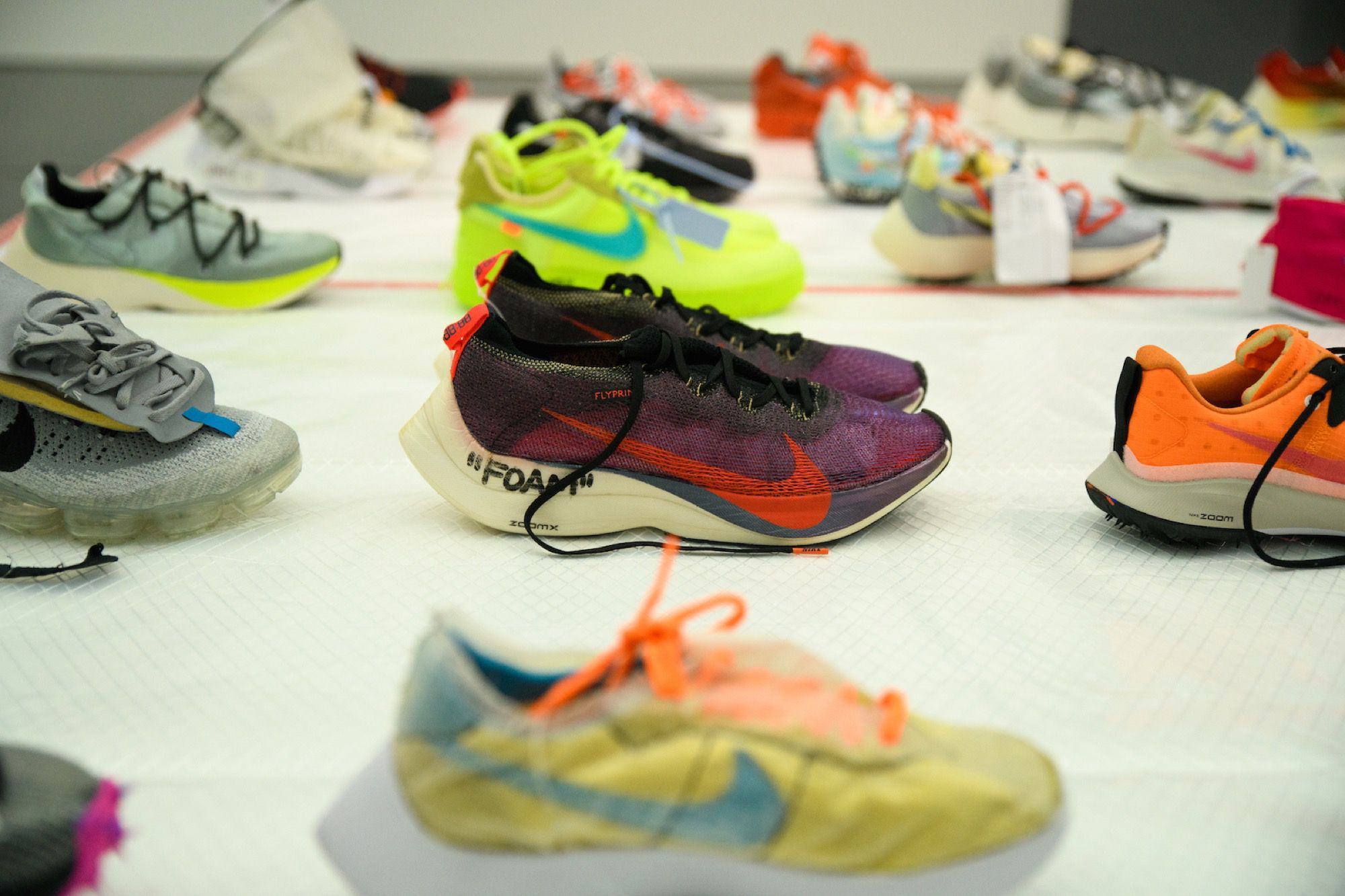 Proprio perché la sua figura è così multiforme la mostra raccoglie oggetti e opere d'arte molto diversi tra loro. Ci sono stampe e quadri che raffigurano le ultime campagne pubblicitarie di Louis Vuitton, vere e proprie installazioni, gli oggetti d'arredo disegnati insieme ad IKEA, la consolle creata per l'occasione con Pioneer DJ, una boxlogo di Supreme mai vista prima, e poi non potevano mancare gli abiti, dal suo primo brand, Pyrex, fino alle ultime creazioni per Louis Vuitton e Off-White. Ma quello che finora ha raccolto la maggior attenzione dei visitatori - in particolare dei fan più giovani di Abloh - è la stanza che ospita le sneaker (tante, molte delle quali inedite) realizzate in collaborazione con Nike.