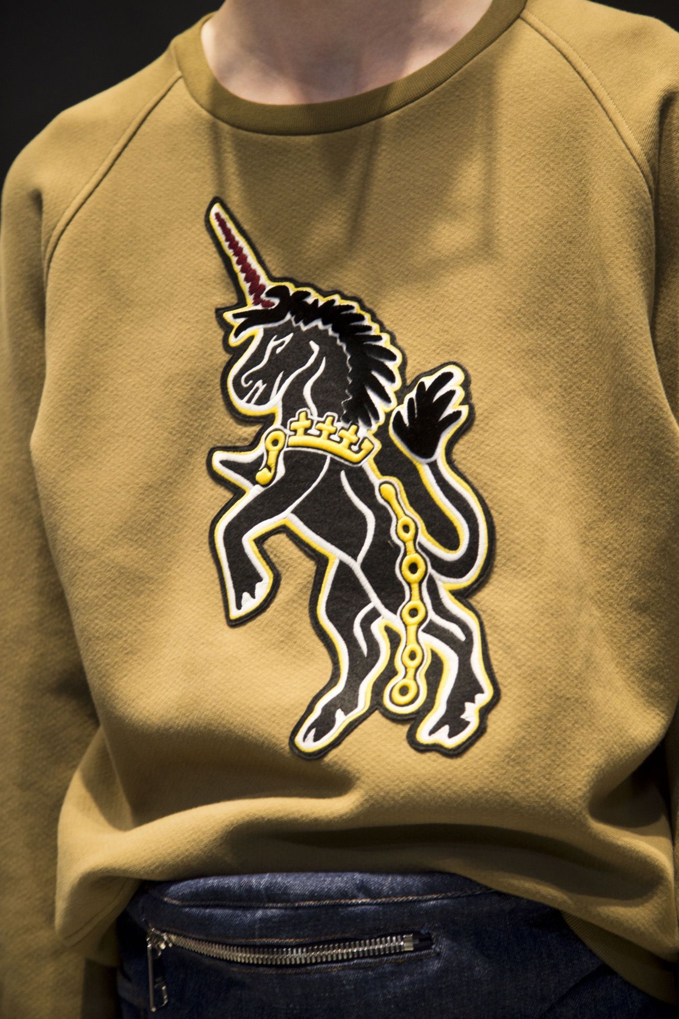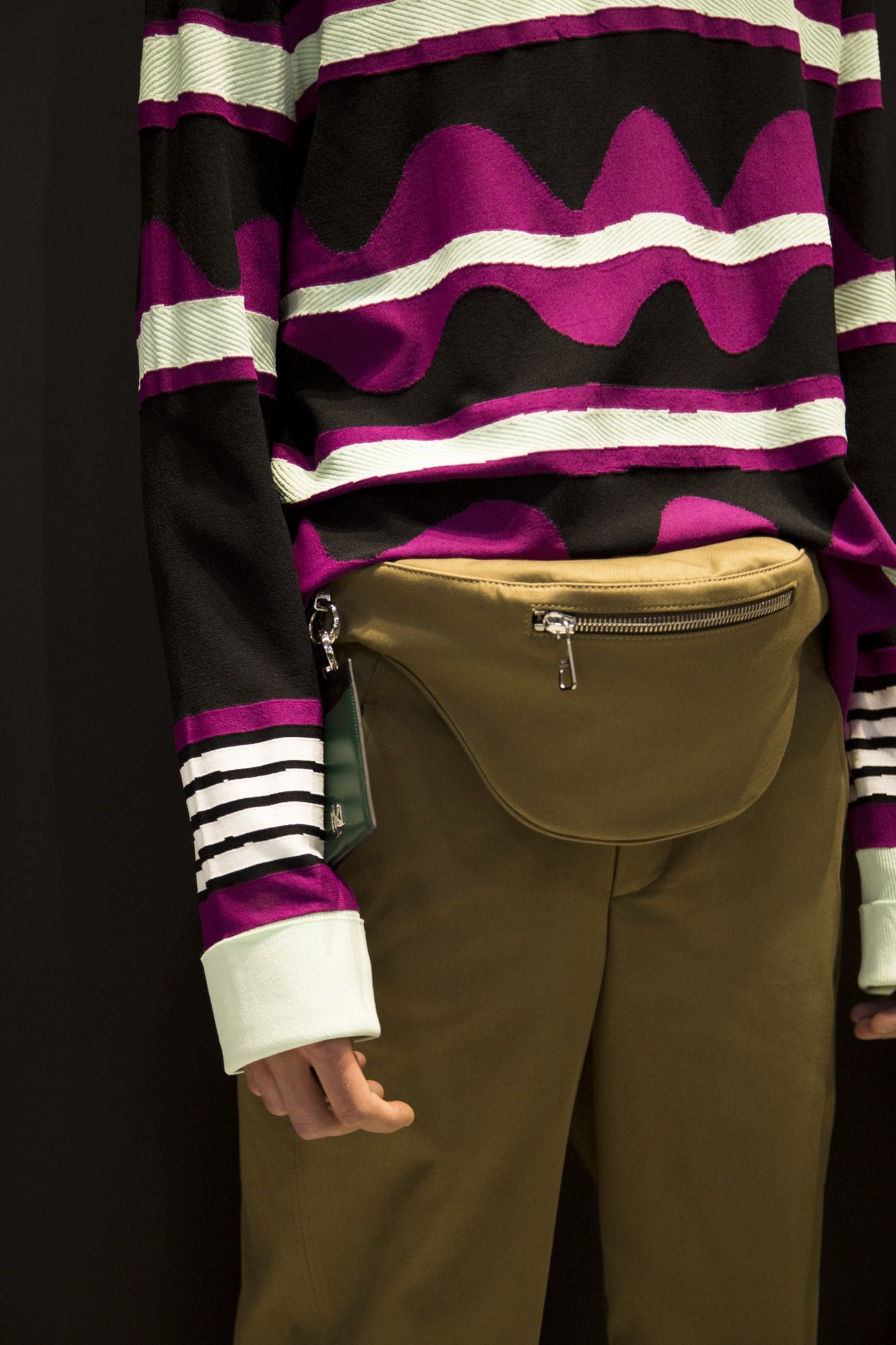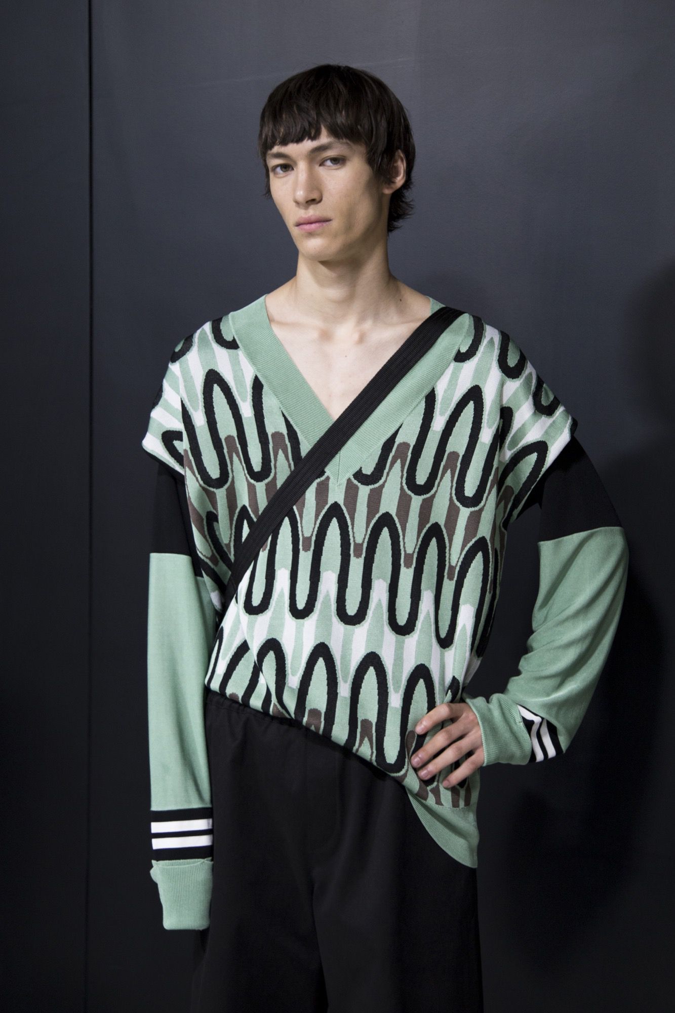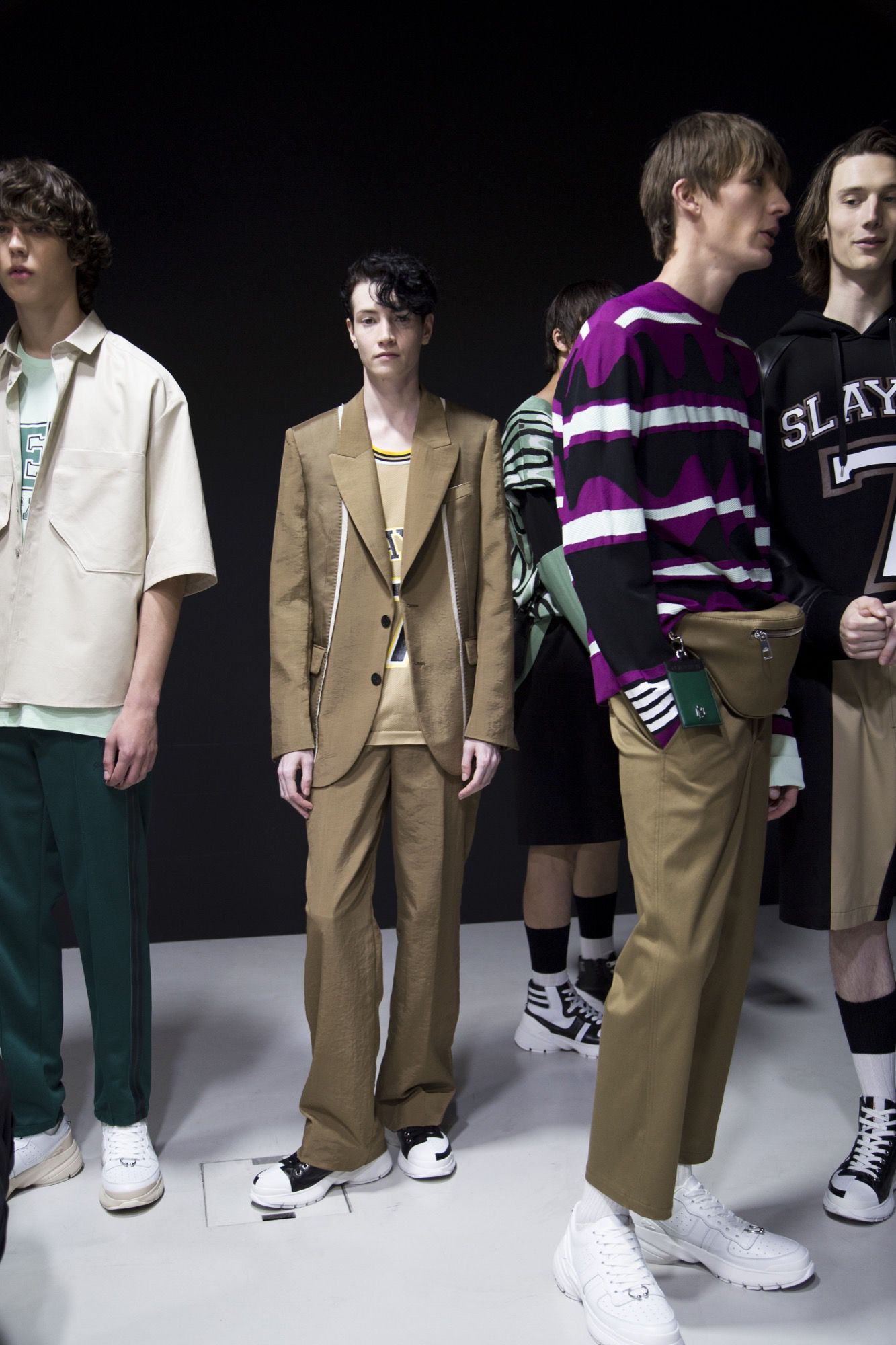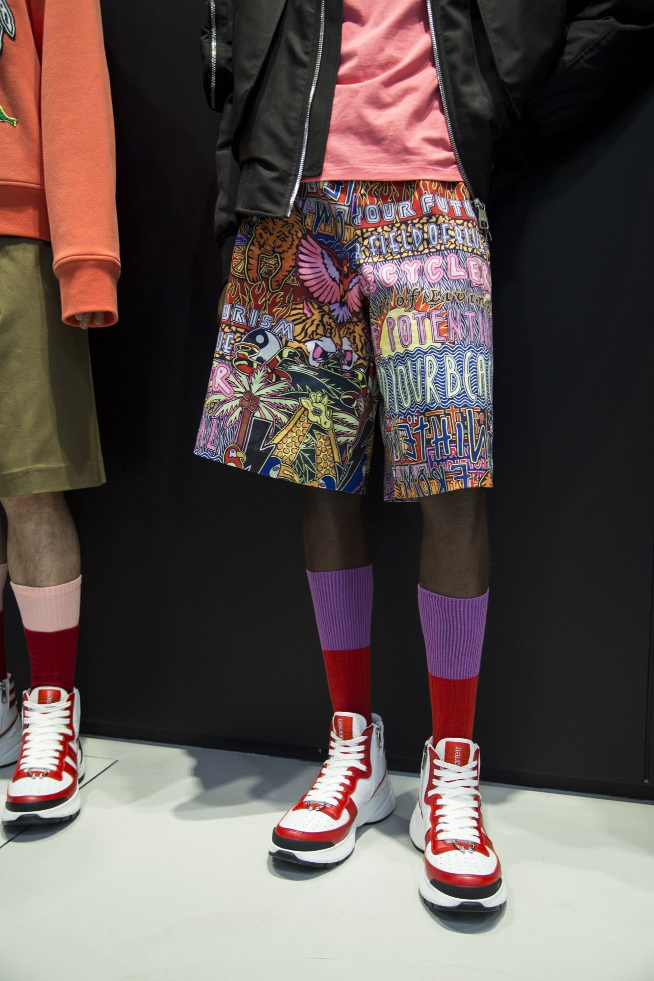 Per la collezione SS20 il designer inglese ha portato in passerella trench rivistati, varsity jacket, giacche sartoriali abbinate a short morbidi, camicie dal taglio perfetto decorate da grandi lettering e stampe colorate. La classicità e la tradizione si contrappongono e allo stesso tempo convivono con print e grafiche fluo, che caratterizzano non solo i capi, ma anche il setting della sfilata. Non mancano accessori come body bag con logo all over e sneaker di isprazione basket nei toni del bianco, del rosso e del blu.