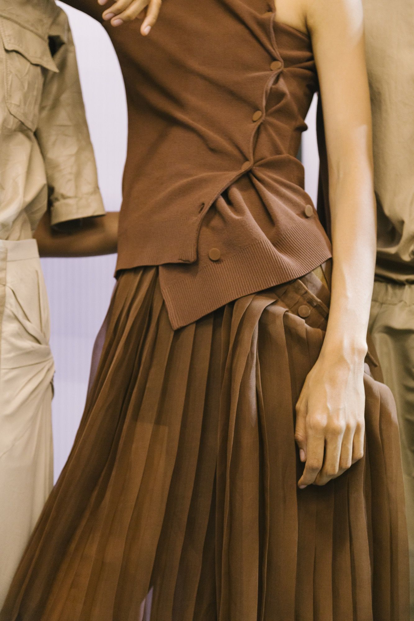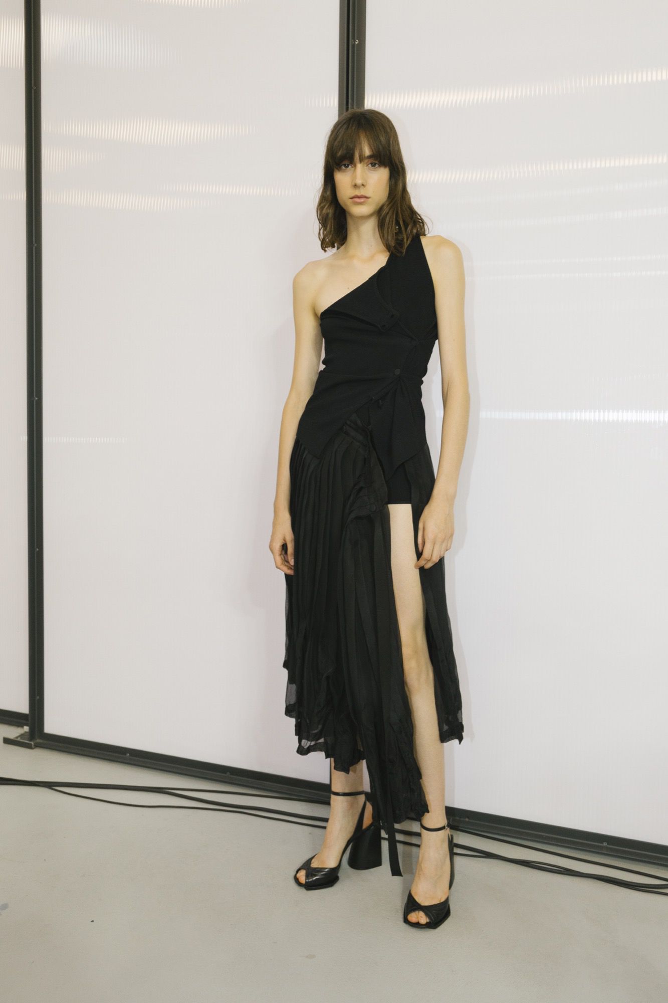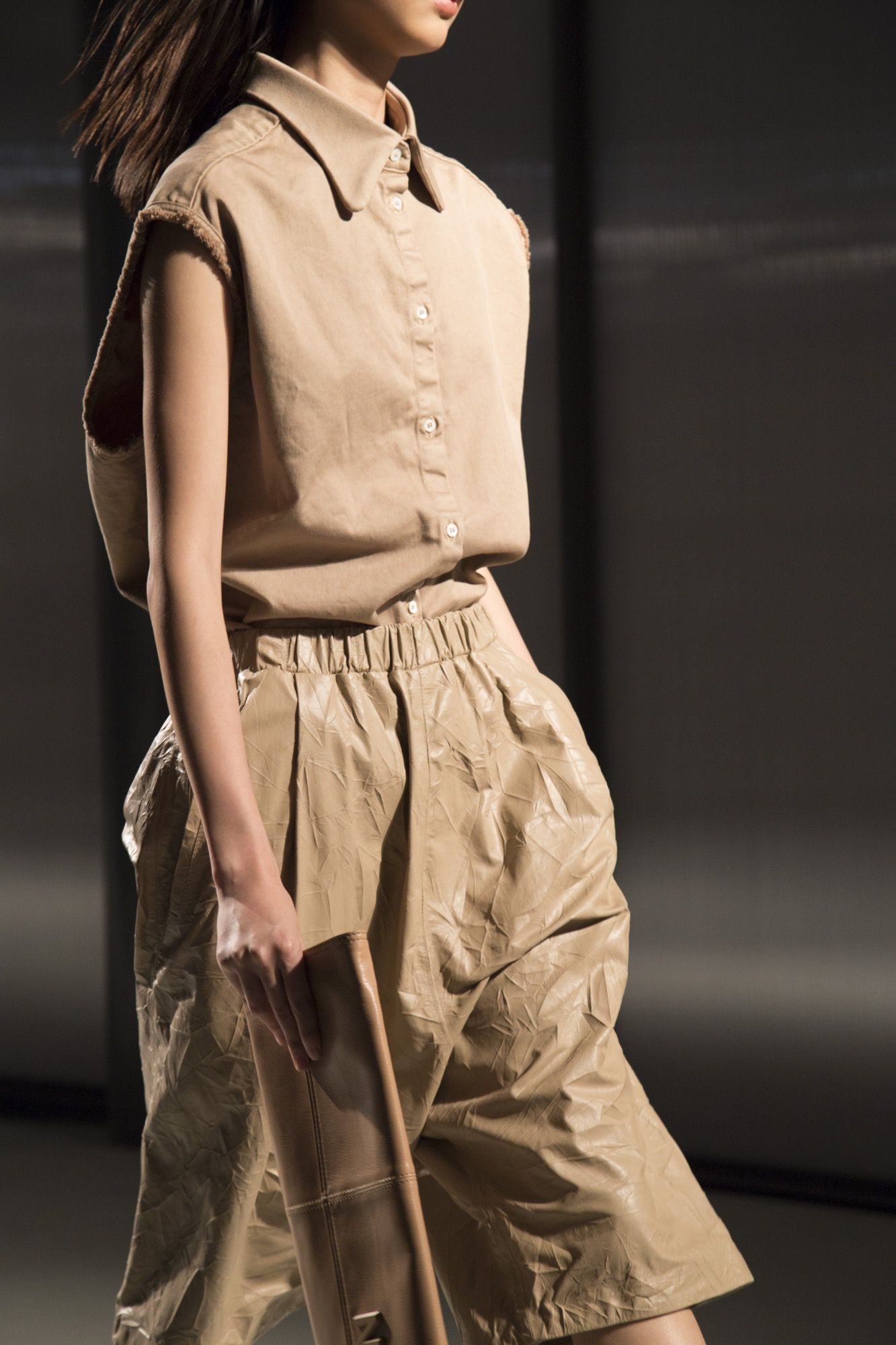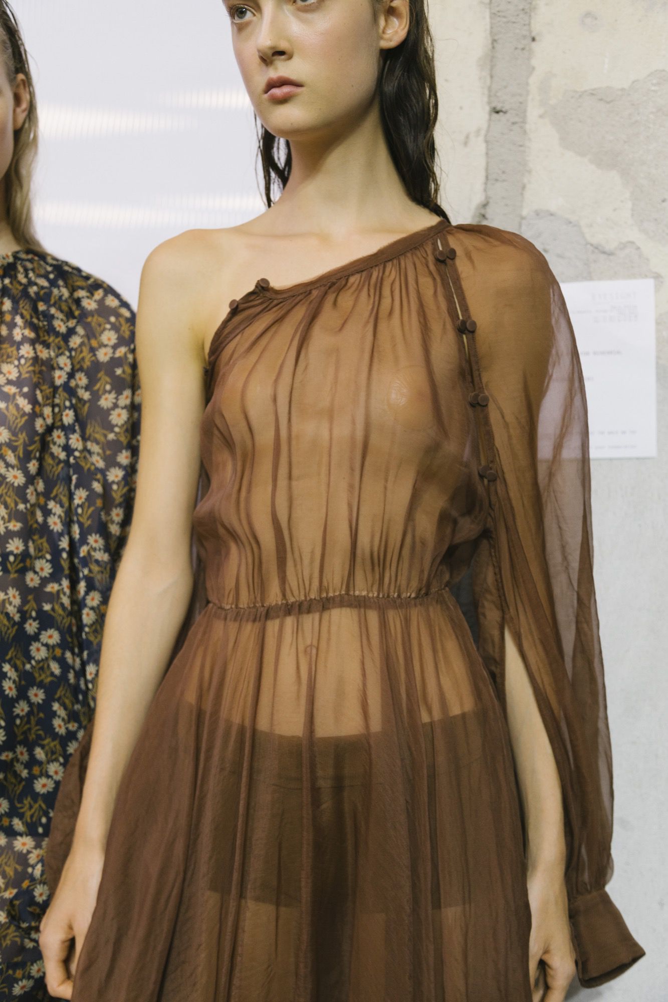 Per la collezione SS20, Alessandro Dell'Acqua di No.21 ha voluto giocare con le trasparenze, con tessuti leggeri che lasciano poco all'immaginazione, silhouette ultrafemminili e a tratti castigate contrapposte a tagli che scoprono la pelle. L'ispirazione sembra sia arrivata dalla leggendaria collezione dello scandalo di Yves Saint Laurent del 1971, di cui Dell'Acqua è un grande fan. Tagli asimmetrici, tulle, seta, stampe floreali e look monocromatici in toni neutri tratteggiano una donna delicata, leggiadra ma allo stesso tempo audace. Anche la proposta per l'uomo ha un tocco femminile e giocoso, incarnato perfettamente negli shorts in pelle portati con camicie trasparenti.