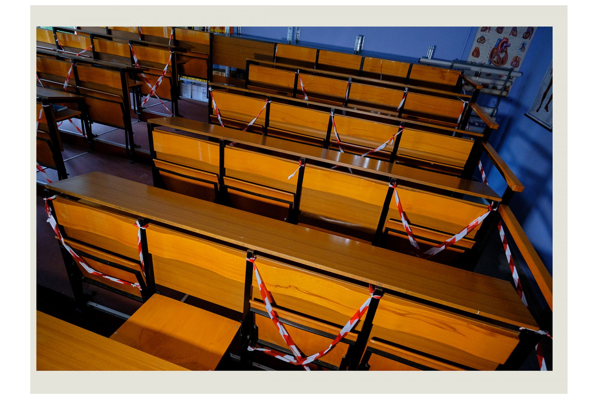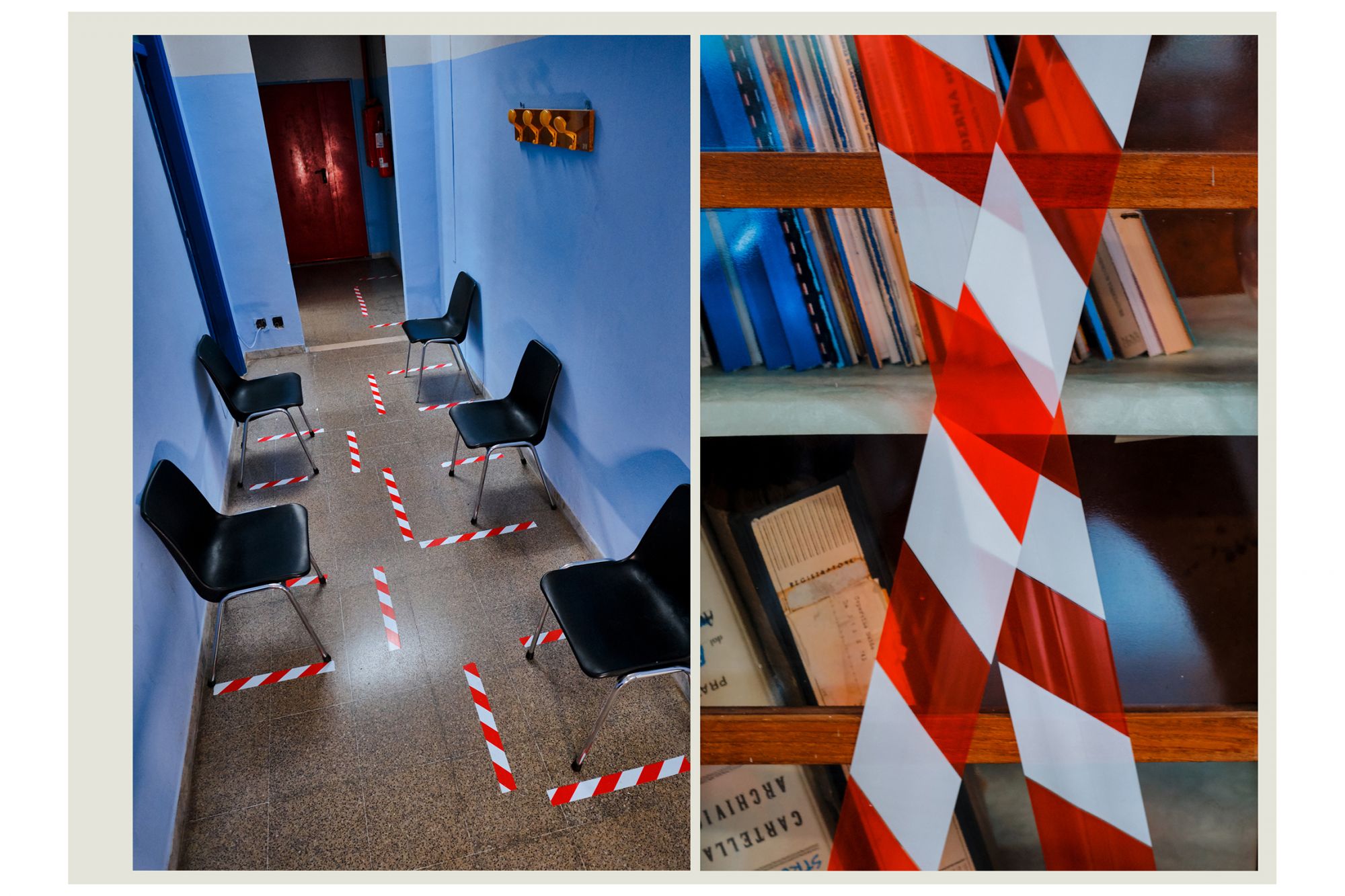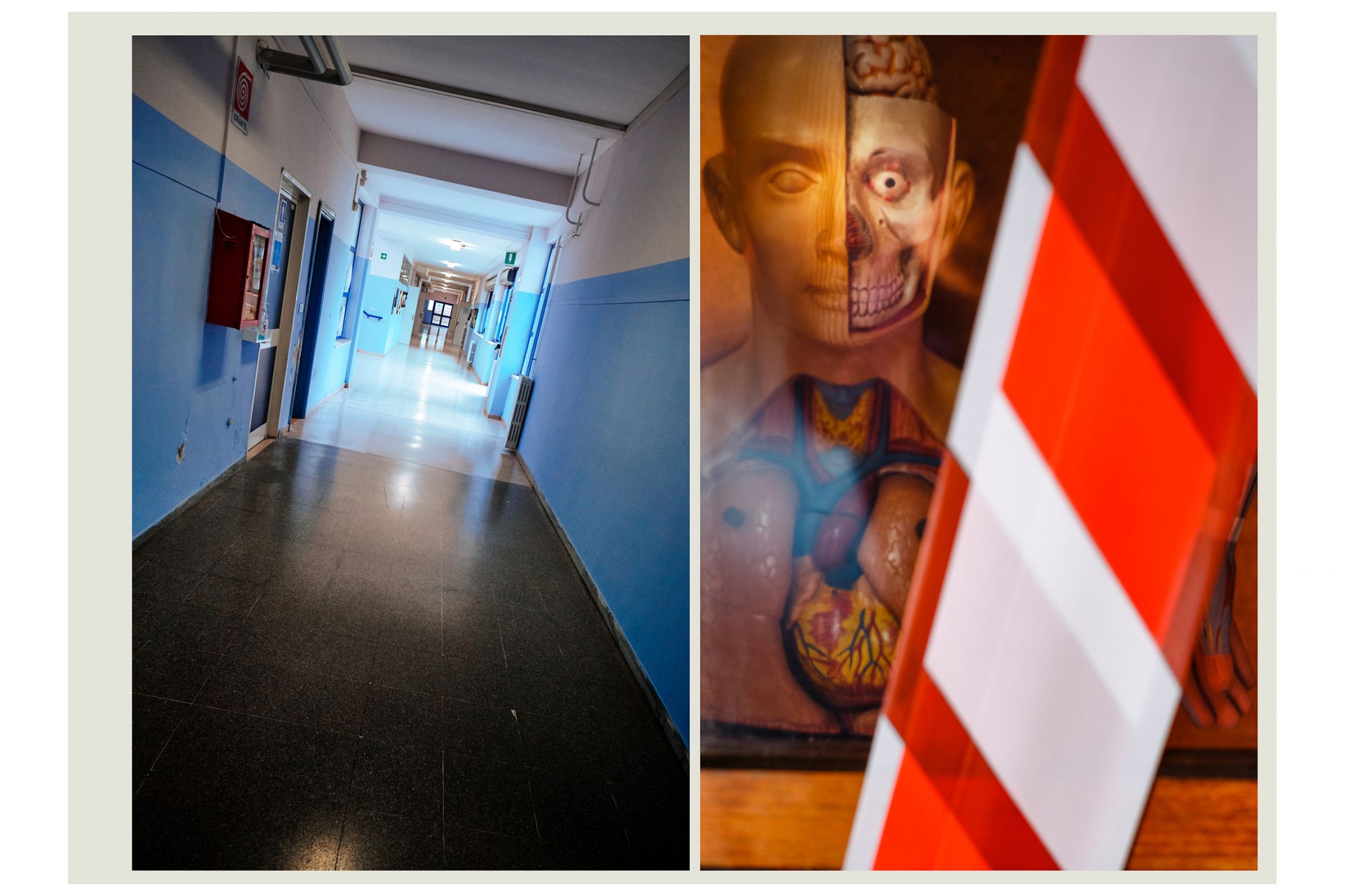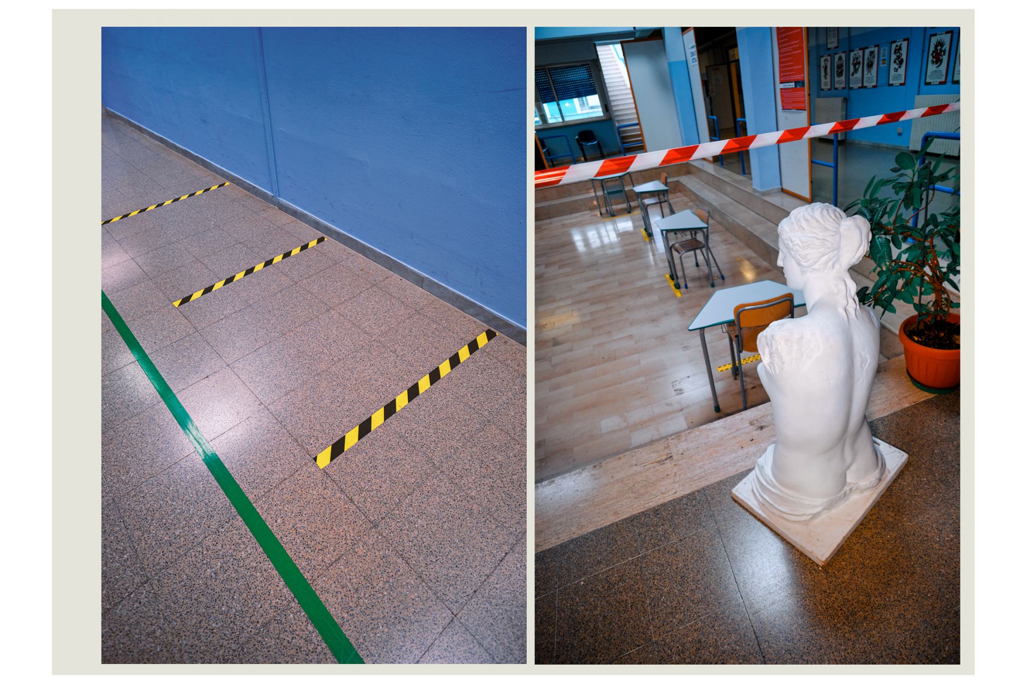 Nella storia dell’arte, fu Edward Hopper a raccontare la solitudine delle grandi metropoli con i suoi quadri, utilizzando in maniera rivoluzionaria lo spazio negativo per raccontare il silenzio e l’assenza. Un’operazione simile a quella compiuta da Luca Giorietto, fotografo della provincia di Roma che ha ritratto le aule e gli androni vuoti del Liceo Guglielmo Marconi di Colleferro, in provincia di Roma, per descrivere macroscopicamente il senso collettivo di inquietudine e confusione che l’Italia ha provato durante il lockdown attraverso una serie di dettagli microscopici: nastri biancorossi che delimitano brutalmente gli spazi prima accessibili, le distanze forzate, aule vuote in cui modelli anatomici e scheletri di plastica sembrano inquietanti memento mori e, da nessuna parte, la presenza umana. Ad accompagnare gli scatti, le parole della cantautrice e scrittrice Etna, nome d’arte di Alessandra Perna, che dice:
