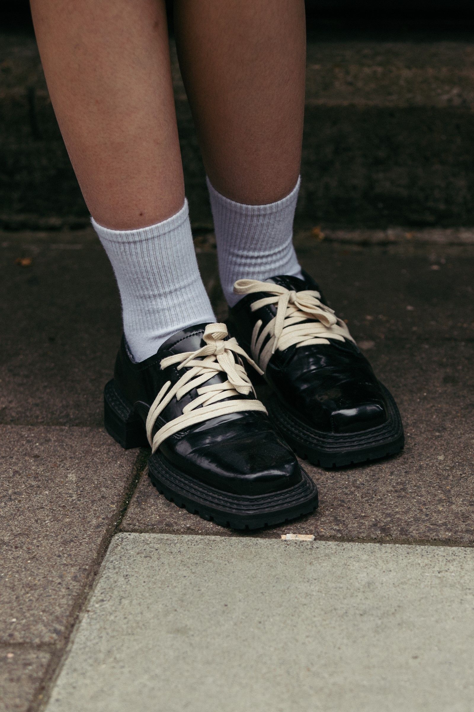 Con cosa si cammina alla London Fashion Week SS22? Le sneaker cedono il passo a puddle boots e tacchi