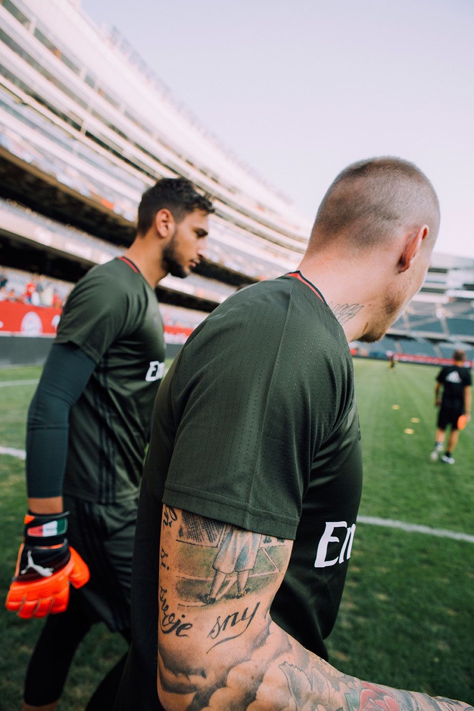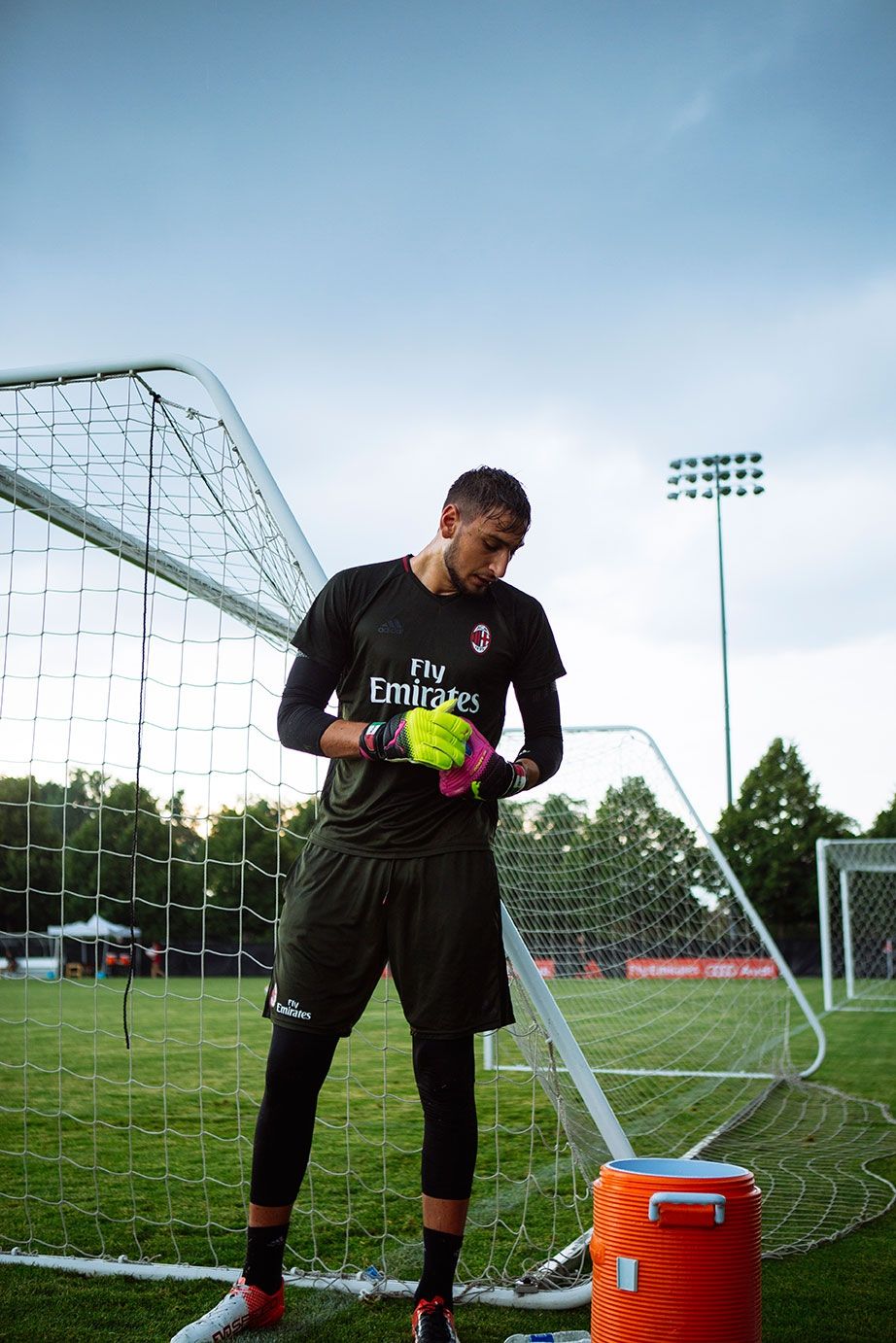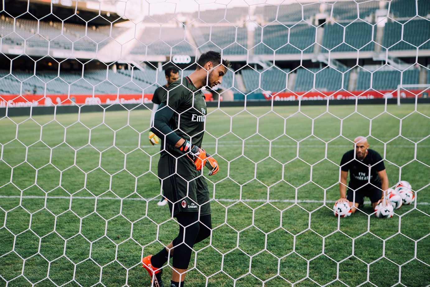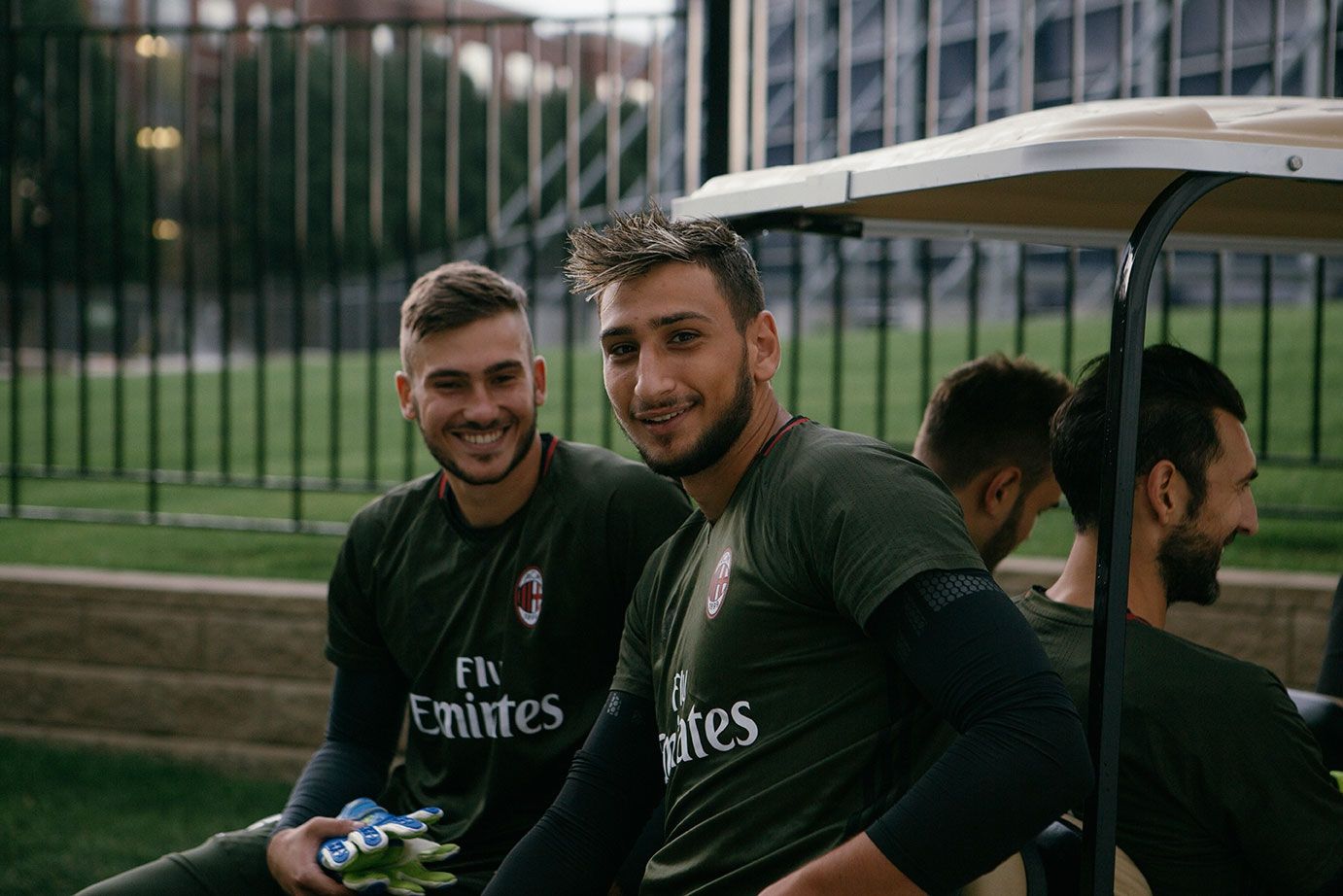Mi preparo molto presto e porto con me tanta voglia di scattare. Ecco che entrano in campo i giocatori in questa struttura appartenente ai Chicago Flames, un posto dove si incontrano Calcio, Baseball e Basketball, tutto perfettamente curato e ben organizzato, tipico della cultura americana. Dopo un breve warm up interno in palestra, escono i primi volti noti accompagnati in campo da delle vere e proprie GolfCar. Pochi ospiti fortunati hanno potuto assistere a questo primo allenamento, me compreso, che dopo un giro negli spogliatoi, per poter vedere da vicino gli attrezzi del mestiere di alcuni dei migliori giocatori del Milan, inizio a fare delle foto. Abate e Donnarumma mi dedicano un sorriso, man mano arrivano tutti, c’è ancora Menez. L’allenamento si divide tra portieri e resto della squadra, è prettamente fisico, tanta corsa e tanti scatti, qualche minuto di Torello. Riesco ad avvicinare i 4 portieri della squadra – Diego Lopez, Donnarumma, Gabriel, Livieri – e mi accorgo di quanto lavoro c’è dietro alla preparazione che il mister Magni gli fa fare.
