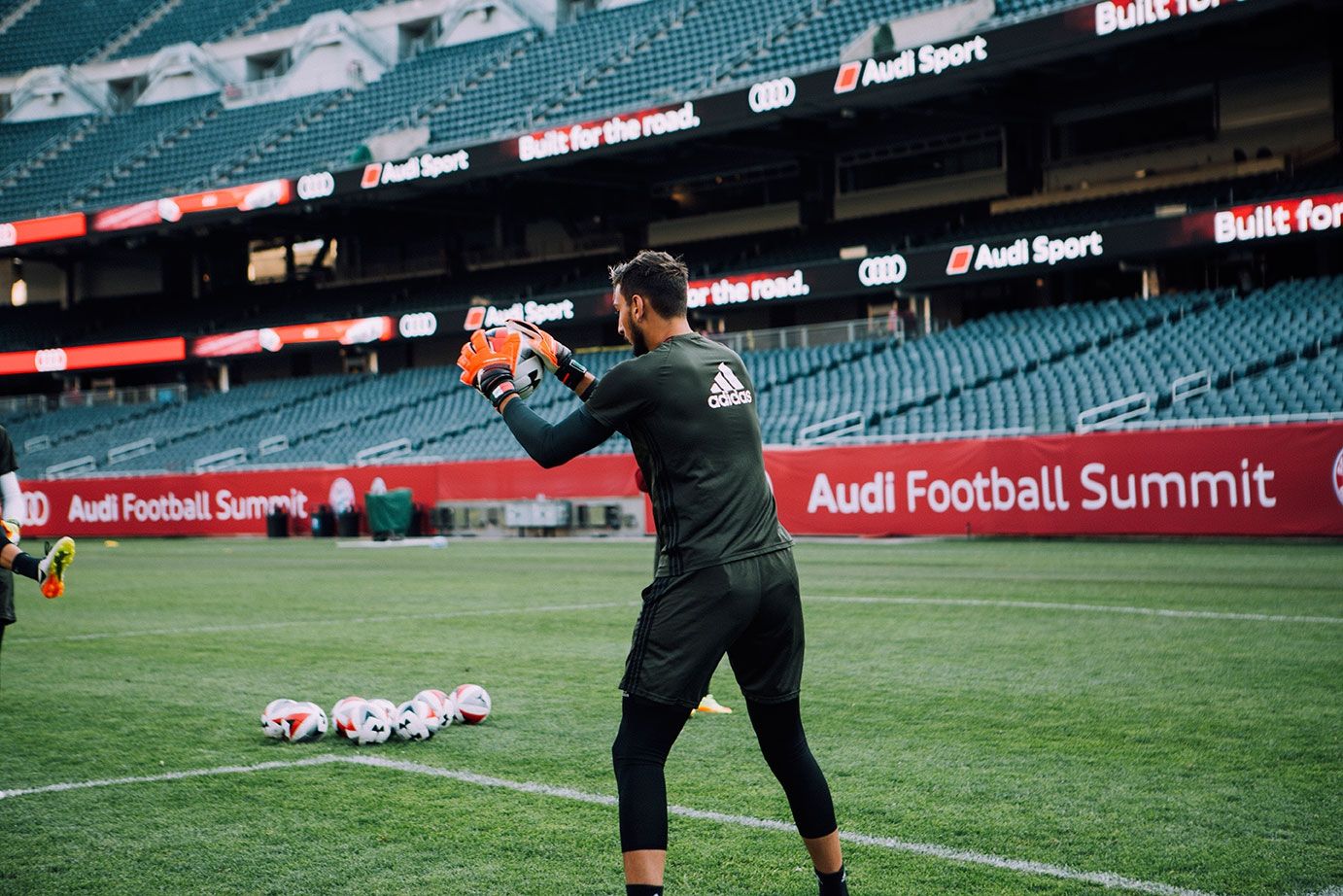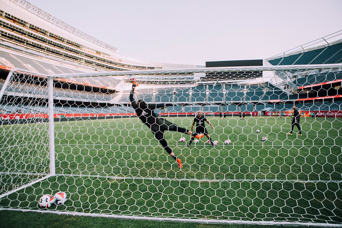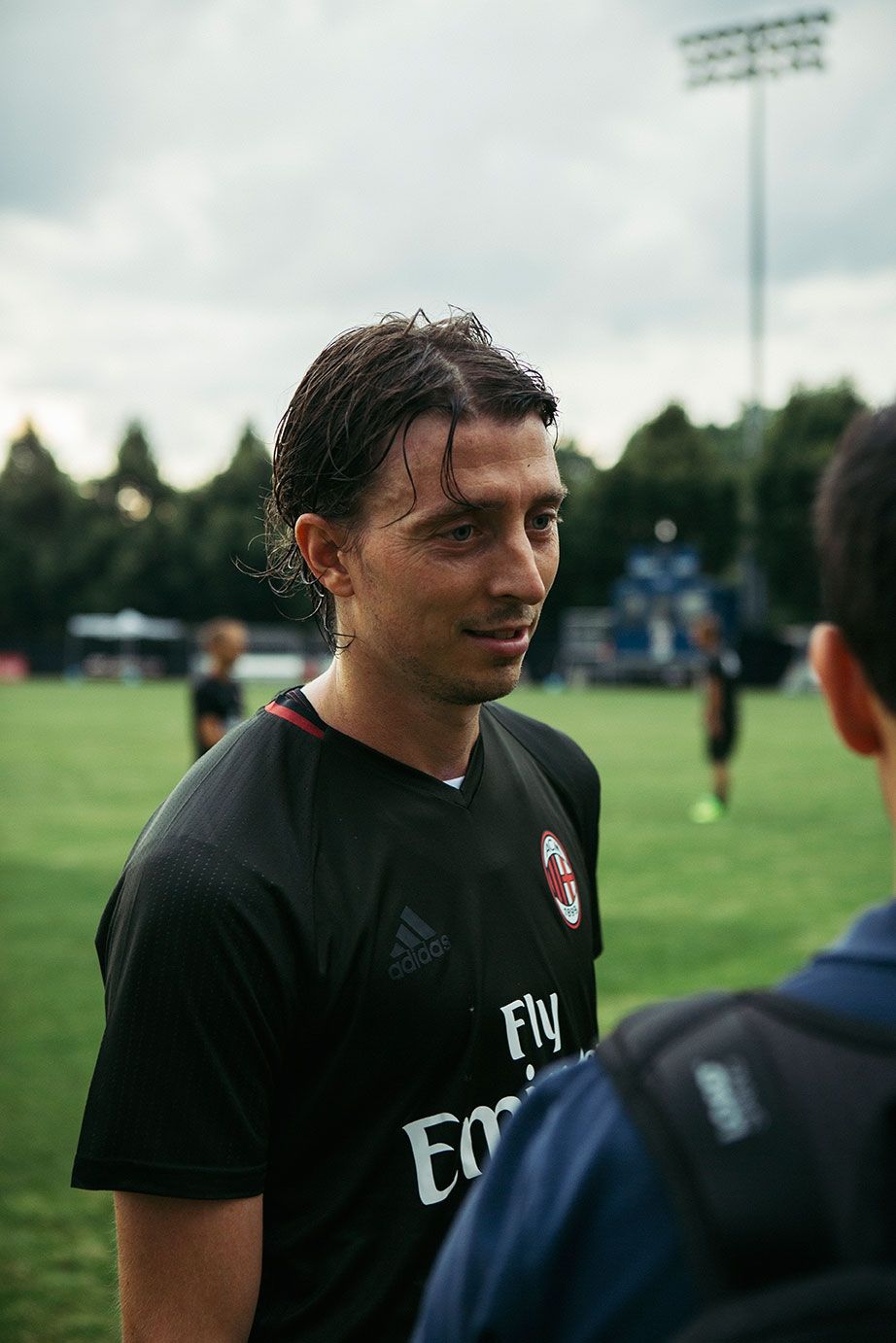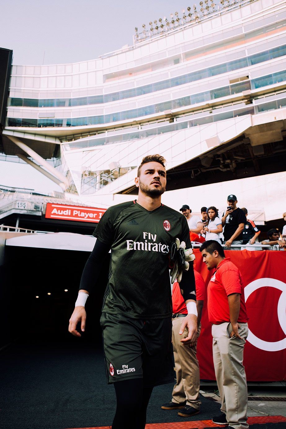 Mi preparo molto presto e porto con me tanta voglia di scattare. Ecco che entrano in campo i giocatori in questa struttura appartenente ai Chicago Flames, un posto dove si incontrano Calcio, Baseball e Basketball, tutto perfettamente curato e ben organizzato, tipico della cultura americana. Dopo un breve warm up interno in palestra, escono i primi volti noti accompagnati in campo da delle vere e proprie GolfCar. Pochi ospiti fortunati hanno potuto assistere a questo primo allenamento, me compreso, che dopo un giro negli spogliatoi, per poter vedere da vicino gli attrezzi del mestiere di alcuni dei migliori giocatori del Milan, inizio a fare delle foto. Abate e Donnarumma mi dedicano un sorriso, man mano arrivano tutti, c’è ancora Menez. L’allenamento si divide tra portieri e resto della squadra, è prettamente fisico, tanta corsa e tanti scatti, qualche minuto di Torello. Riesco ad avvicinare i 4 portieri della squadra – Diego Lopez, Donnarumma, Gabriel, Livieri – e mi accorgo di quanto lavoro c’è dietro alla preparazione che il mister Magni gli fa fare.